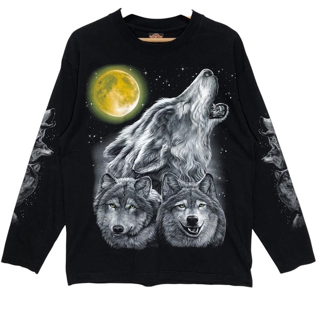 90~00's vintage 90~00年代 ヴィンテージ ROCK EAGLE 両面アニマルプリント アートTシャツ 狼 ウルフ 長袖 ロンT フロントバックプリント オーバーサイズ クルーネック Thailand製 42-44サイズ Lサイズ ブラック