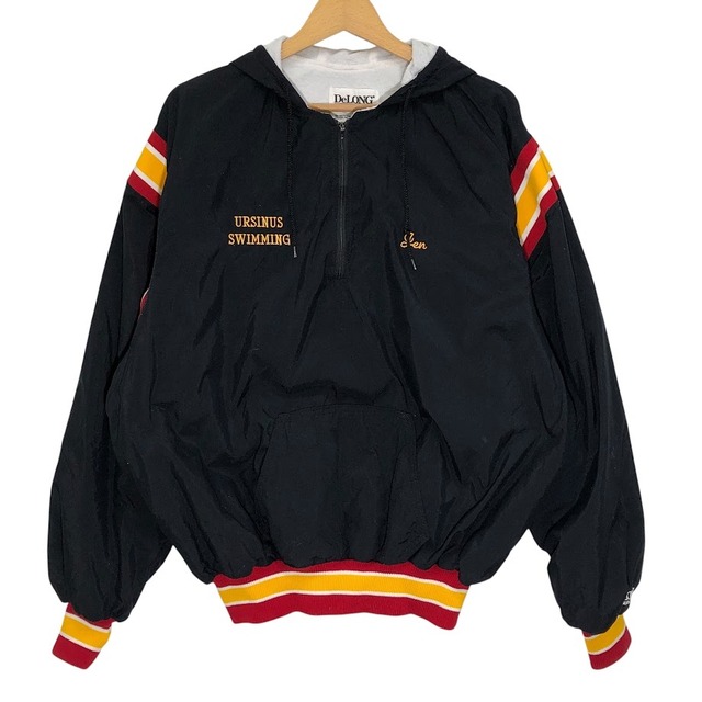 90's/90年代ヴィンテージ DELONG USA製 ハーフジップ アノラック フーディー プルオーバー バック刺繍 企業ロゴ刺繍 TALON ロケットタロンジップ USA製 メンズ XXL ブラック