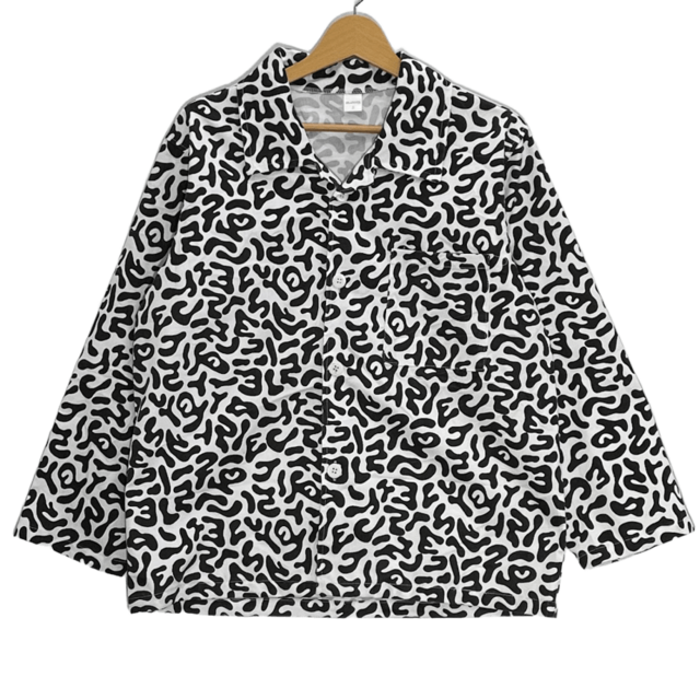 80~90's/80~90年代 ヴィンテージ 韓国軍 アーミー コリアン バクテリア柄 カモ アメーバ Army 総柄 ミリタリー シャツ 長袖 シャツ ボタンダウン フロントバックプリント メンズ ホワイト/ブラック