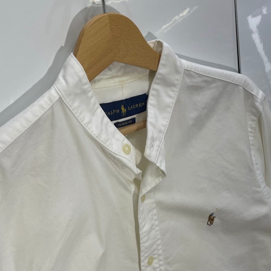 RALPH LAUREN ラルフローレン ノーカラーシャツ ポニー刺繡 長袖 シャツ ボタンダウン ワンポイント刺繡 オーバーサイズ ベトナム製 Mサイズ ホワイト | OASISCLOTHING 海外古着屋【公式】通販サイト