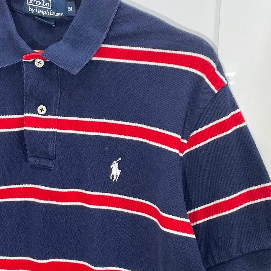 商品名:90'sPolo by Ralph Lauren/90年代 ポロバイラルフローレン ボーダー ポニー刺繡 半袖 ポロシャツ ワンポイント刺繡 オーバーサイズ ビッグシルエット CHINA製 メンズ M ネイビー/レッド