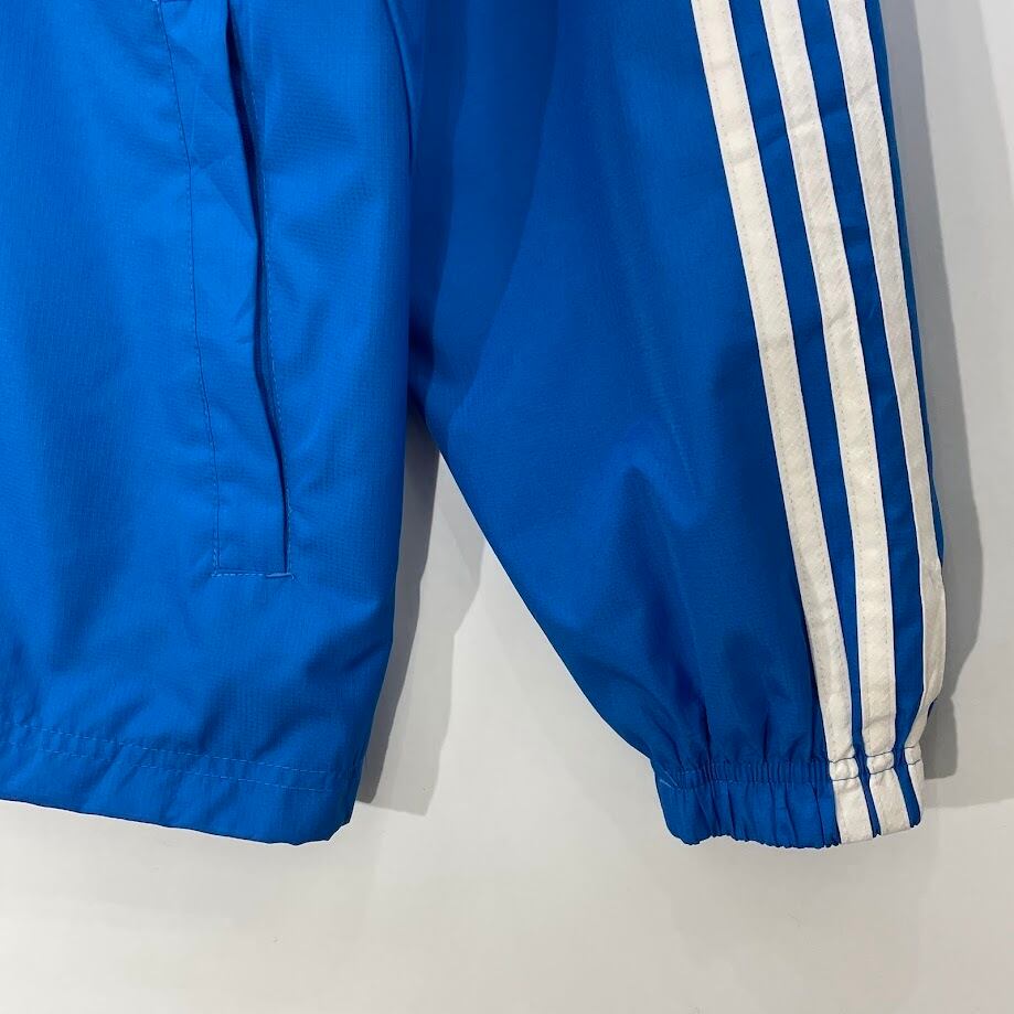 adidas アディダス フランスサッカークラブ ナイロンジャケット オリンピック マルセイユ DROIT AU BUT スリーライン フード ライトアウター ドローコード 企業ロゴプリント オーバーサイズ ビッグシルエット CHINA製 Lサイズ ブルー