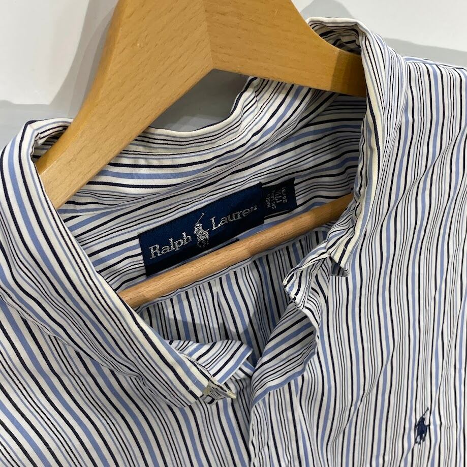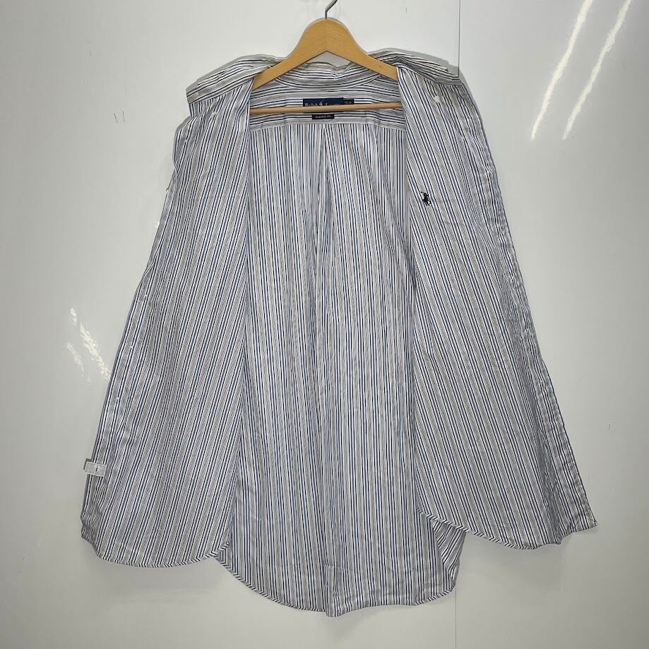 商品名:90's vintage 90年代 ヴィンテージ Ralph Lauren ラルフローレン CUSTOM FIT ストライプシャツ ポニー刺繍 シャツ ボタンダウン ワンポイント刺繡 オーバーサイズ スリランカ製 17 1/2サイズ ホワイト ブルー