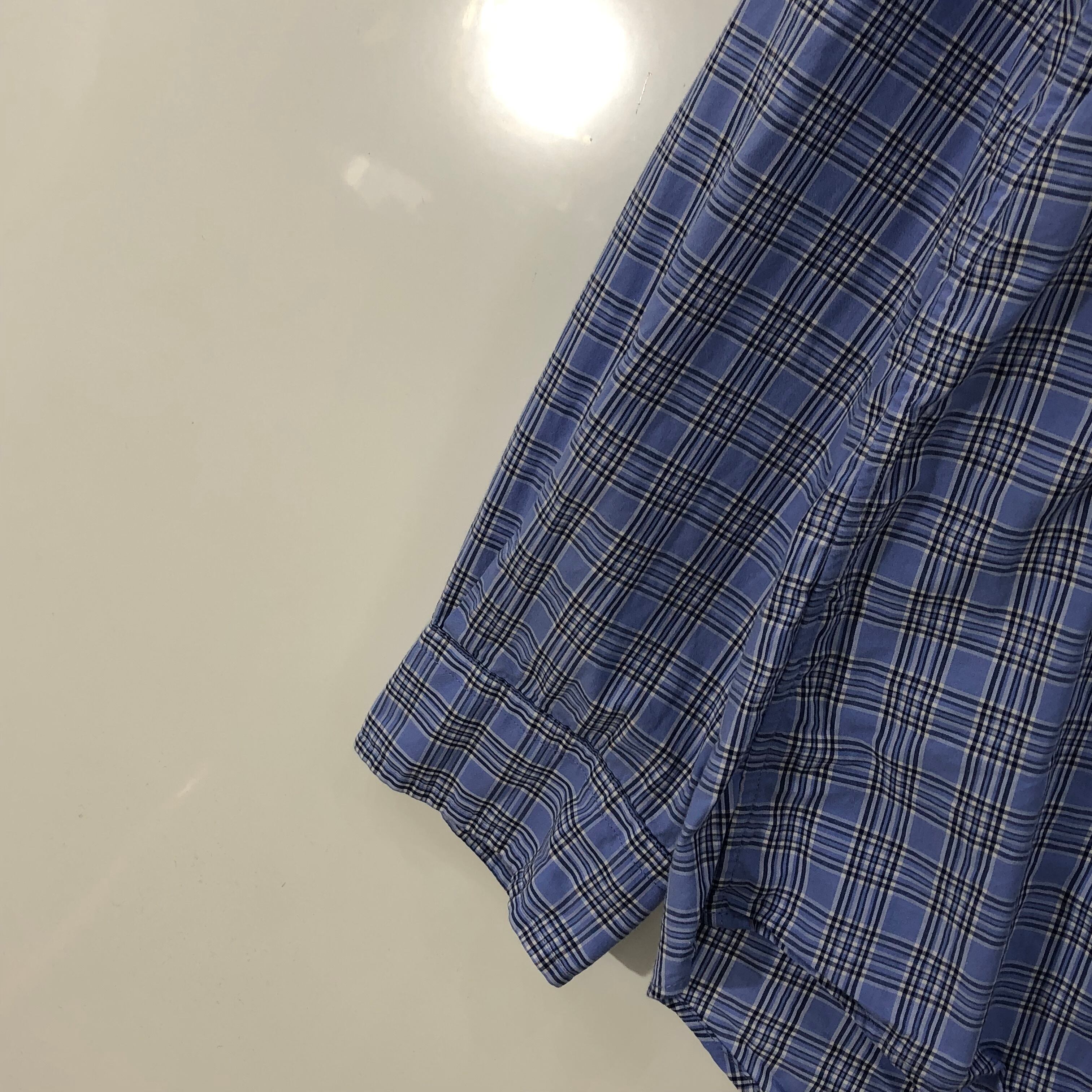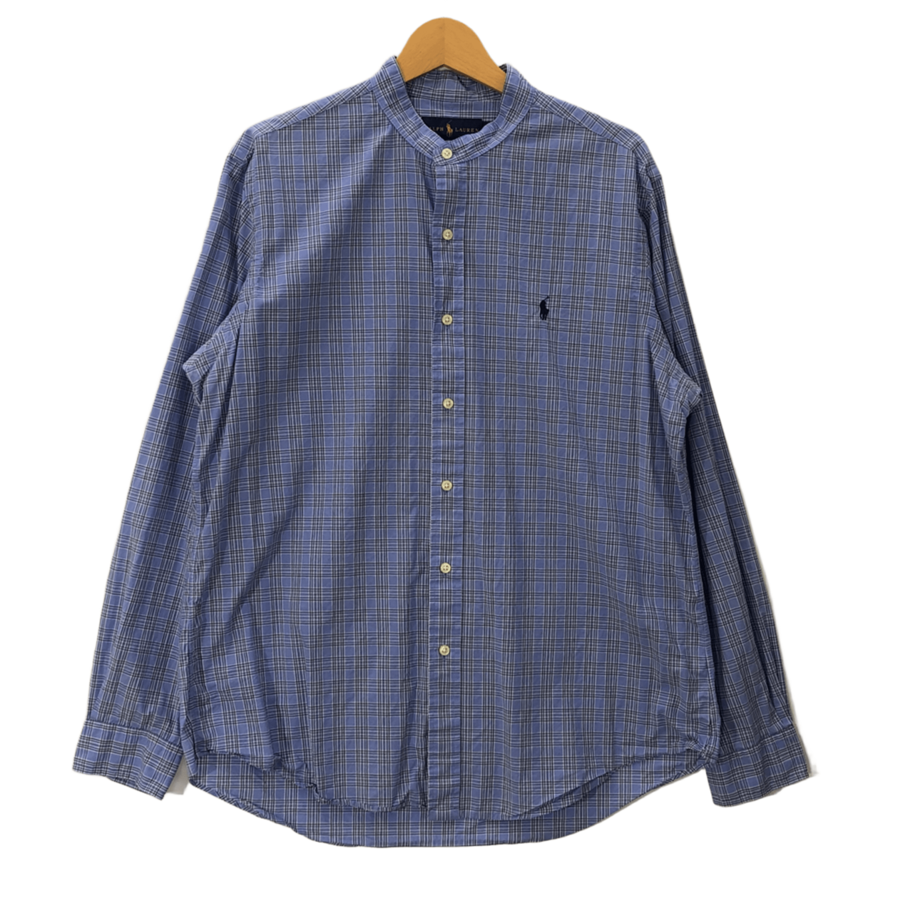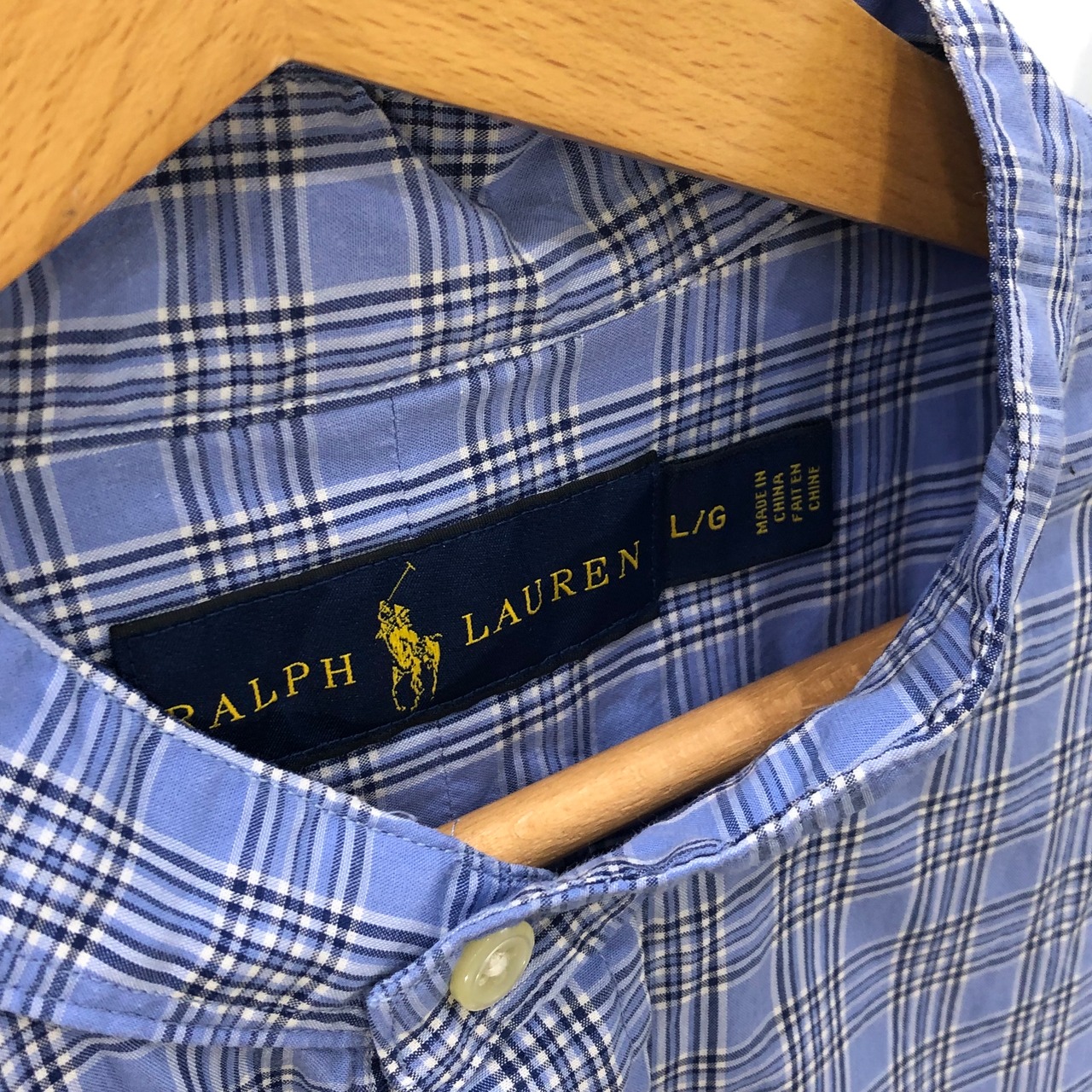 RALPH LAUREN ラルフローレン ノーカラーチェックシャツ ポニー刺繍 長袖シャツ ボタンダウン オーバーサイズ ビッグシルエット China製 Lサイズ ブルー
