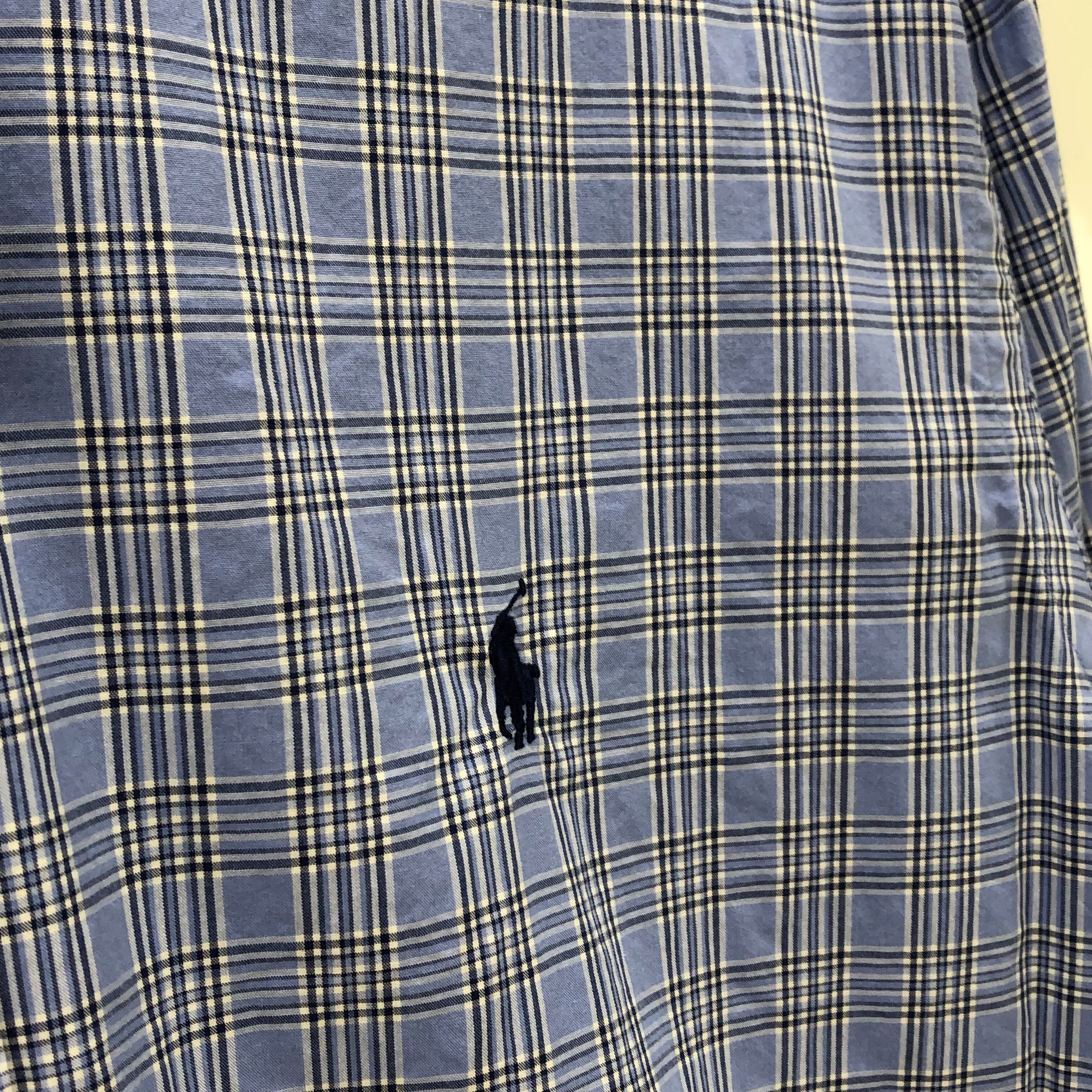 商品名:RALPH LAUREN ラルフローレン ノーカラーチェックシャツ ポニー刺繍 長袖シャツ ボタンダウン オーバーサイズ ビッグシルエット China製 Lサイズ ブルー