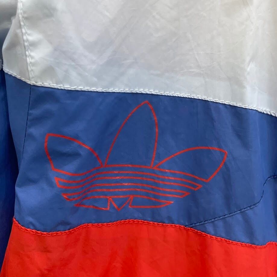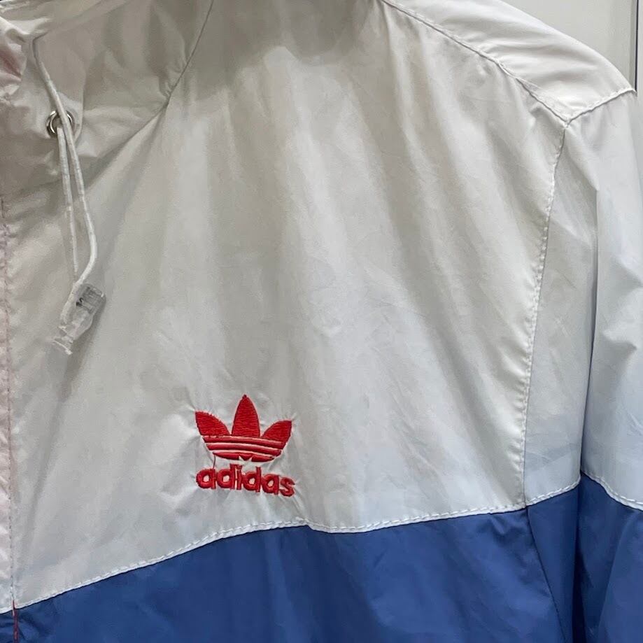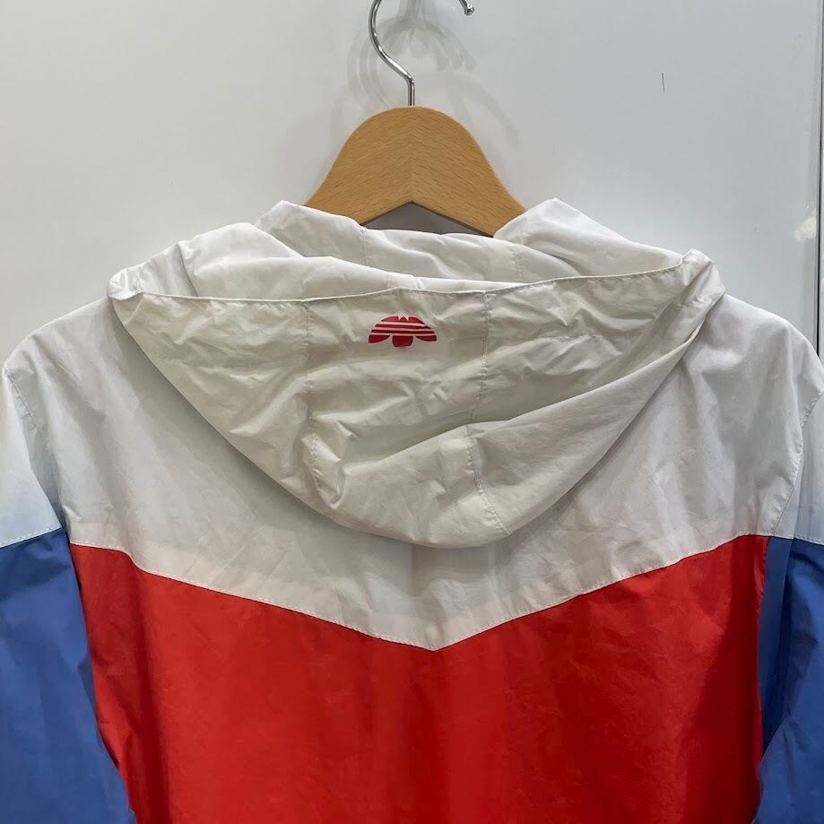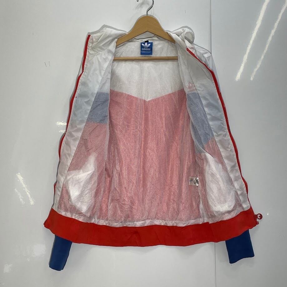 adidas/アディダス ナイロンジャケット ブルゾン ウインドブレーカー スリーライン マルチカラー フード ライトアウター ワンポイント刺繡 メンズ L ホワイトグレー/レッド/ブルー | OASISCLOTHING 海外古着屋【公式】通販サイト