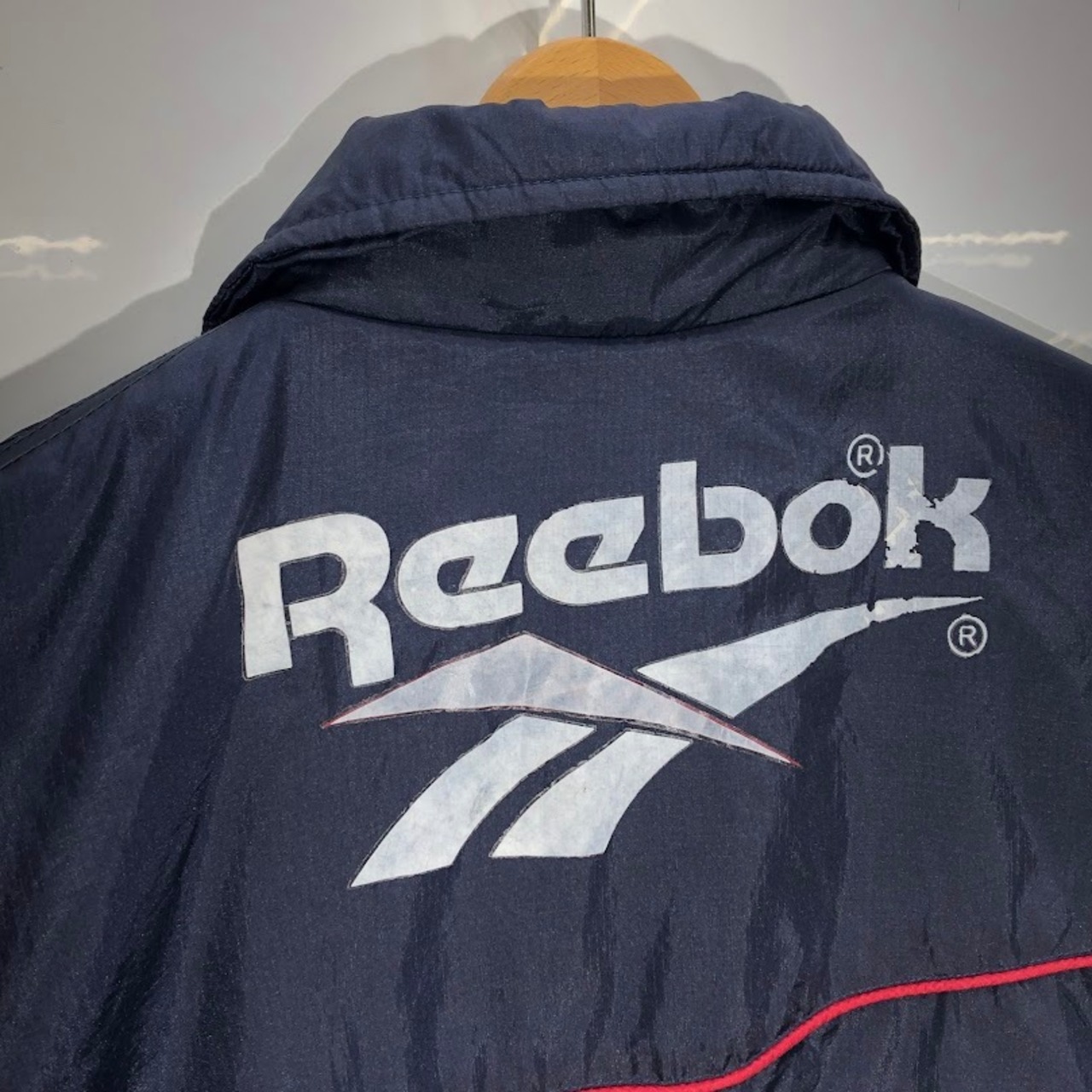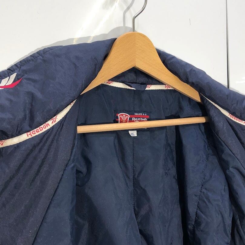 90's vintage Reebok リーボック ナイロンジャケット ラグビー ウェールズ チーム 中綿 アウター ドローコード バックプリント 企業ロゴ刺繡 ワンポイント刺繍 オーバーサイズ ビッグシルエット INDONESIA製 XLサイズ ネイビー | OASISCLOTHING 海外古着屋【公式】通販サイト