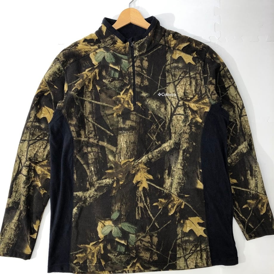 Columbia コロンビア ハーフジップ フリース ジャケット リアルツリー プルオーバー 総柄 ライトアウター 長袖 ワンポイント 刺繡 オーバーサイズ ビッグシルエット JORDAN製 XLサイズ カモフラ柄 ブラック グリーン