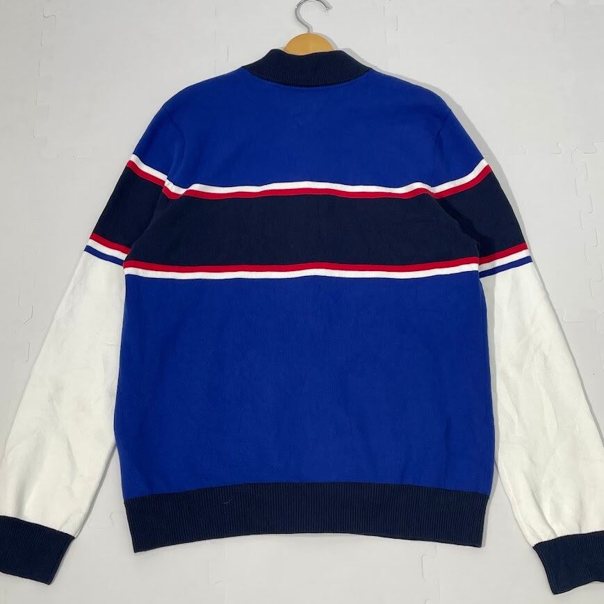 商品名:TOMMY HILFIGER トミーヒルフィガー ジップアップニット タグ付 セーター ジャケット ライトアウター フロント刺繍 オーバーサイズ ビックシルエット CHINA製 L/Gサイズ ブルー ホワイト