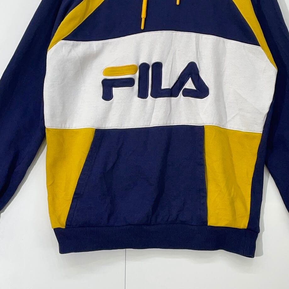 商品名: 90's/90年代 FILA/フィラ オールドフィラ パーカー フーディー プルオーバー フロント刺繡 オーバーサイズ ビックシルエット CHINA製 メンズ M/12 ネイビー/イエロー/ホワイト