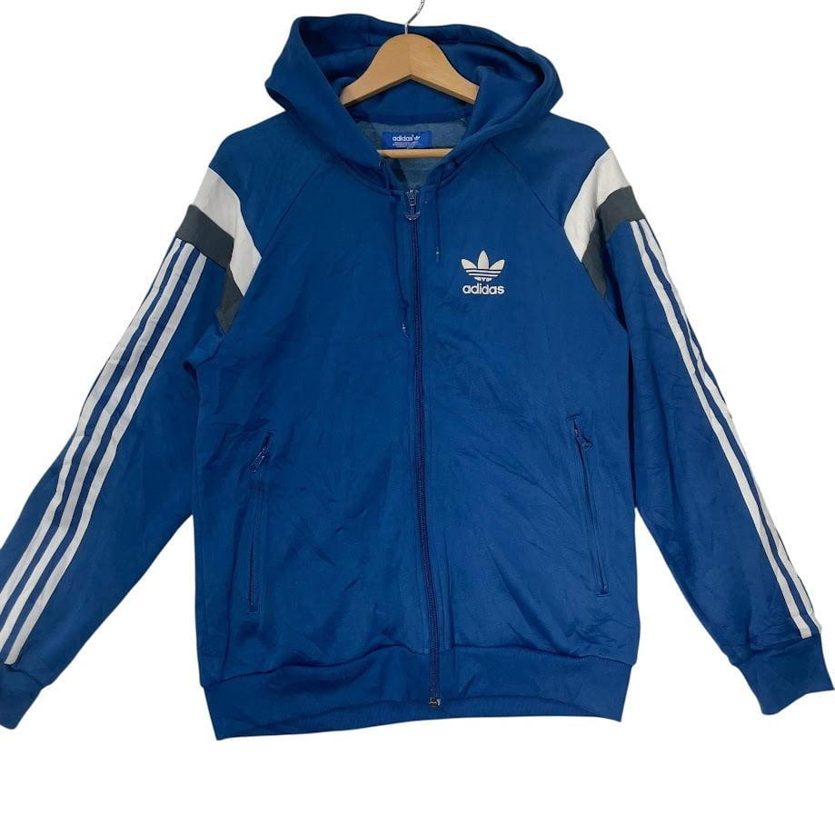 adidas アディダス トラックジャケット スリーライン 月桂樹 フーディー フード ライトアウター ワンポイント刺繡 ジャージ カンボジア製 Sサイズ ブルー | OASISCLOTHING 海外古着屋【公式】通販サイト
