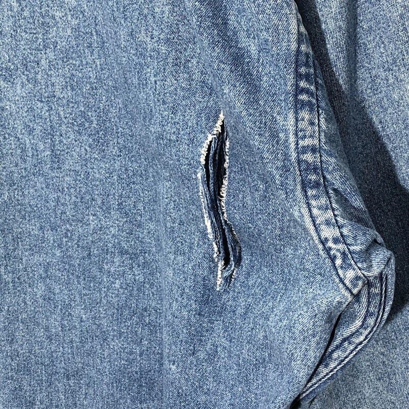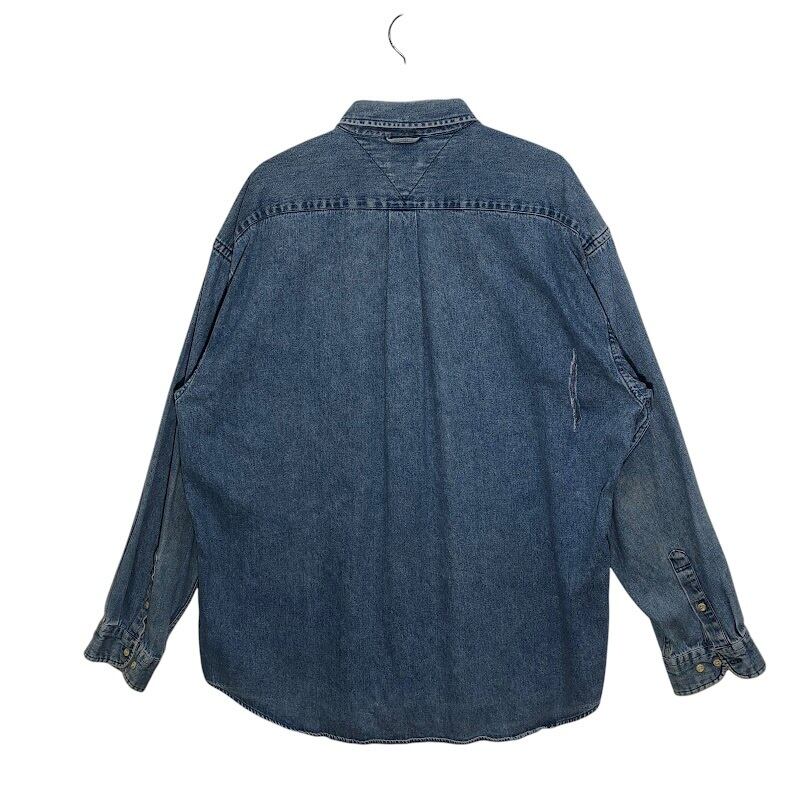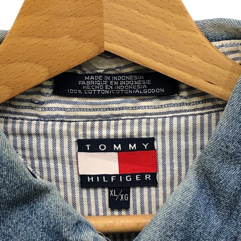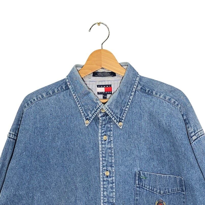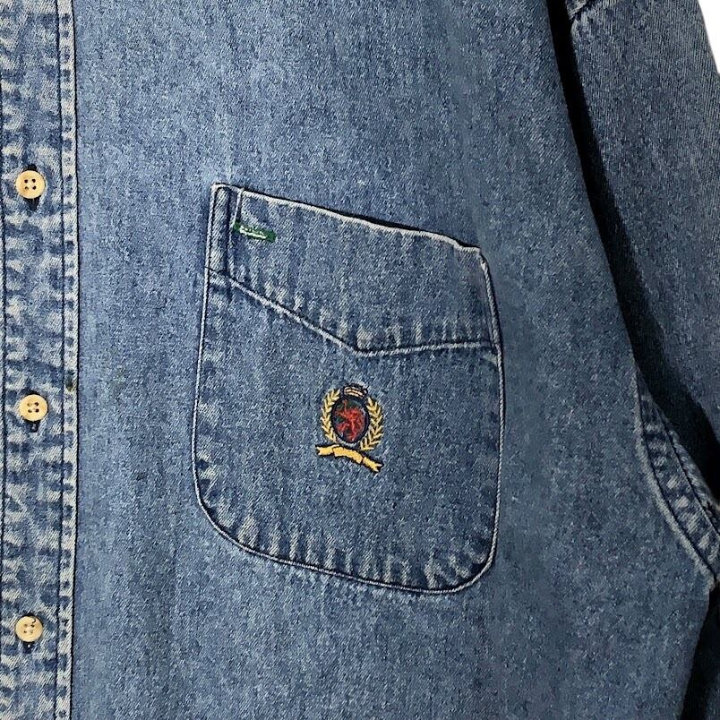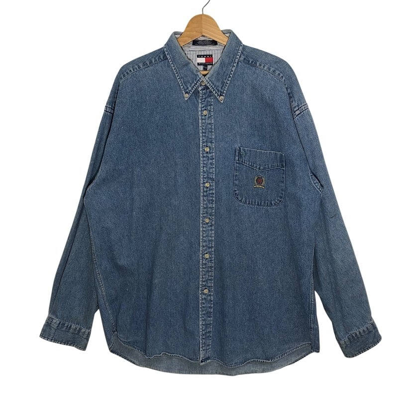 90's vintage TOMMY HILFIGER トミーヒルフィガー オールドトミー デニムシャツ 長袖 シャツ ボタンダウン ワンポイント刺繡 オーバーサイズ ビッグシルエット インドネシア製 XLサイズ ブルー | OASISCLOTHING 海外古着屋【公式】通販サイト