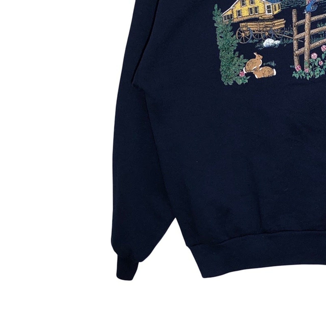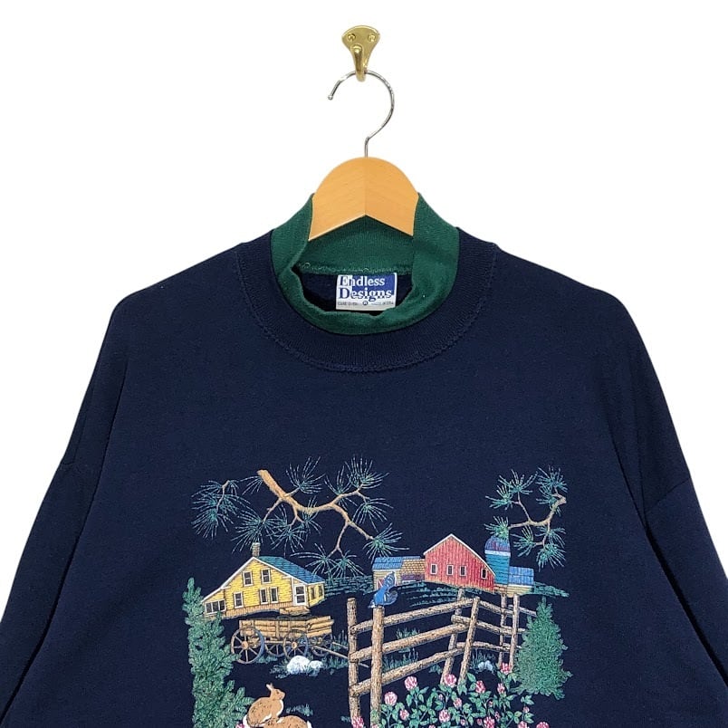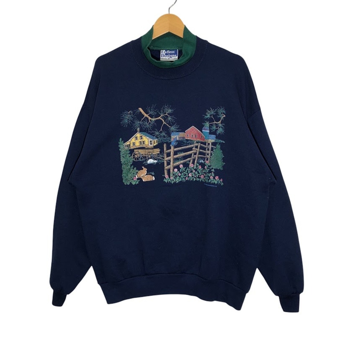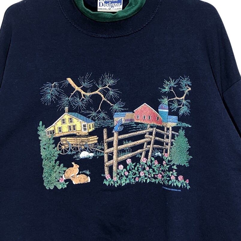 90's vintage 90年代 ヴィンテージ findless Desingns アニマルプリント二重襟 スウェット トレーナー 長袖 フロントプリント オーバーサイズ ビッグシルエット USA製 XLサイズ ネイビー | OASISCLOTHING 海外古着屋【公式】通販サイト