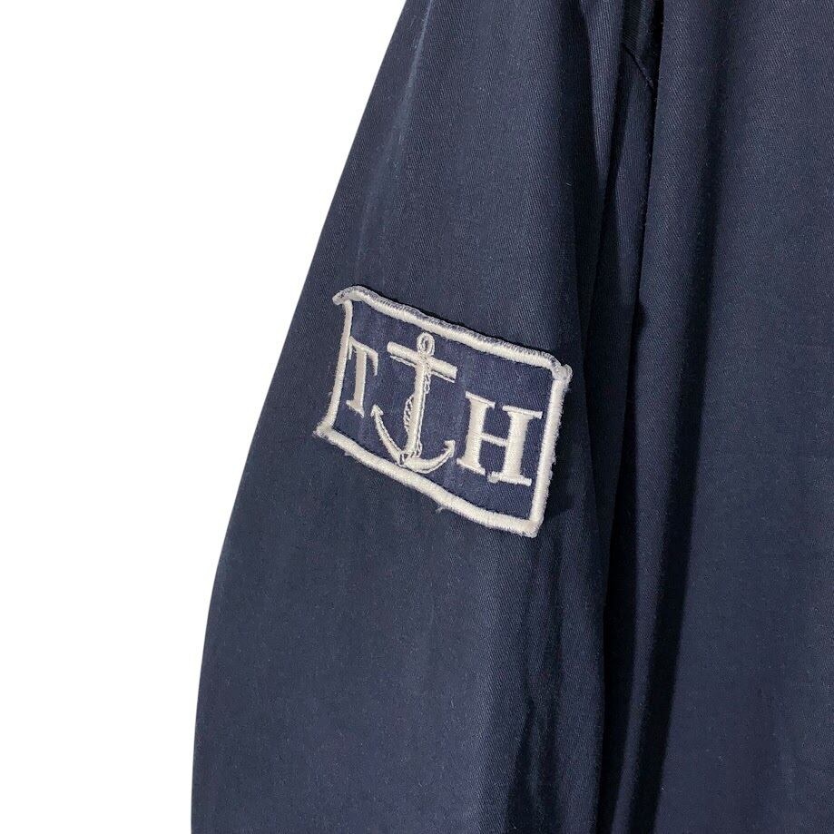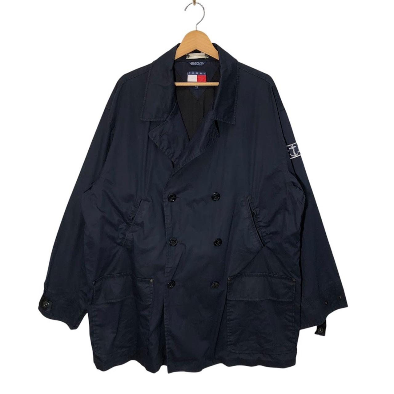 商品名:90's vintage 90年代 ヴィンテージ TOMMY HILFIGER トミーヒルフィガー フラッグタグ トレンチコート アウター ワンポイント袖刺繍 オーバーサイズ ビッグシルエット HONG KONG製 Lサイズ ネイビー