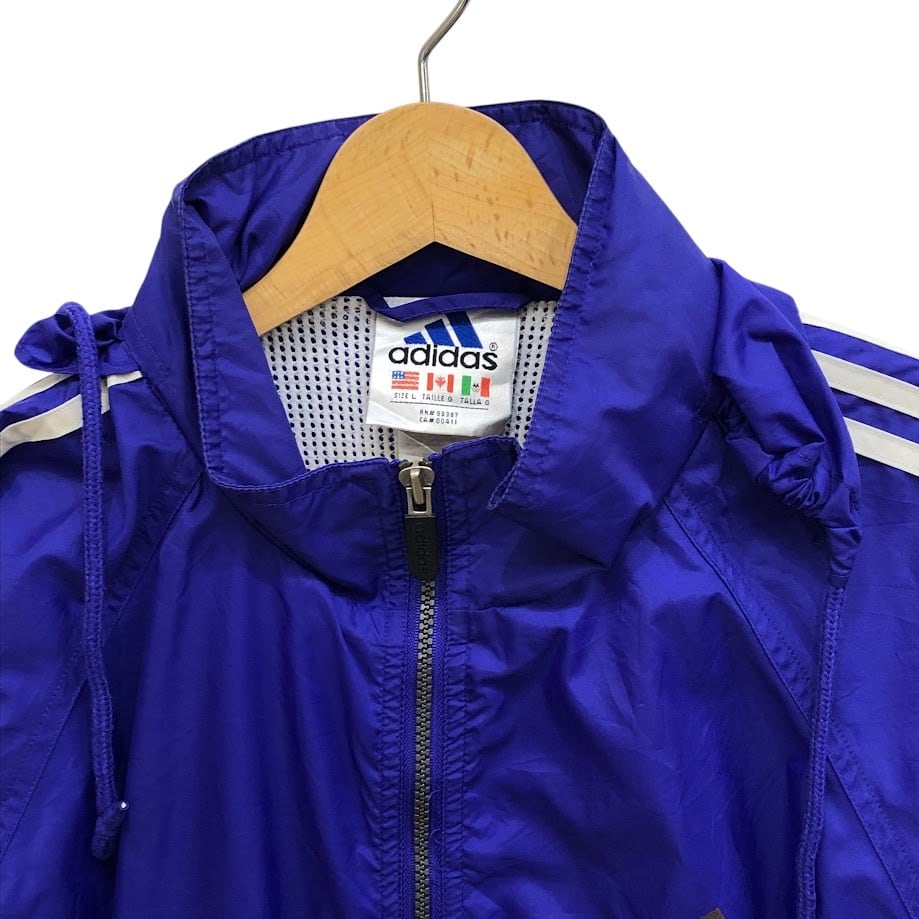 商品名:adidas/アディダス 90年代/90's ヴィンテージ スリーライン パフォーマンスロゴ フード収納 アウター ナイロンジャケット ワンポイント刺繡 MACAU製 Lサイズ ブルー