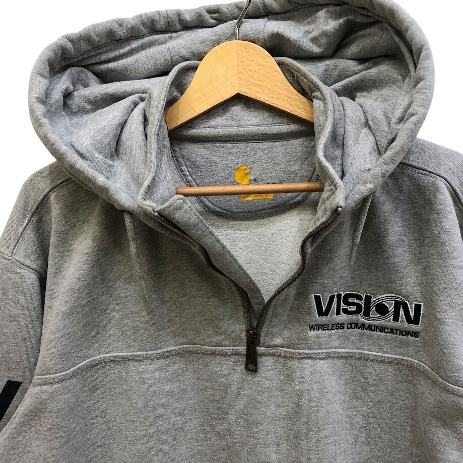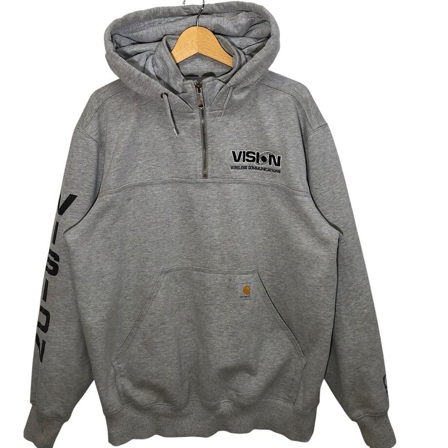 Carhartt /カーハート RAINDEFENDER/レインディフェンダー ハーフジップ スウェット トレーナー パーカー フーディー プルオーバー 袖プリント 企業ロゴ刺繍 オーバーサイズ ビッグシルエット GUATEMALA製 Lサイズ グレー | OASISCLOTHING 海外古着屋【公式】通販サイト