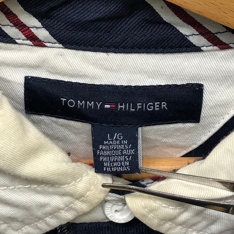 商品名:TOMMY HILFIGER トミーヒルフィガー ラガーシャツ 長袖 ポロシャツ ワンポイント刺繡 Philippines製 Lサイズ ネイビー ホワイト