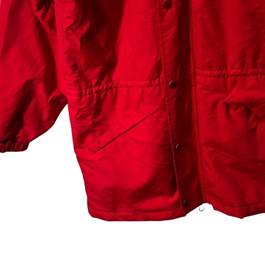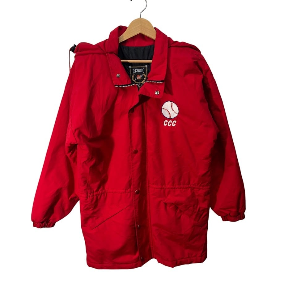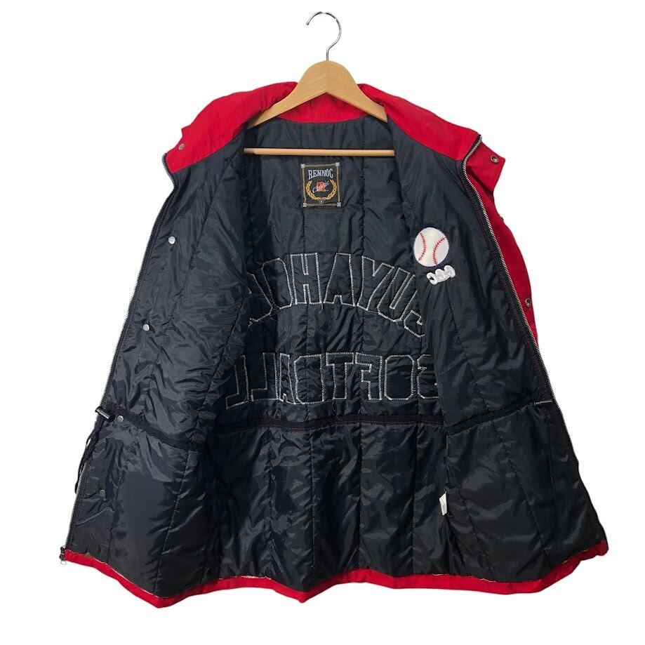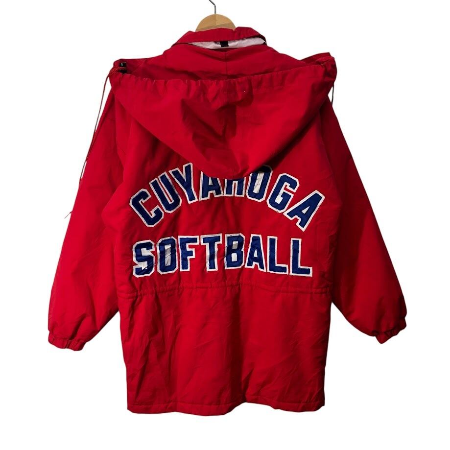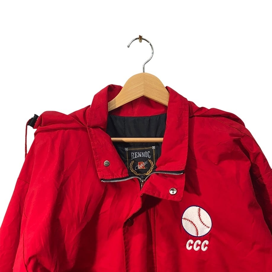 商品名:90's vintage 90年代 ヴィンテージ RENNOC レノック Classic CUYAHOGA SOFTBALL ダブルジップ フード収納 アウター ナイロンジャケット コート ウエストドローコード フロントバック刺繍 USA製 Sサイズ レッド