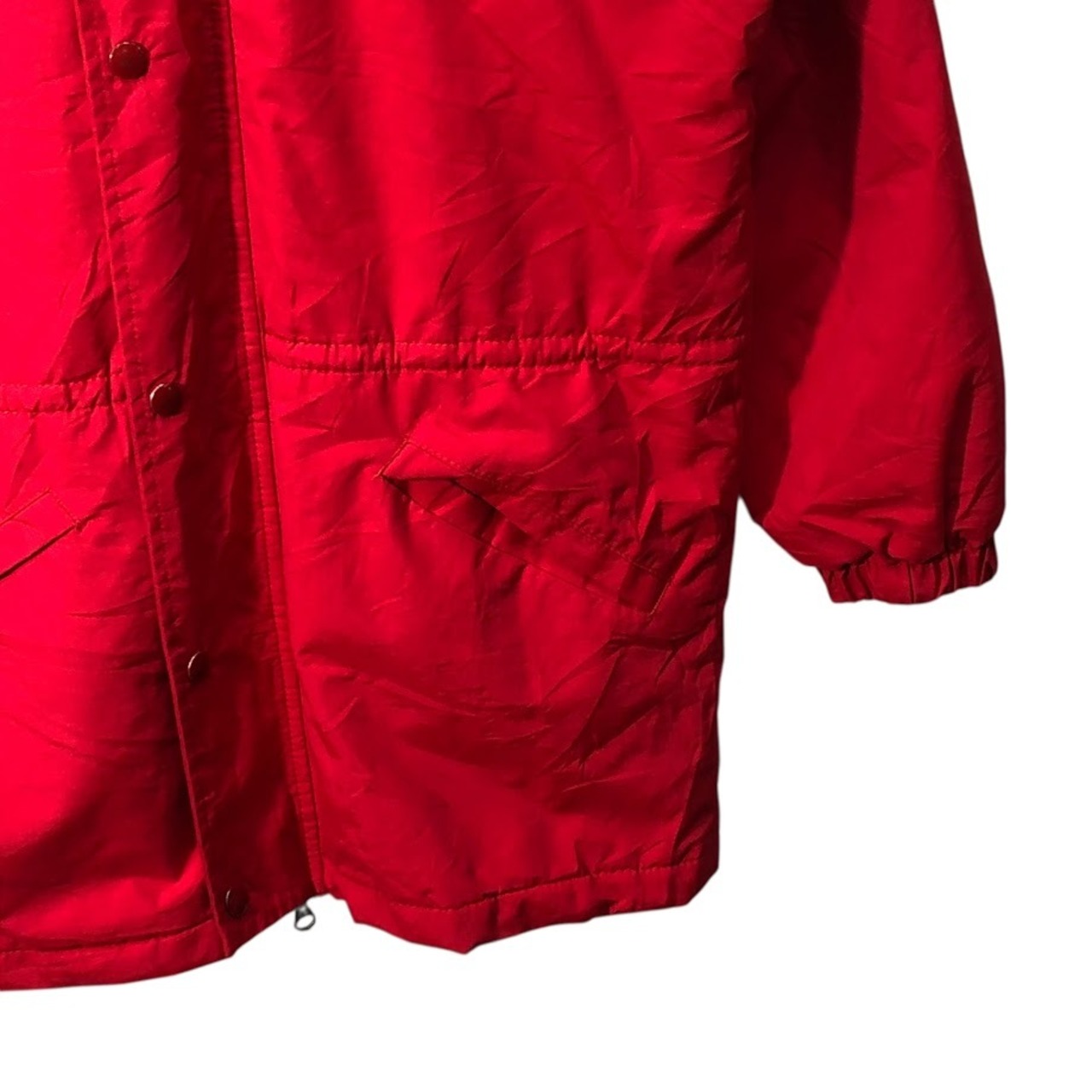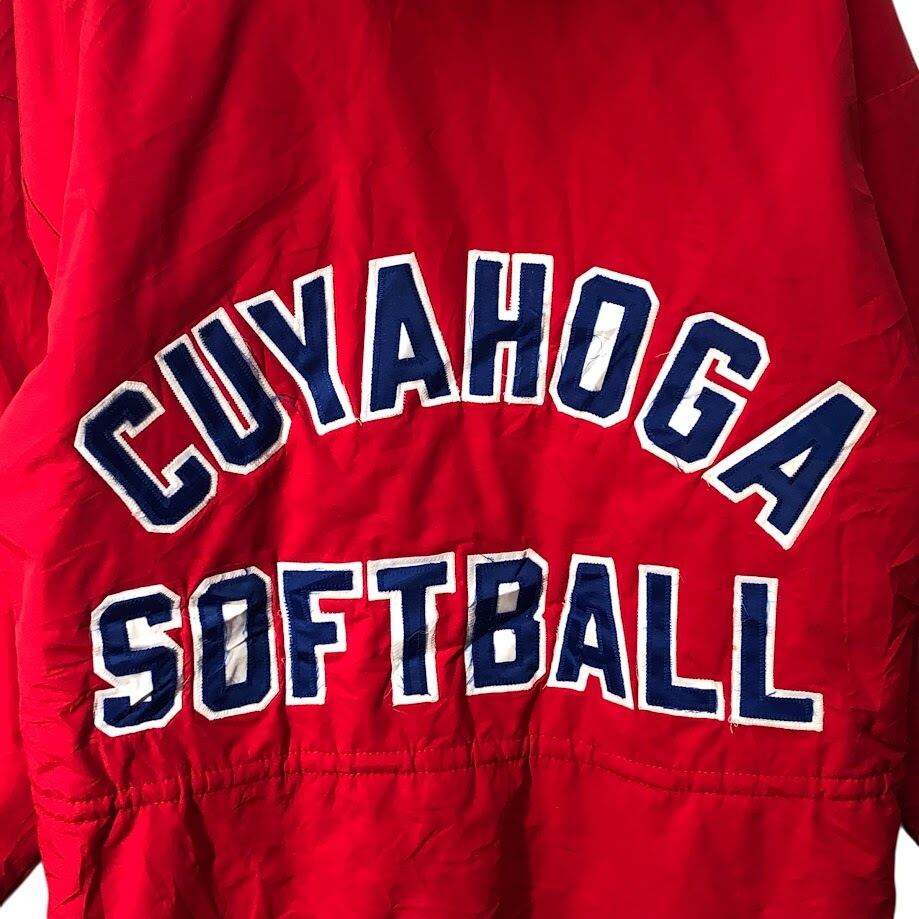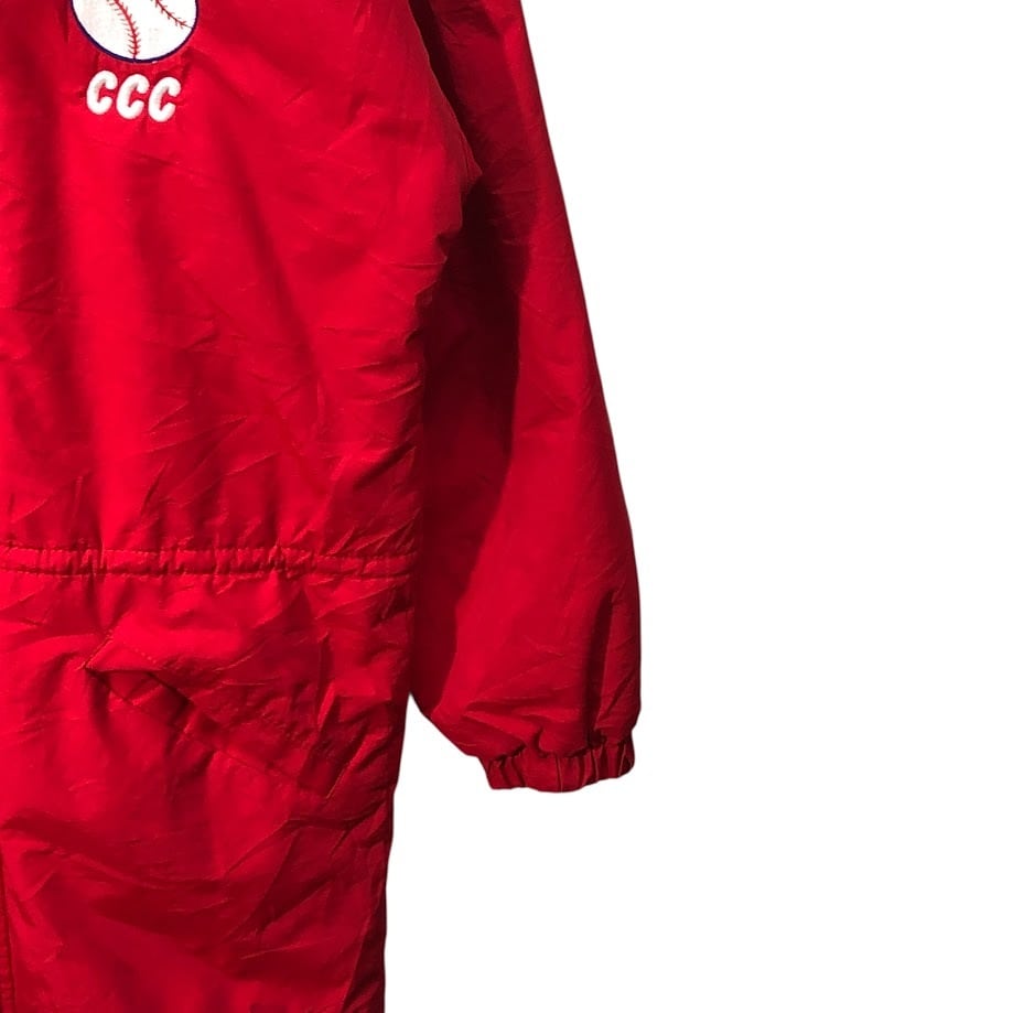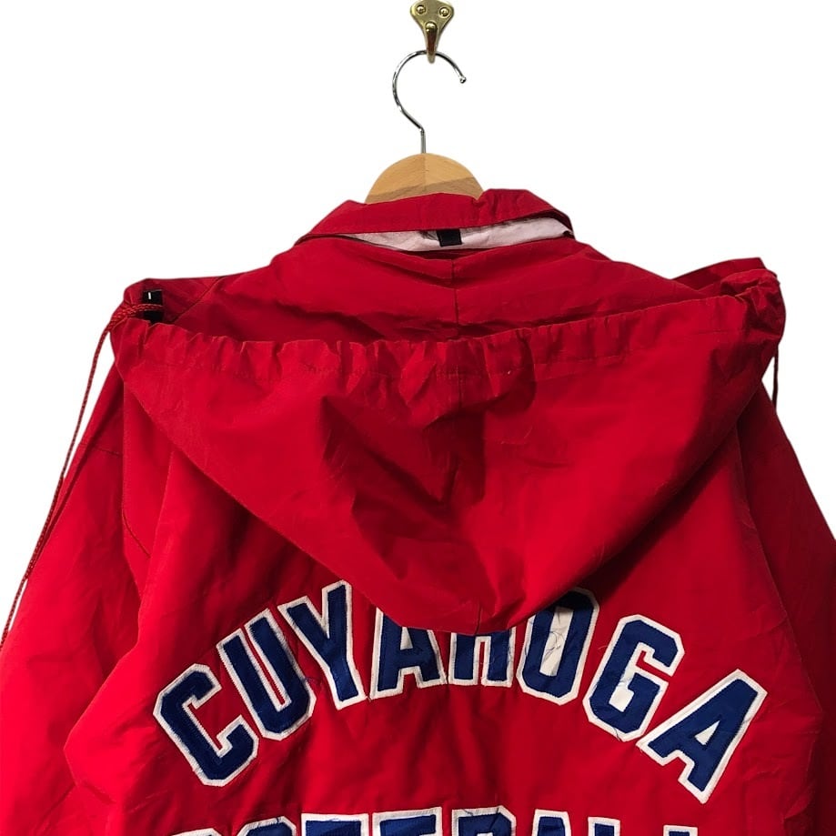 商品名:90's vintage 90年代 ヴィンテージ RENNOC レノック Classic CUYAHOGA SOFTBALL ダブルジップ フード収納 アウター ナイロンジャケット コート ウエストドローコード フロントバック刺繍 USA製 Sサイズ レッド