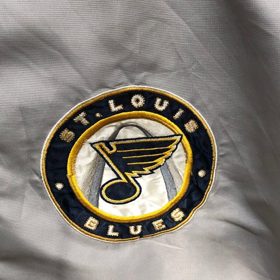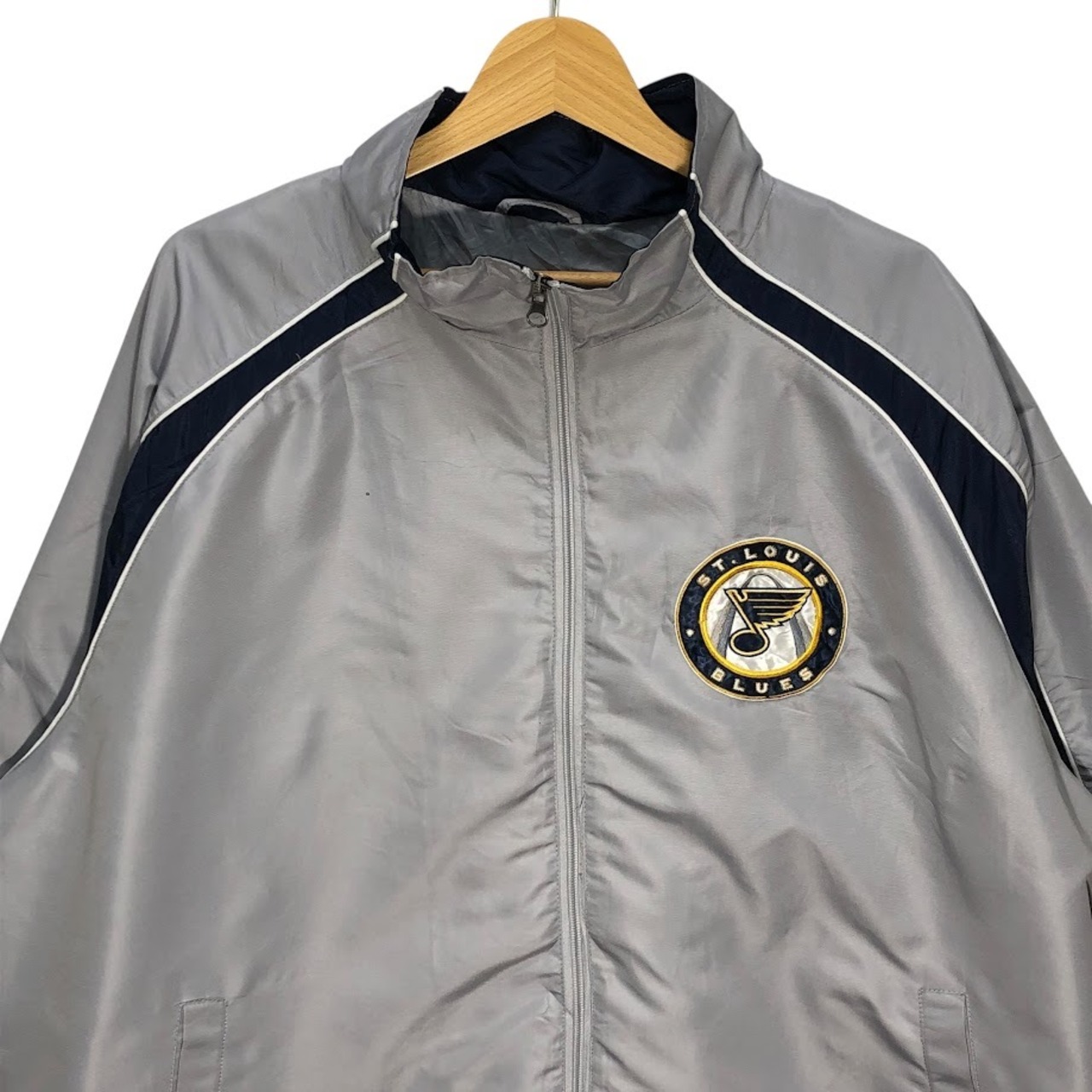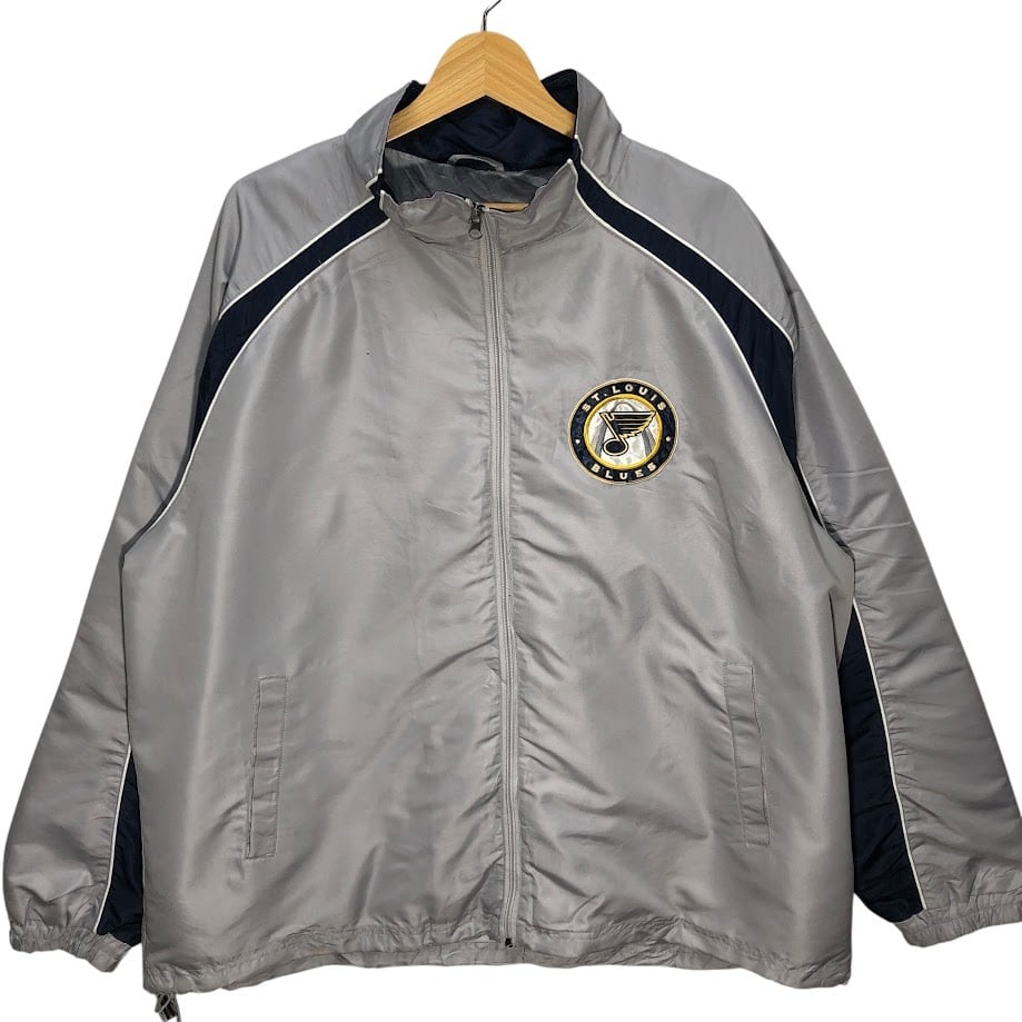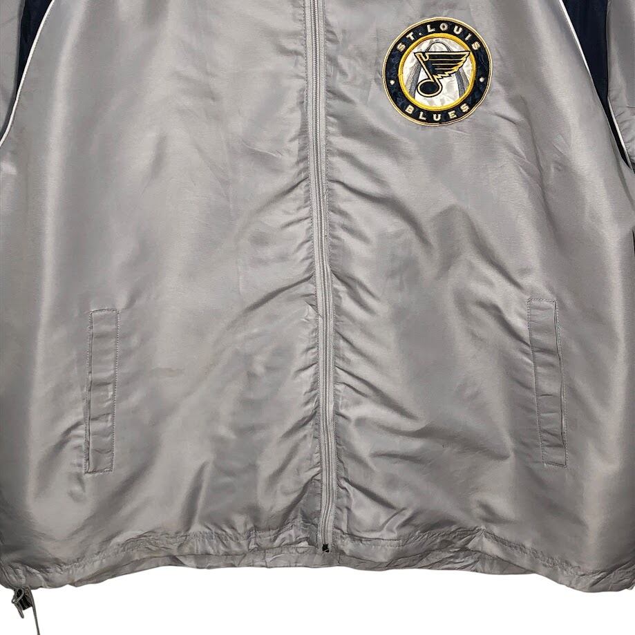 NHL.ST.LOUIS BLUES セントルイス・ブルース ナイロンジャケット ドローコード フロント刺繡 バック刺繡 オーバーサイズ ビッグシルエット CHINA製 XLサイズ シルバーグレー/ネイビー