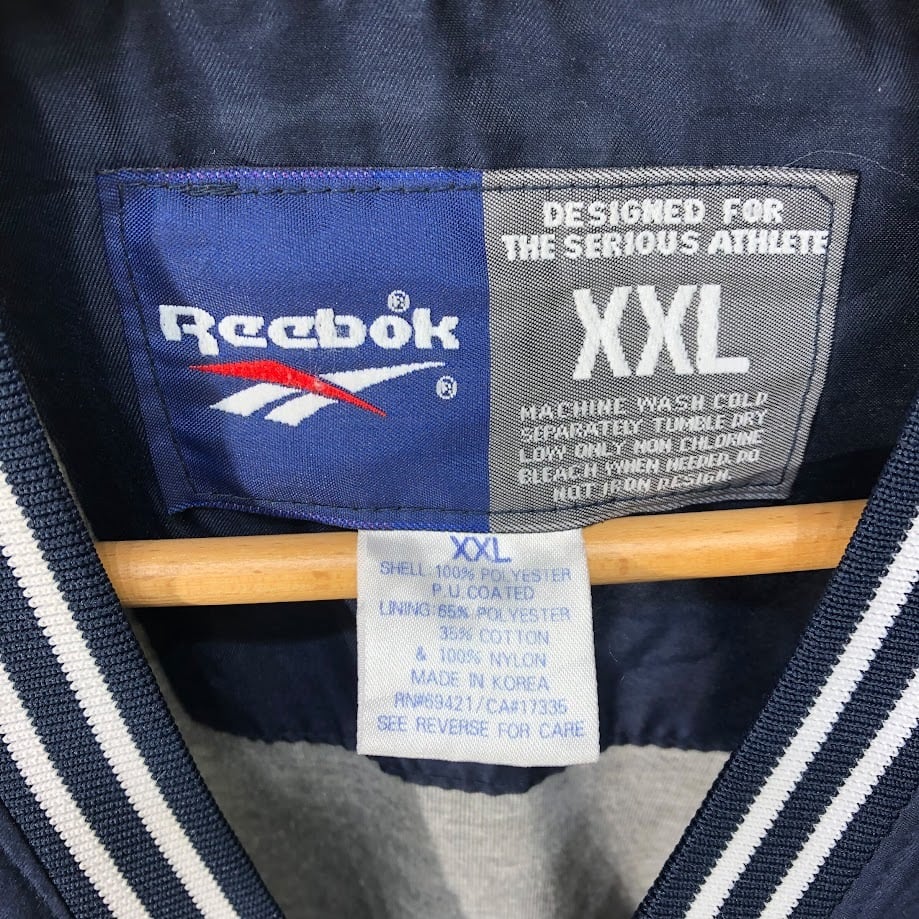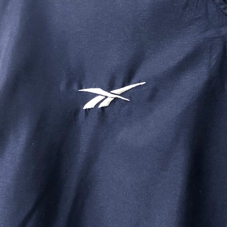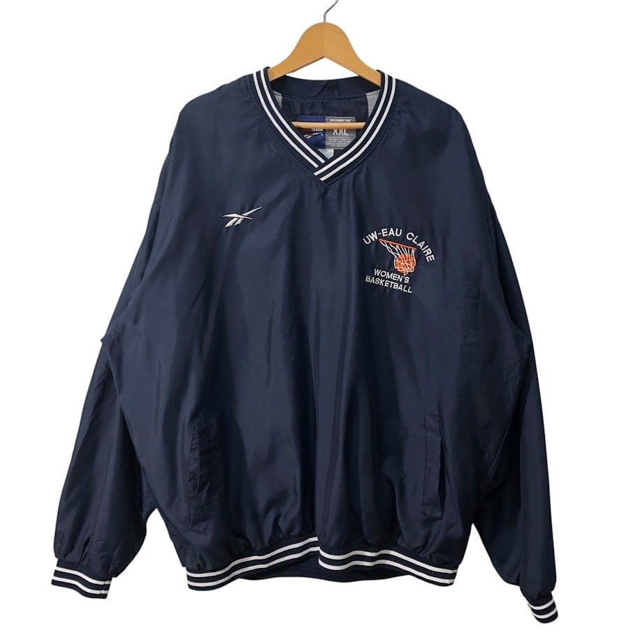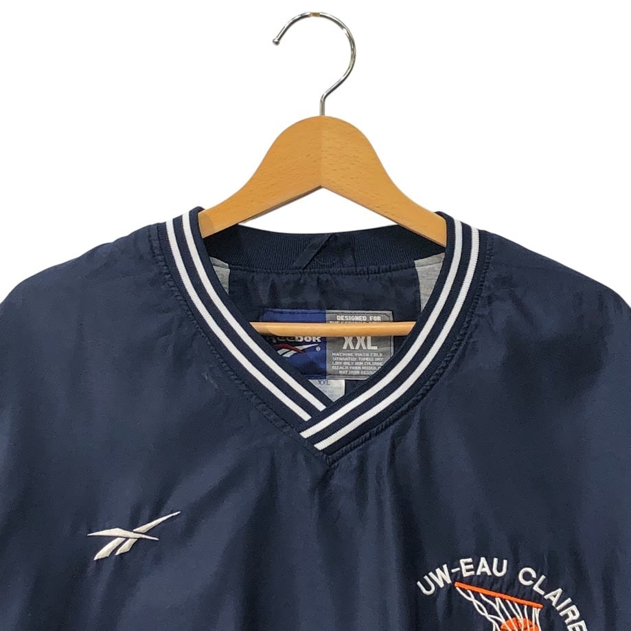 90's vintage 90年代 ヴィンテージ Reebok リーボック ナイロンプルオーバーシャツ バスケチーム刺繍 フロント刺繍 Vネック Korea製 XXLサイズ ネイビー