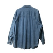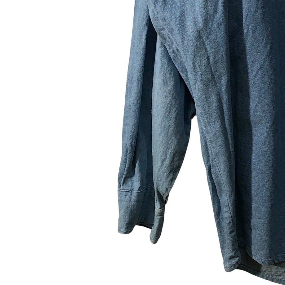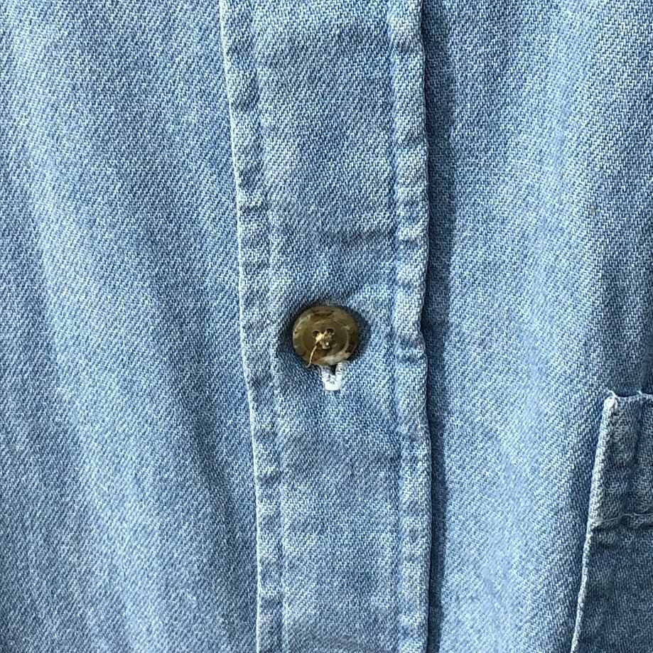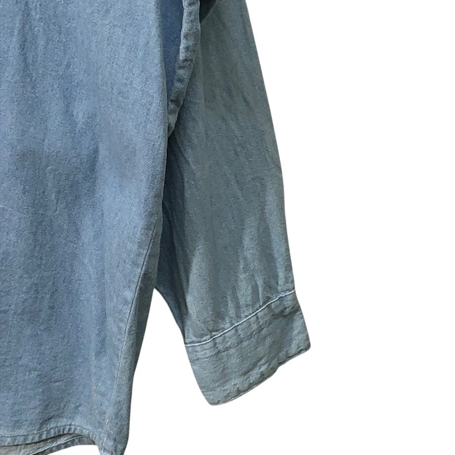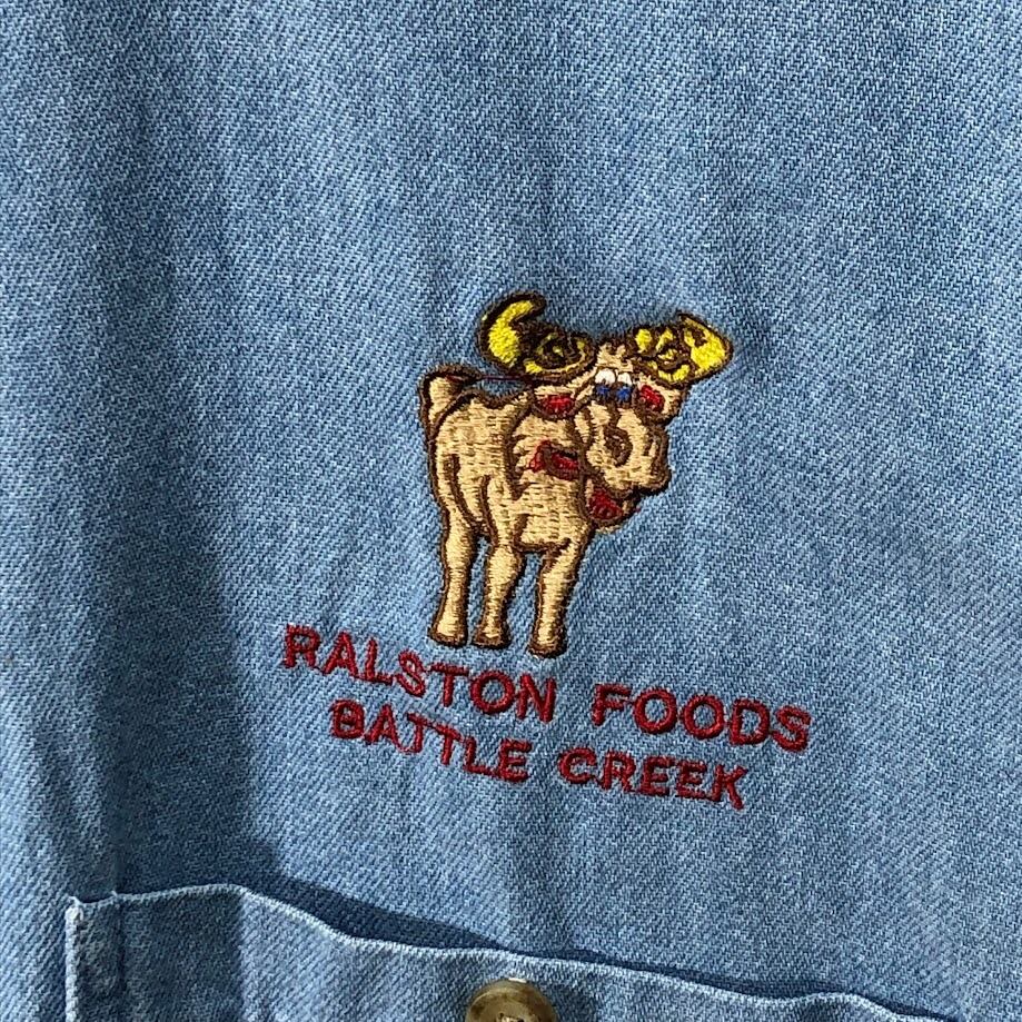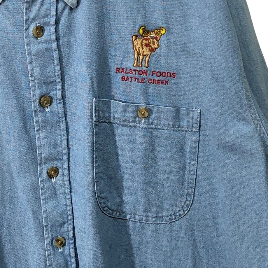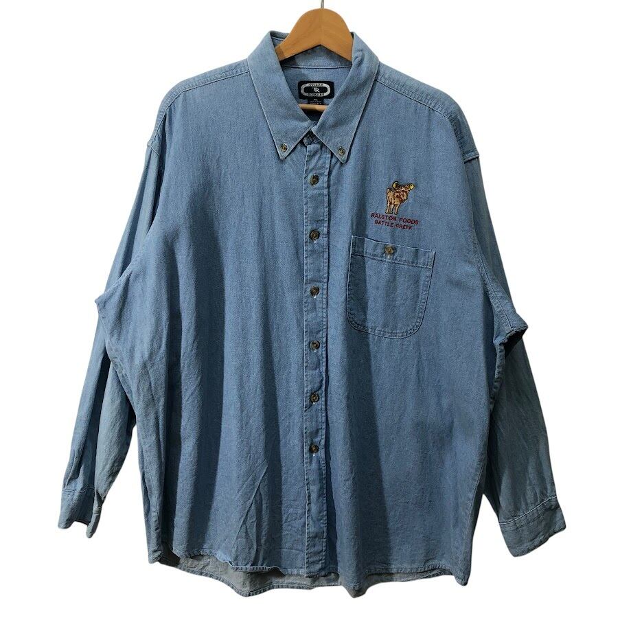 商品名:TR THREE RIVERS デニムシャツ 企業モノ ヘラジカ RALSTON FOODS 長袖 シャツ ボタンダウン 企業ロゴ刺繍 ワンポイント刺繡 オーバーサイズ ビッグシルエット Mexico製 XLサイズ ブルー