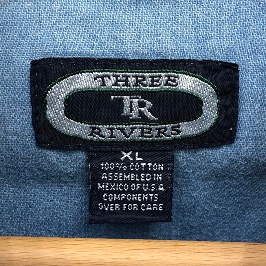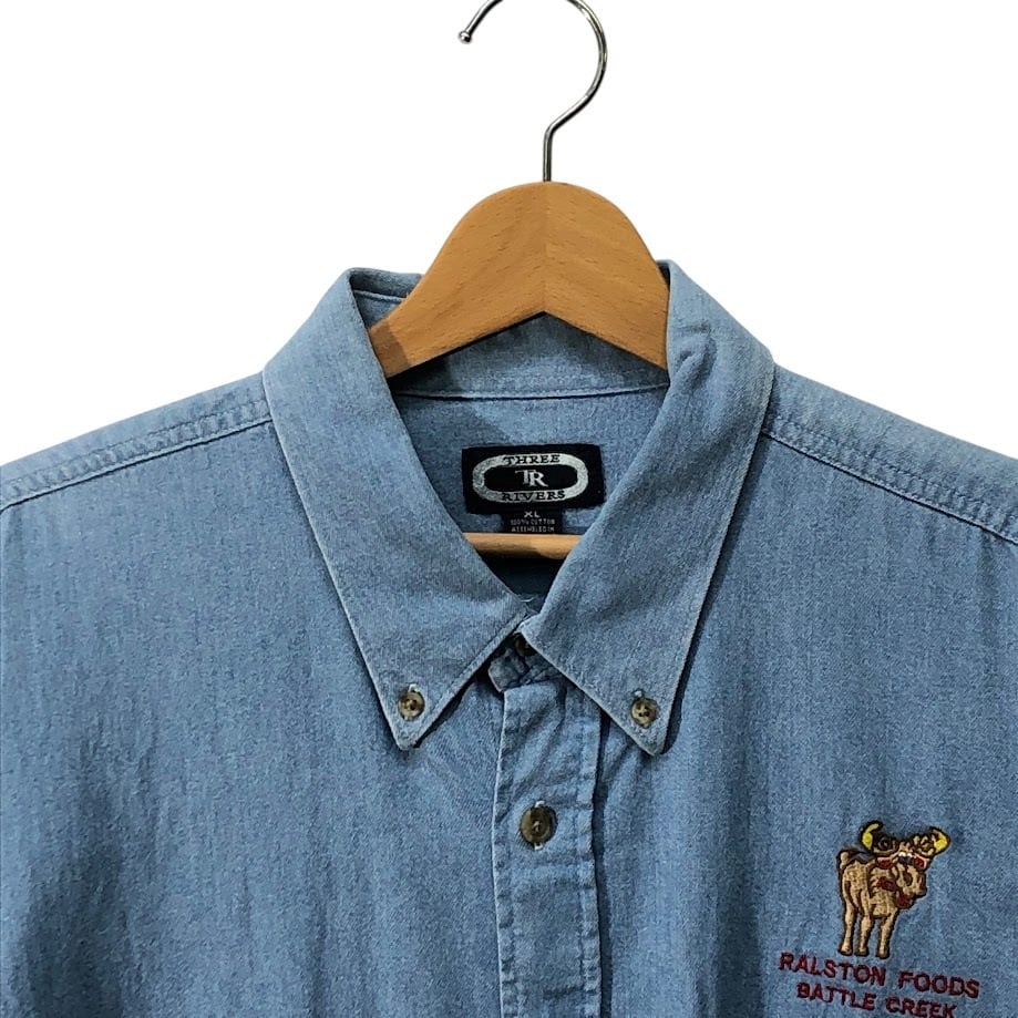 TR THREE RIVERS デニムシャツ 企業モノ ヘラジカ RALSTON FOODS 長袖 シャツ ボタンダウン 企業ロゴ刺繍 ワンポイント刺繡 オーバーサイズ ビッグシルエット Mexico製 XLサイズ ブルー