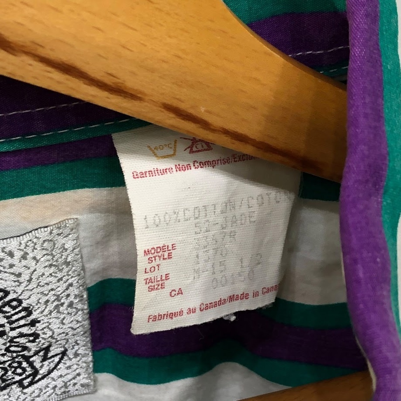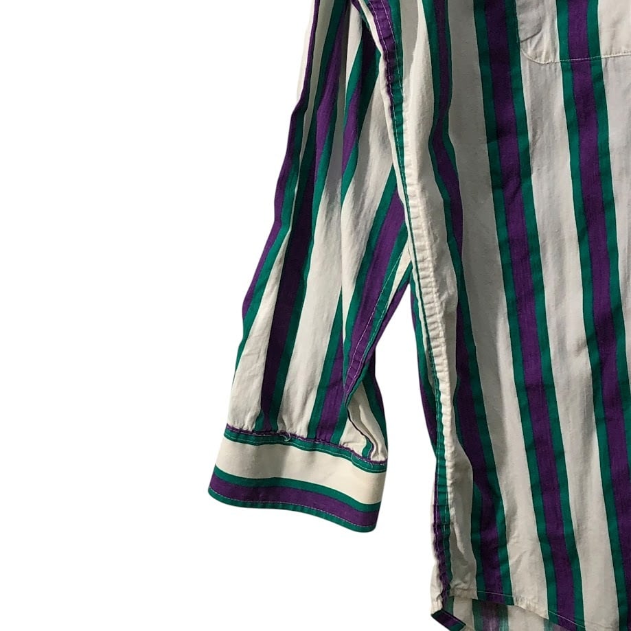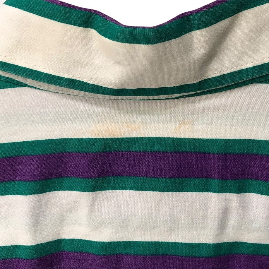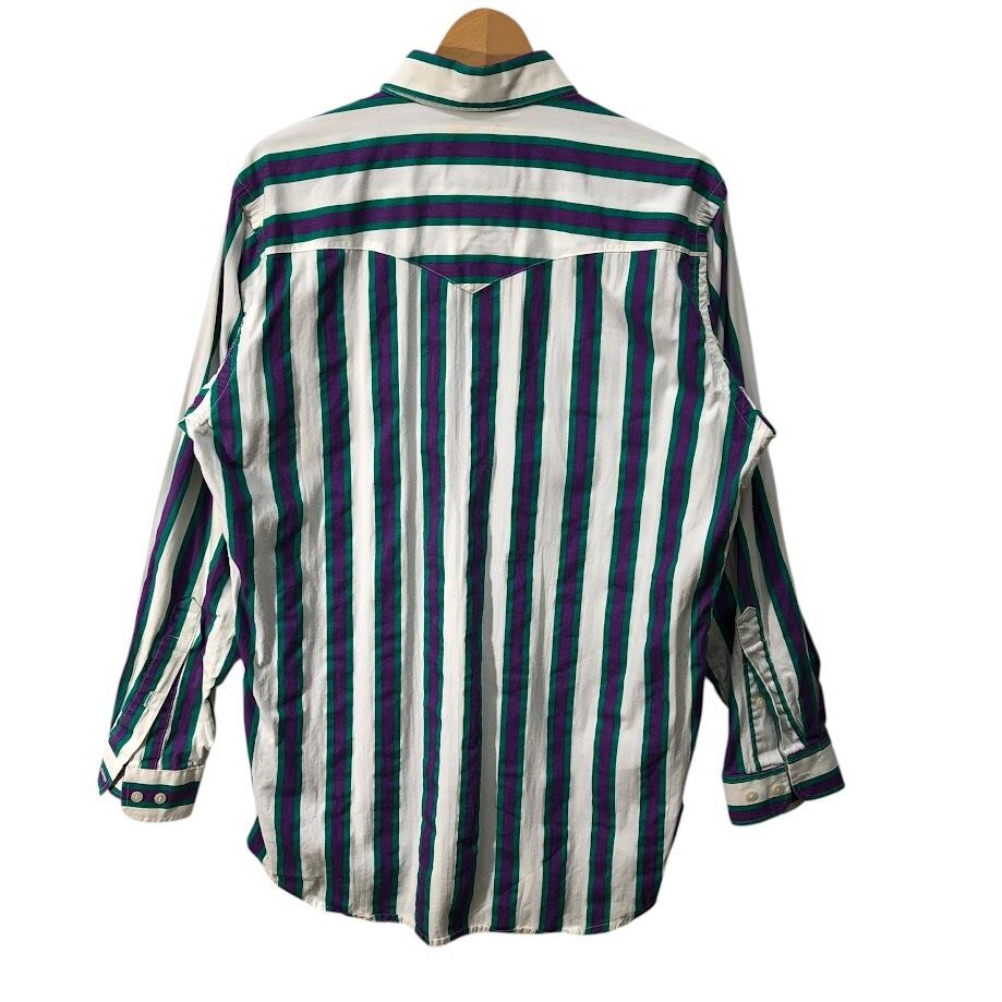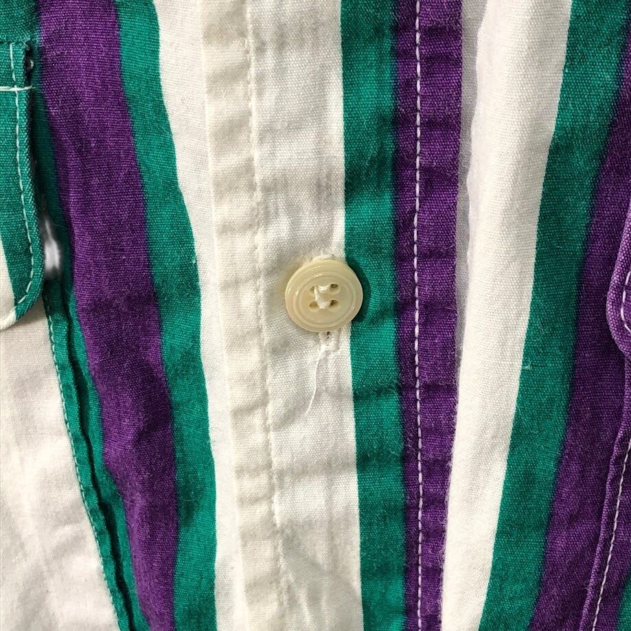 商品名:90's vintage 90年代 ヴィンテージ Mid-West Garment CO. ミッドウエストガーメント ストライプ柄 ダブルポケット 長袖 シャツ ボタンダウン CANADA製 M-15 1/2サイズ ホワイト パープル グリーン