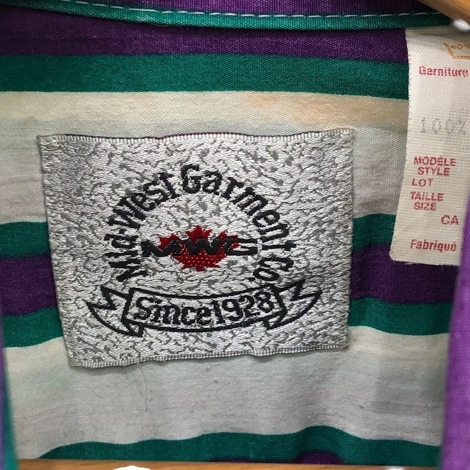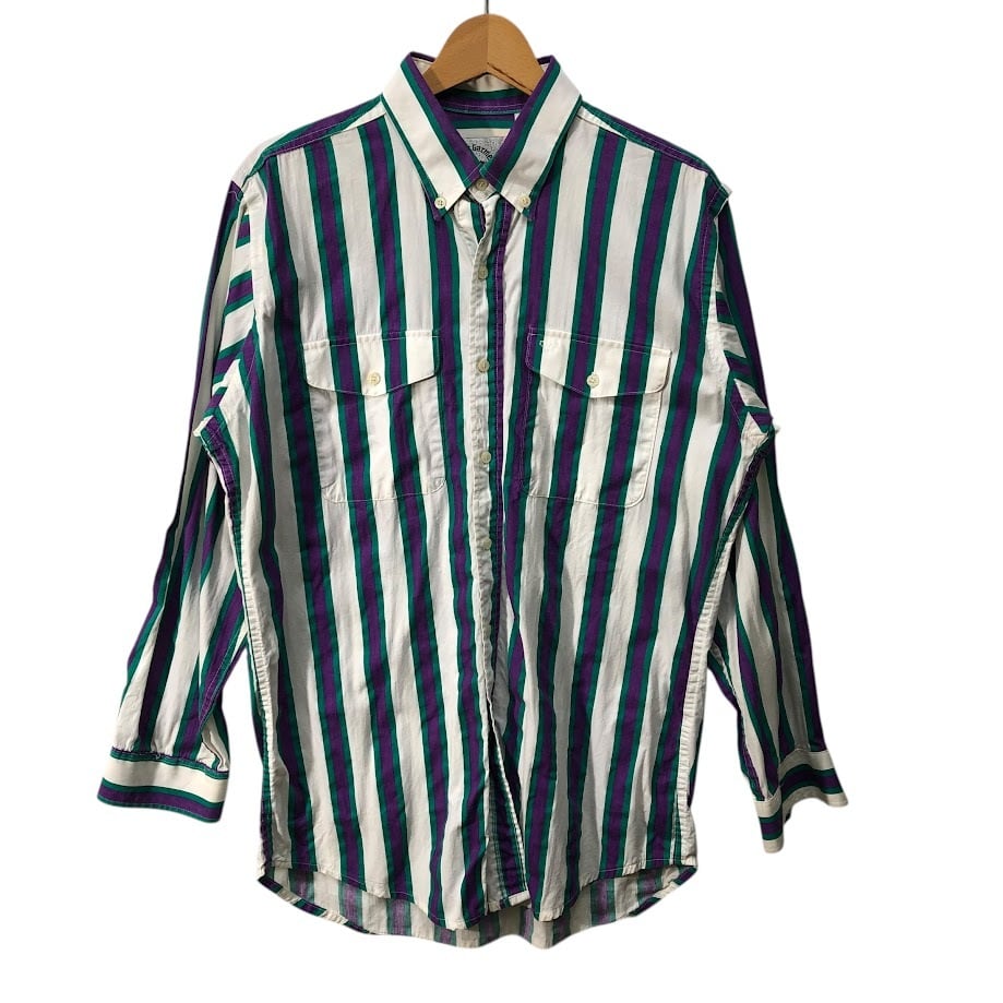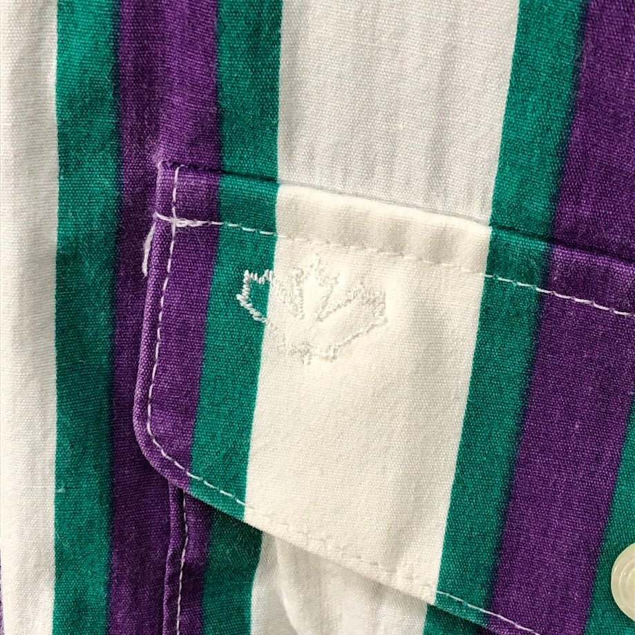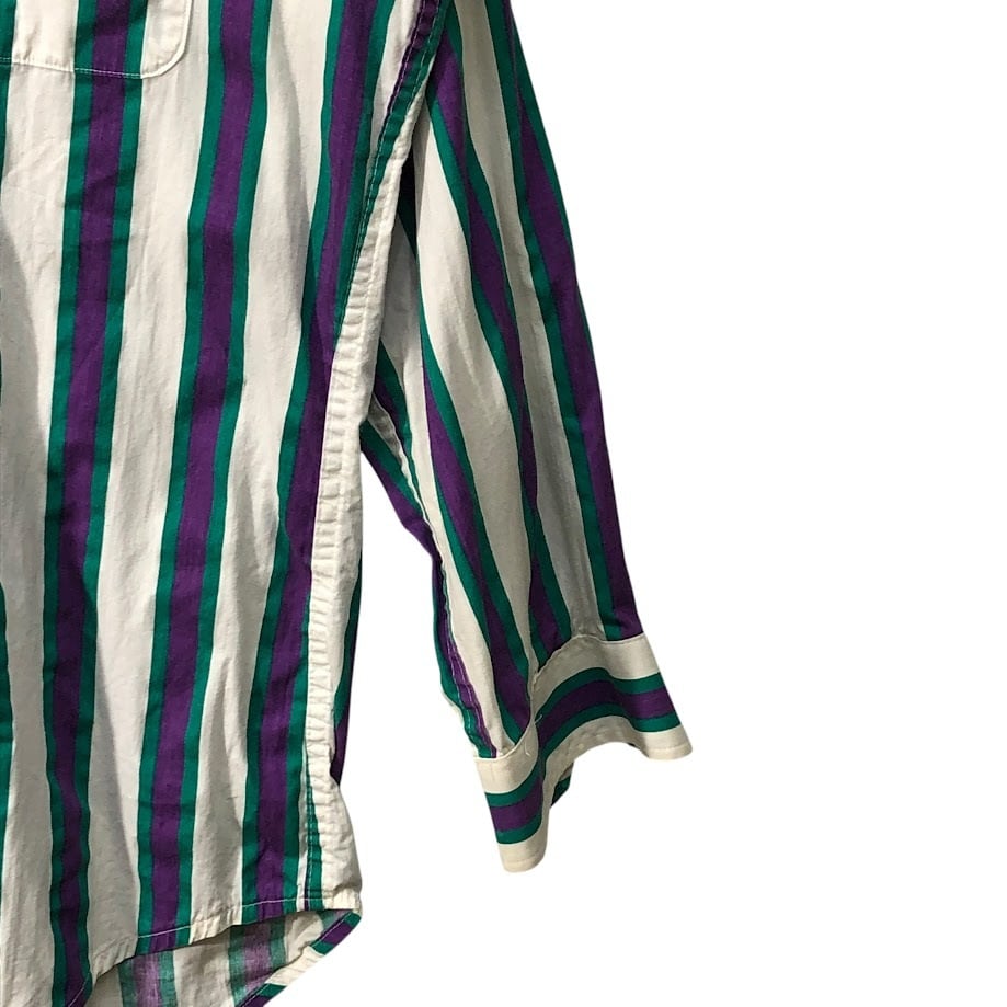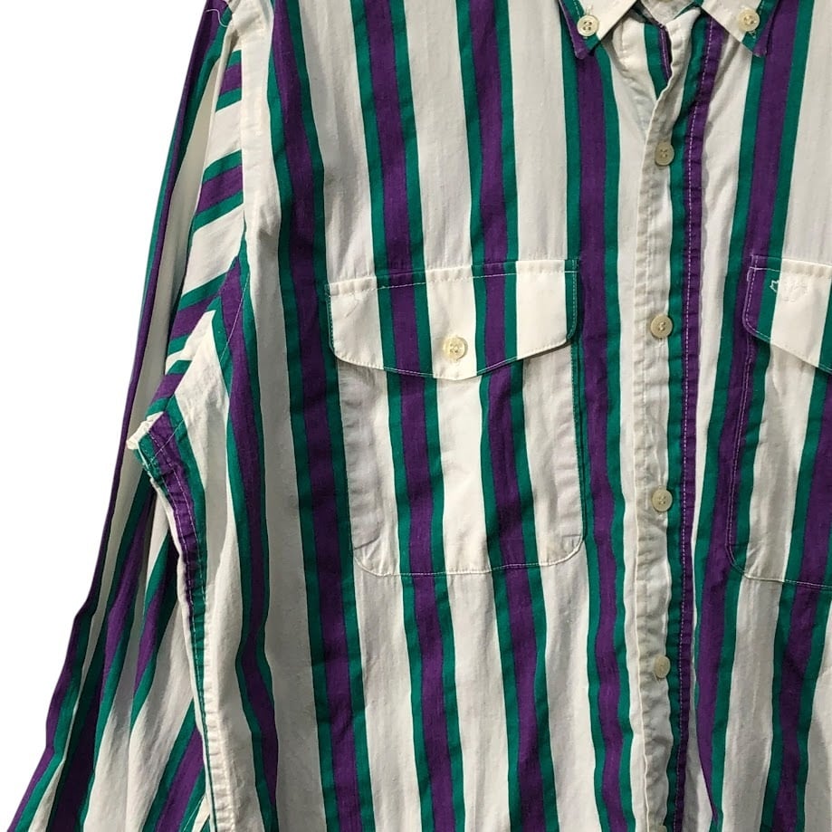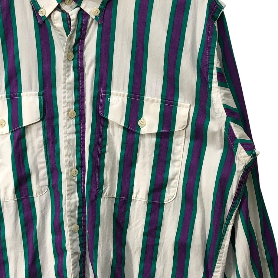 90's vintage 90年代 ヴィンテージ Mid-West Garment CO. ミッドウエストガーメント ストライプ柄 ダブルポケット 長袖 シャツ ボタンダウン CANADA製 M-15 1/2サイズ ホワイト パープル グリーン