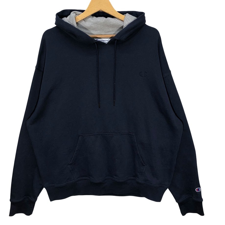 商品名:Champion チャンピオン パーカー フーディー プルオーバー 長袖 袖刺繡 ワンポイント刺繡 オーバーサイズ ビッグシルエット カンボジア製 XLサイズ ネイビー グレー
