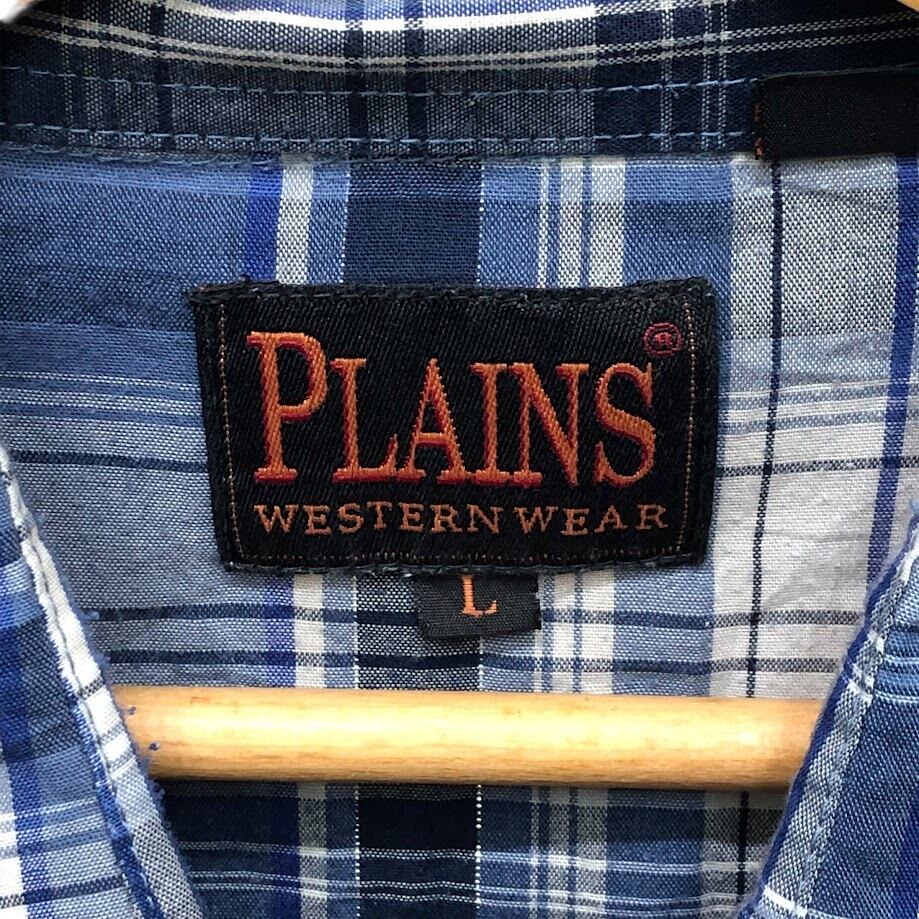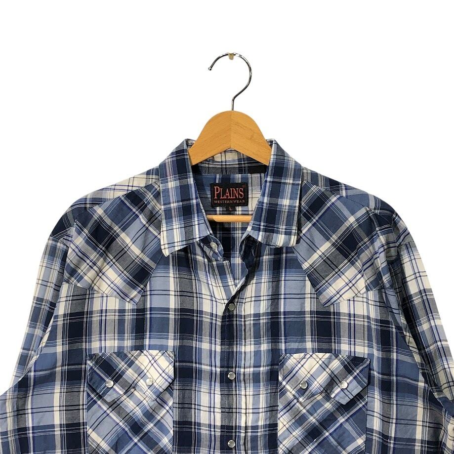 PLAINS WESTERN WEAR チェックウエスタンシャツ 長袖 シャツ スナップボタンダウン CHINA製 Lサイズ ブルー ホワイト ブラック