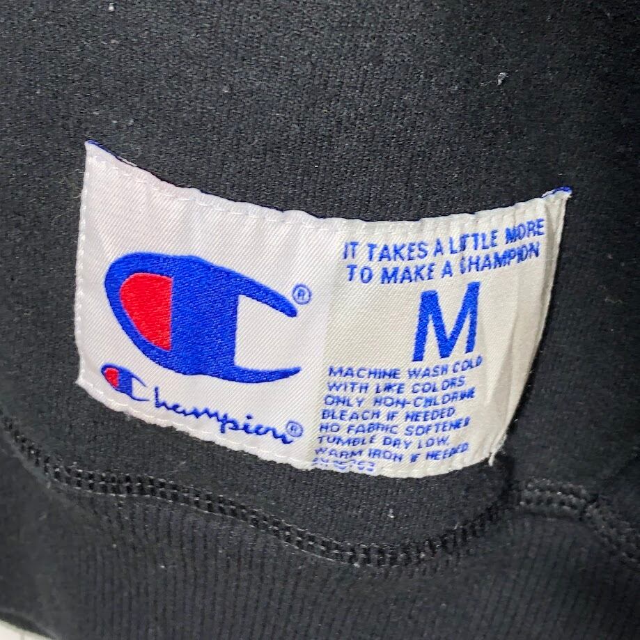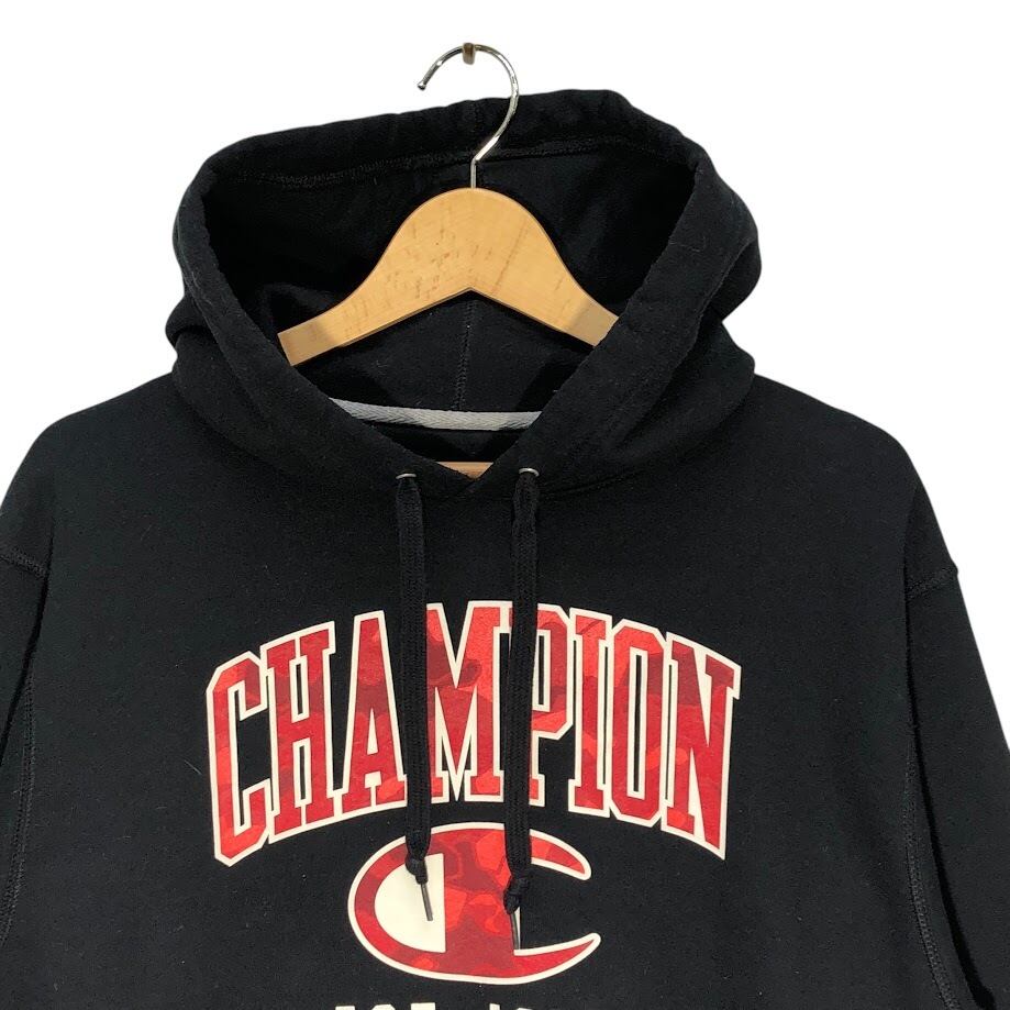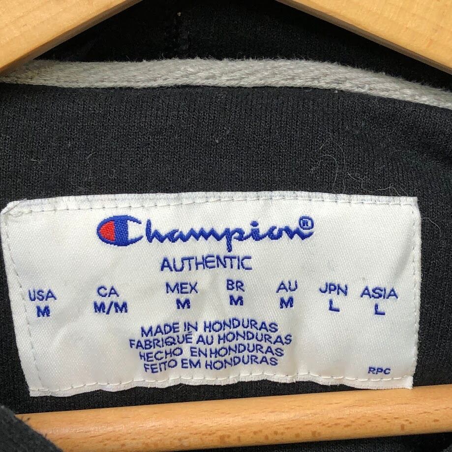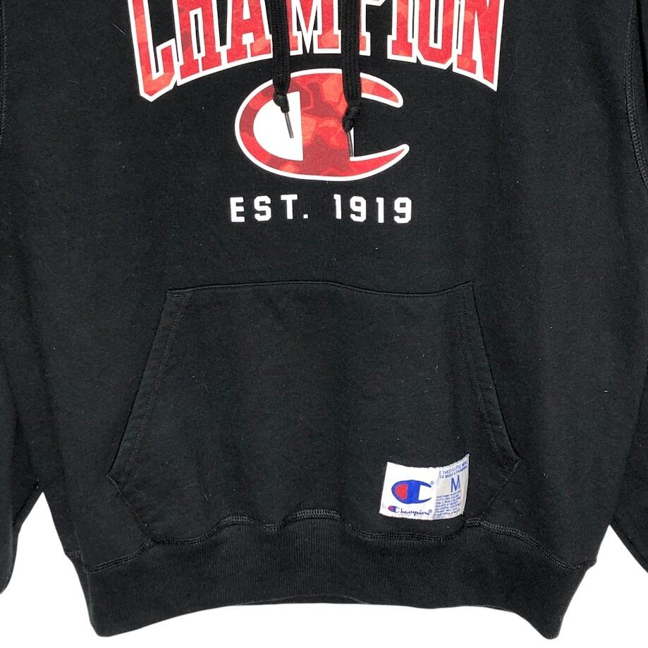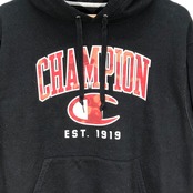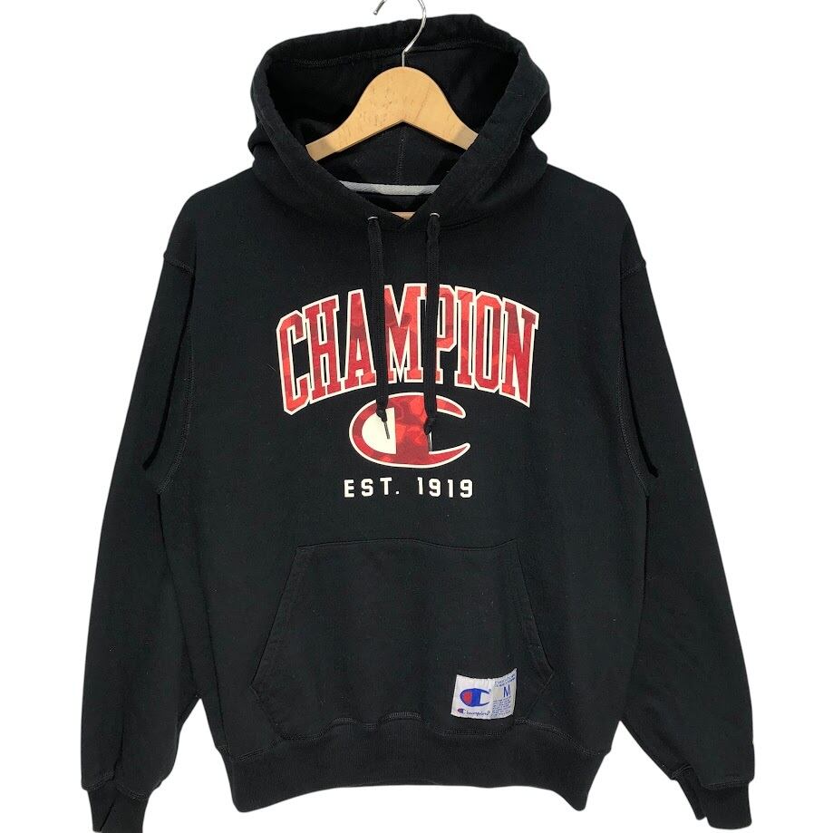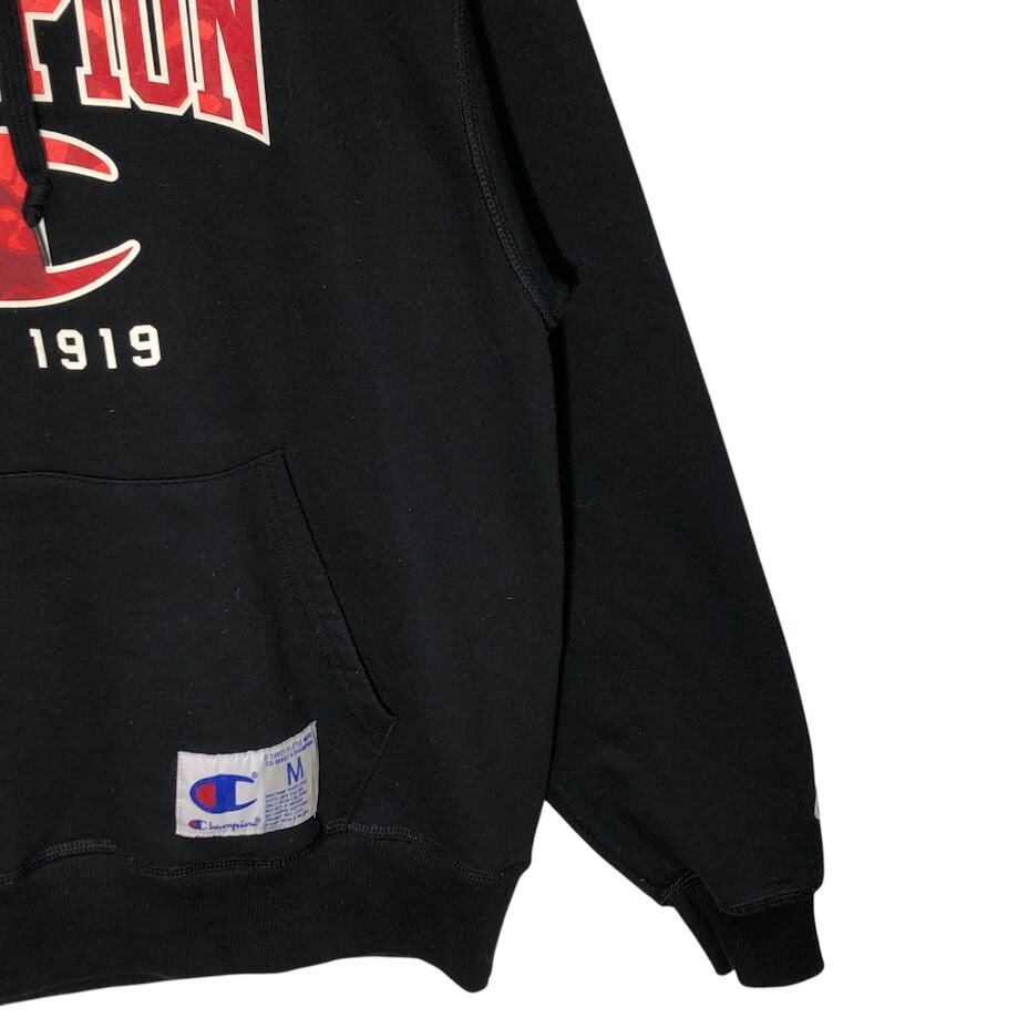 Champion /チャンピオン カレッジ風フォント EST-1919 パーカー プルオーバー フーディー 長袖 フロントプリント 袖刺繡 Honduras製 Mサイズ ブラック