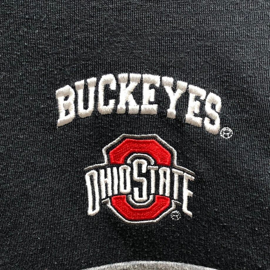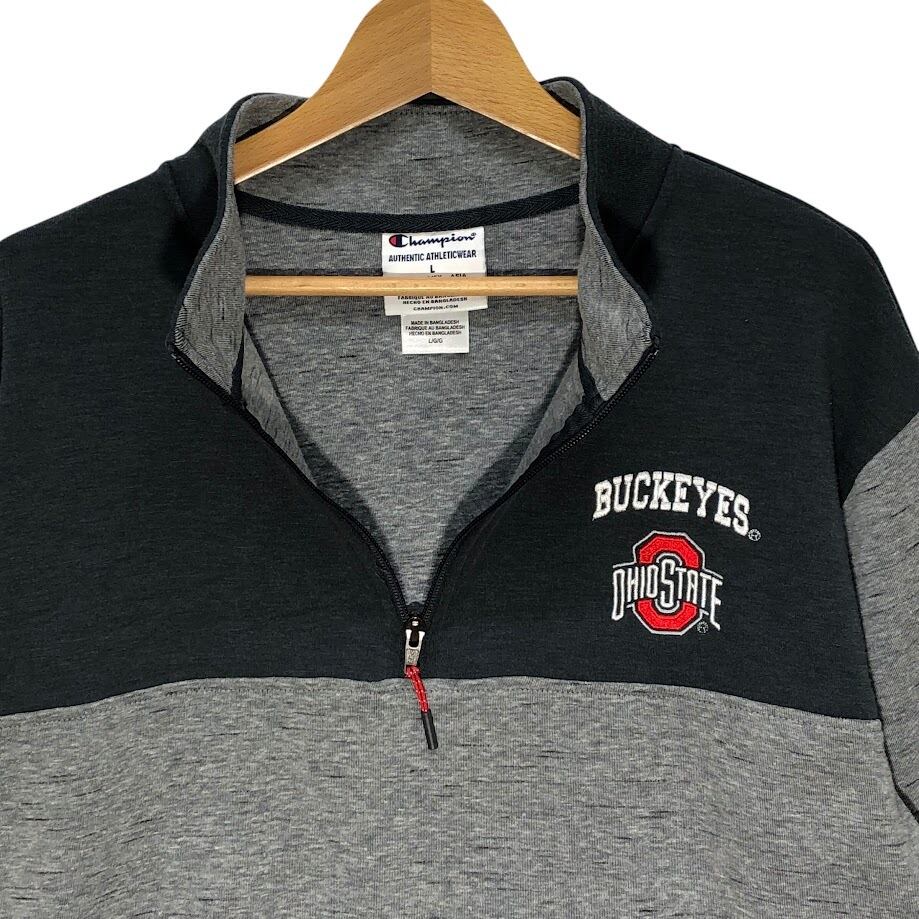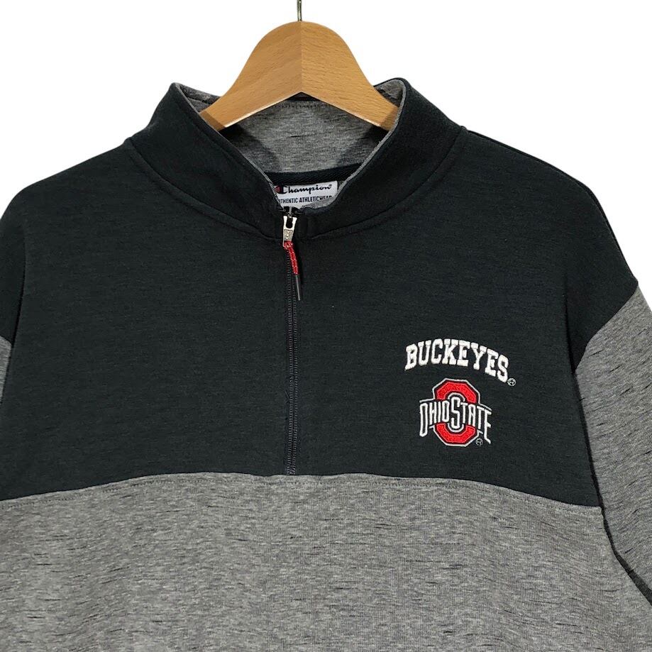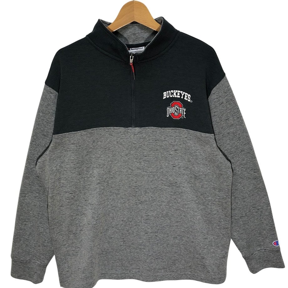 Champion /チャンピオン OHIO STATE BUCKEYES カレッジ スポーツチーム ハーフジップ スウェット トレーナー 長袖 袖プリント ワンポイント刺繡 オーバーサイズ Bangladesh製 Lサイズ グレー/ブラック