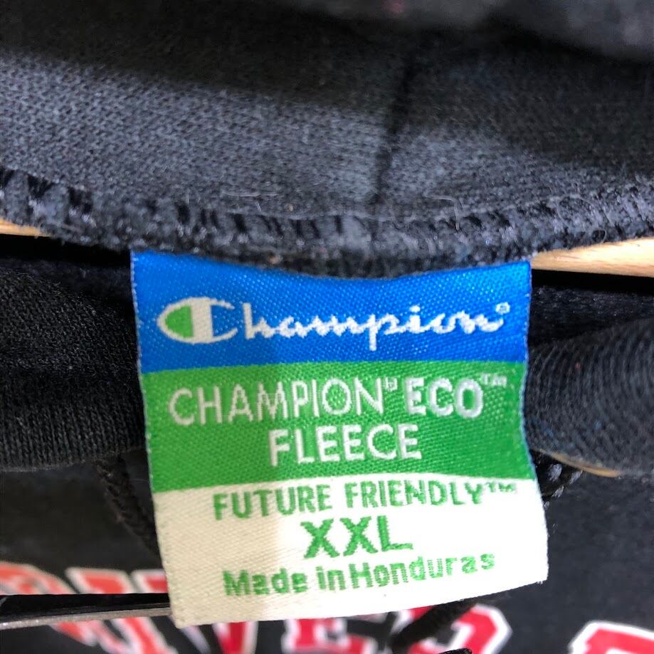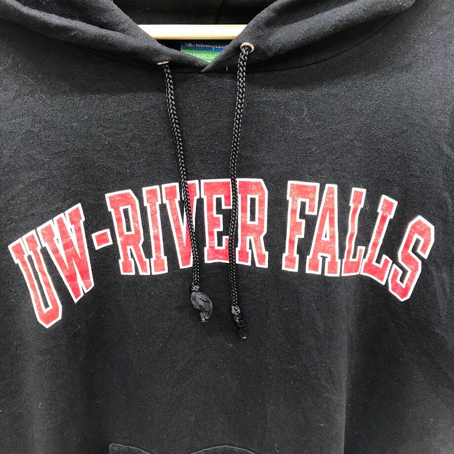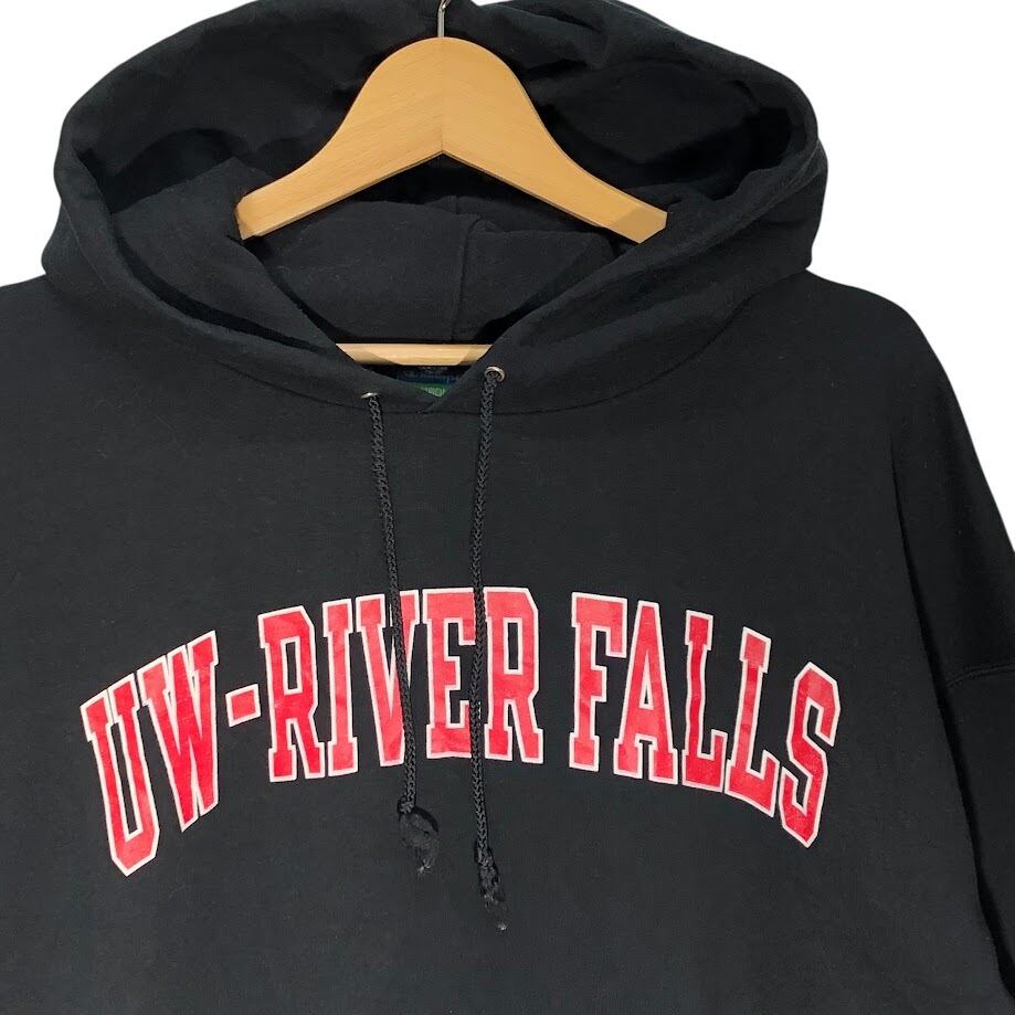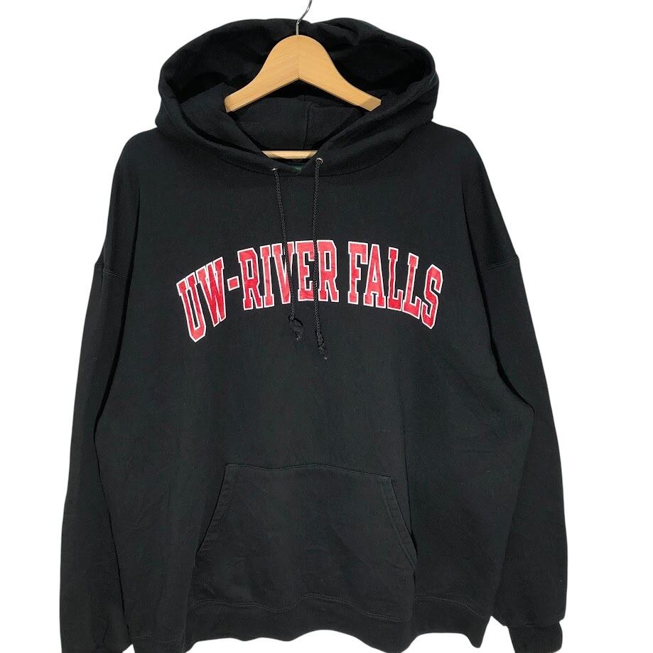 Champion /チャンピオン UW-RIVER FALLS カレッジプリント パーカー フーディー プルオーバー 長袖 フロントプリント 袖刺繡 オーバーサイズ ビッグシルエット Honduras製 XXLサイズ ブラック