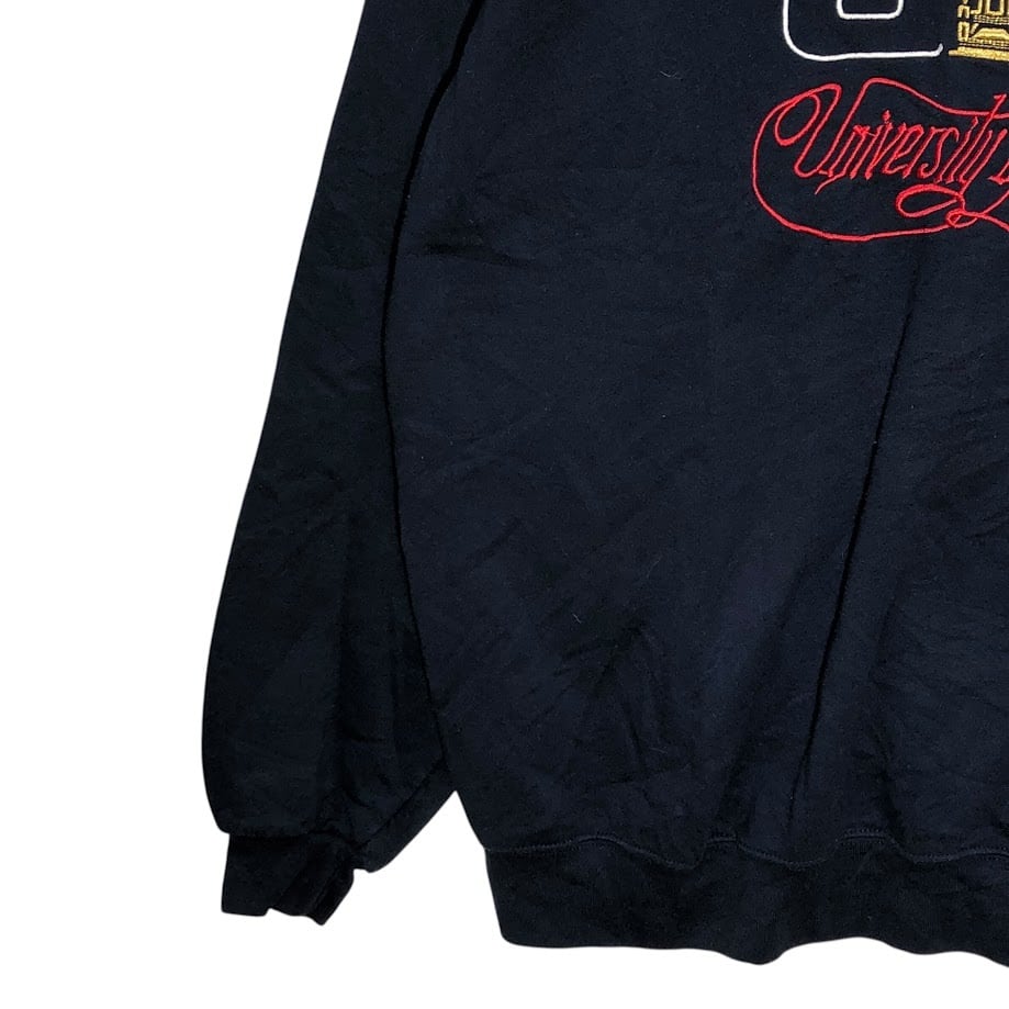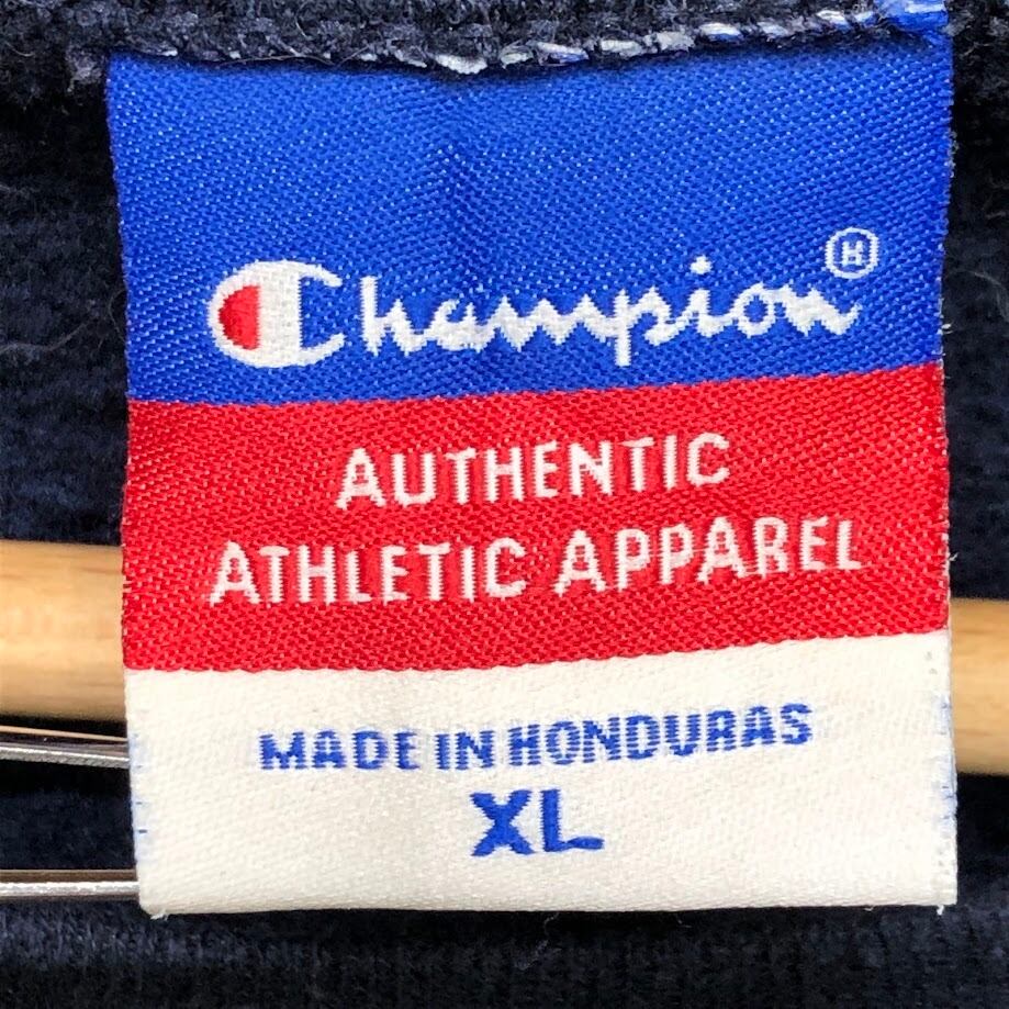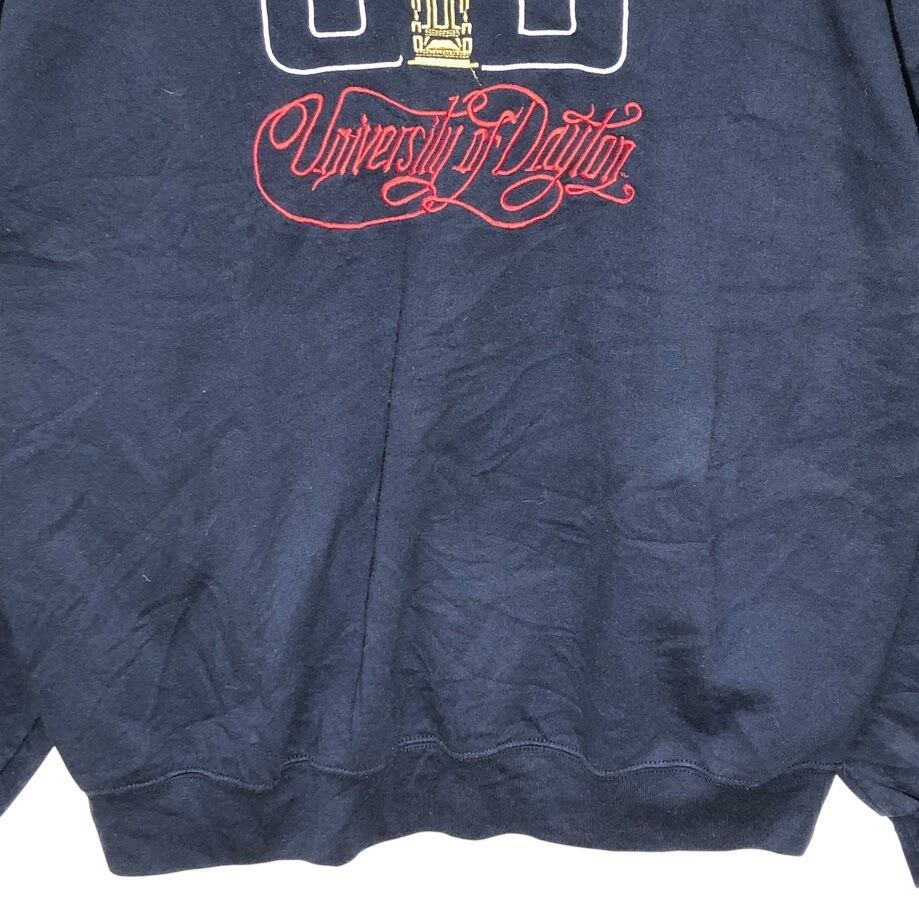 商品名:Champion /チャンピオン 00年代/00’s カレッジ刺繡 University of Dayton デイトン大学 スウェット トレーナー 長袖 フロント刺繡 袖刺繍 オーバーサイズ クルーネック Honduras製 XLサイズ ネイビー