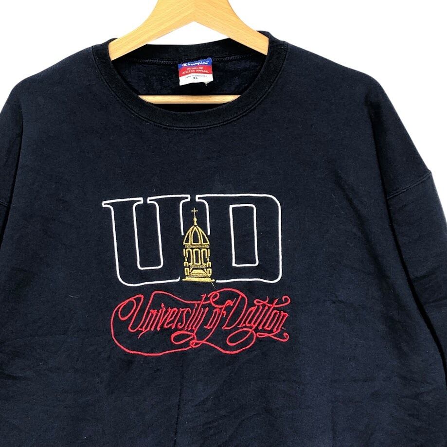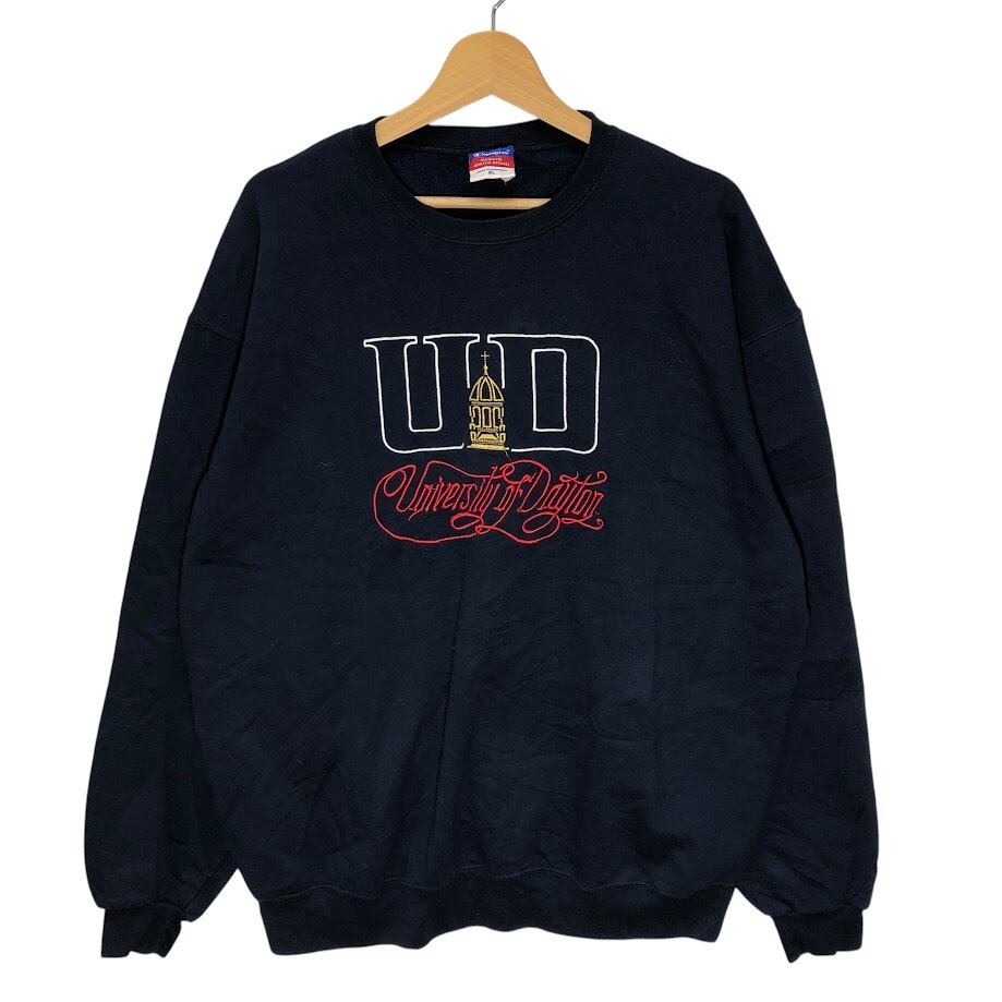 Champion /チャンピオン 00年代/00’s カレッジ刺繡 University of Dayton デイトン大学 スウェット トレーナー 長袖 フロント刺繡 袖刺繍 オーバーサイズ クルーネック Honduras製 XLサイズ ネイビー