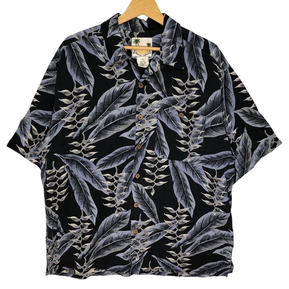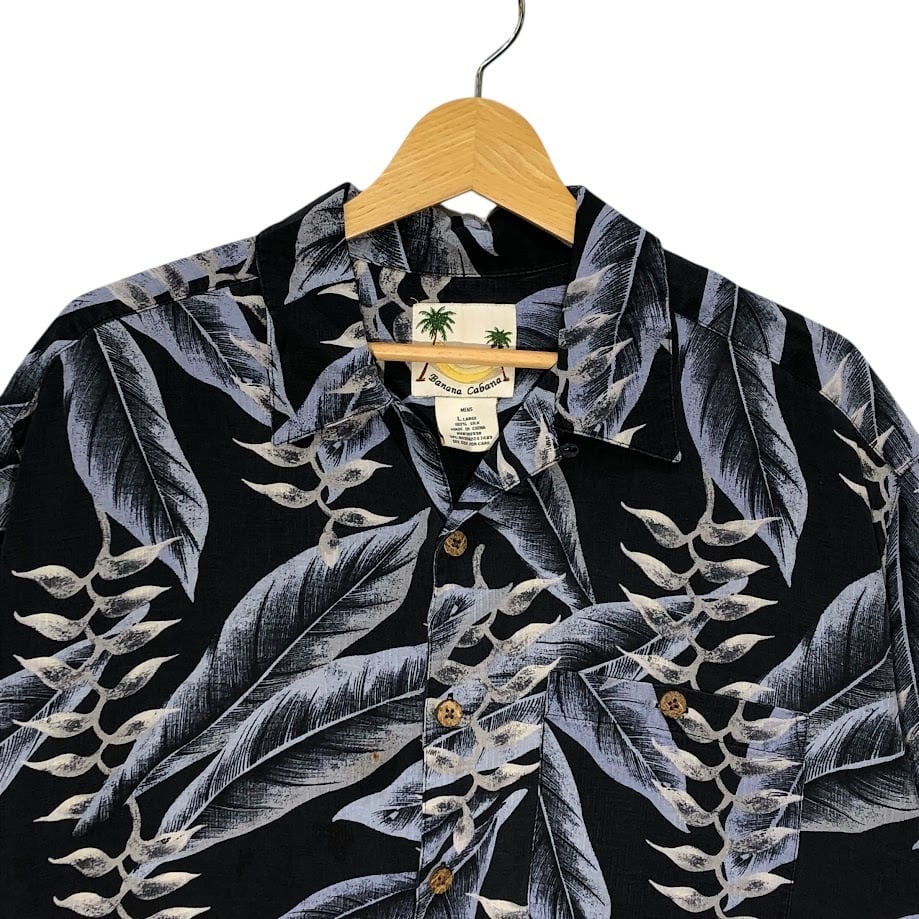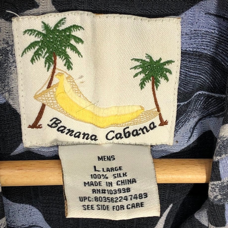 BANANA CABANA バナナカバナ シルク製 アロハシャツ 半袖シャツ China製 MEN'S Lサイズ ネイビー ブルー グレー