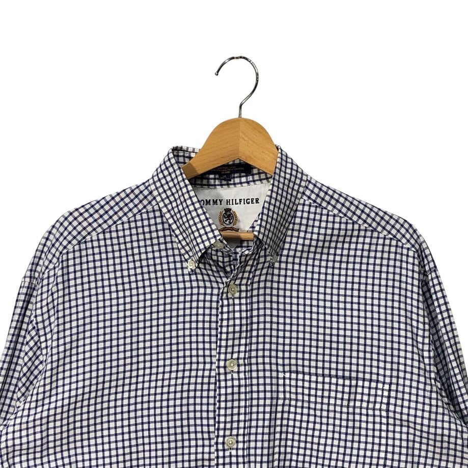 90's vintage 90年代 ヴィンテージ TOMMY HILFIGER トミーヒルフィガー 長袖シャツ オールドトミー ギムガムチェック ボタンダウン ビンテージ ライオン エンブレム 16 32-33サイズ ホワイト ブルー