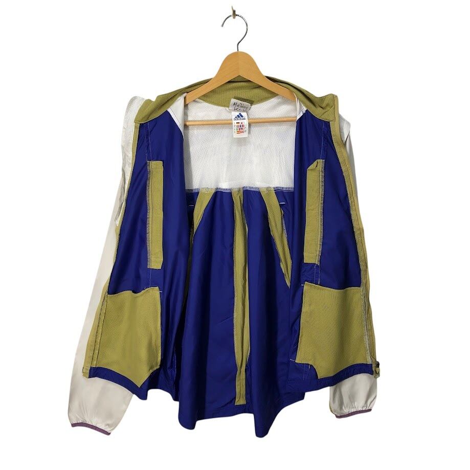 90's vintage 90年代 adidas 5国旗タグ アディダス ナイロンジャケット CLIMA SHELL ウインドブレーカー ライトアウター EQUIPMENT 2WAYドッキングジャケット 袖 着脱 CHINA製 Mサイズ パープル ホワイト