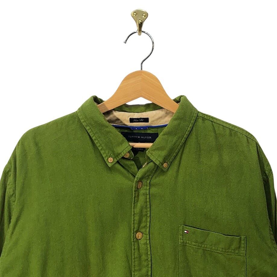00's vintage 00年代 ヴィンテージ TOMMY HILFIGER トミーヒルフィガー SlimFit コットン長袖シャツ 紺タグ MAURITIS製 XL/TGサイズ グリーン