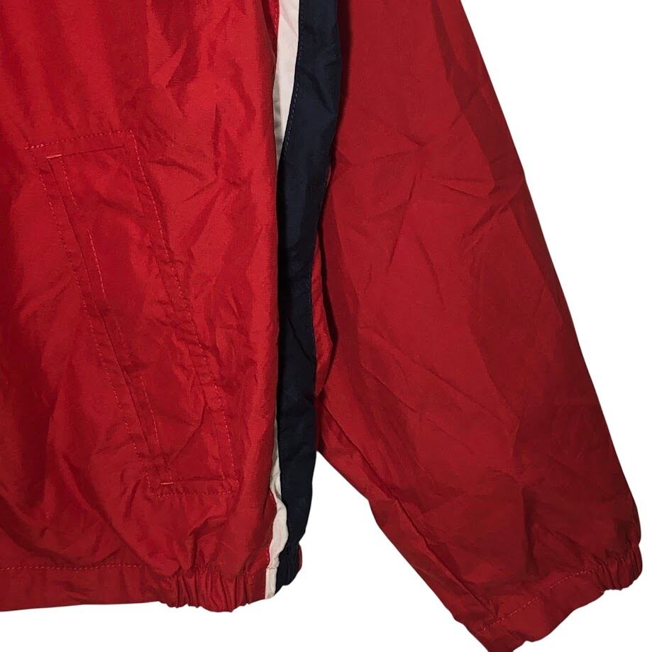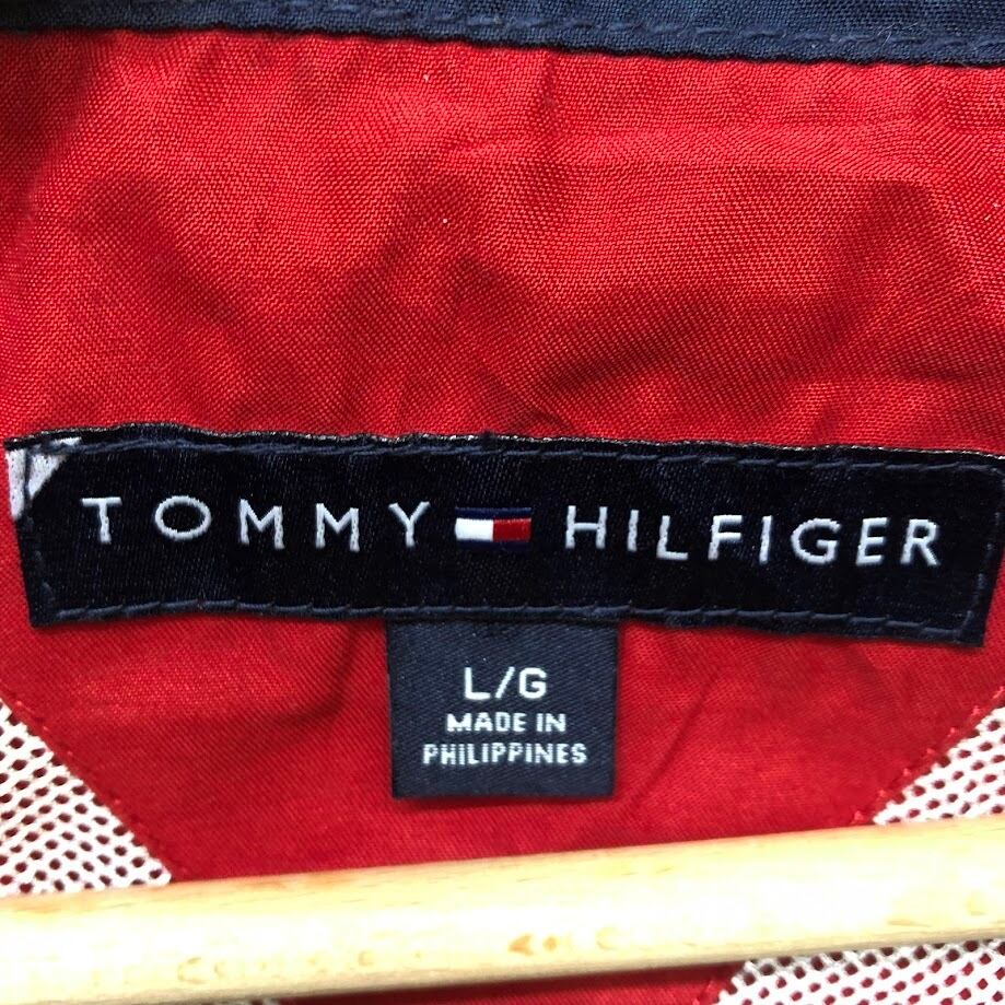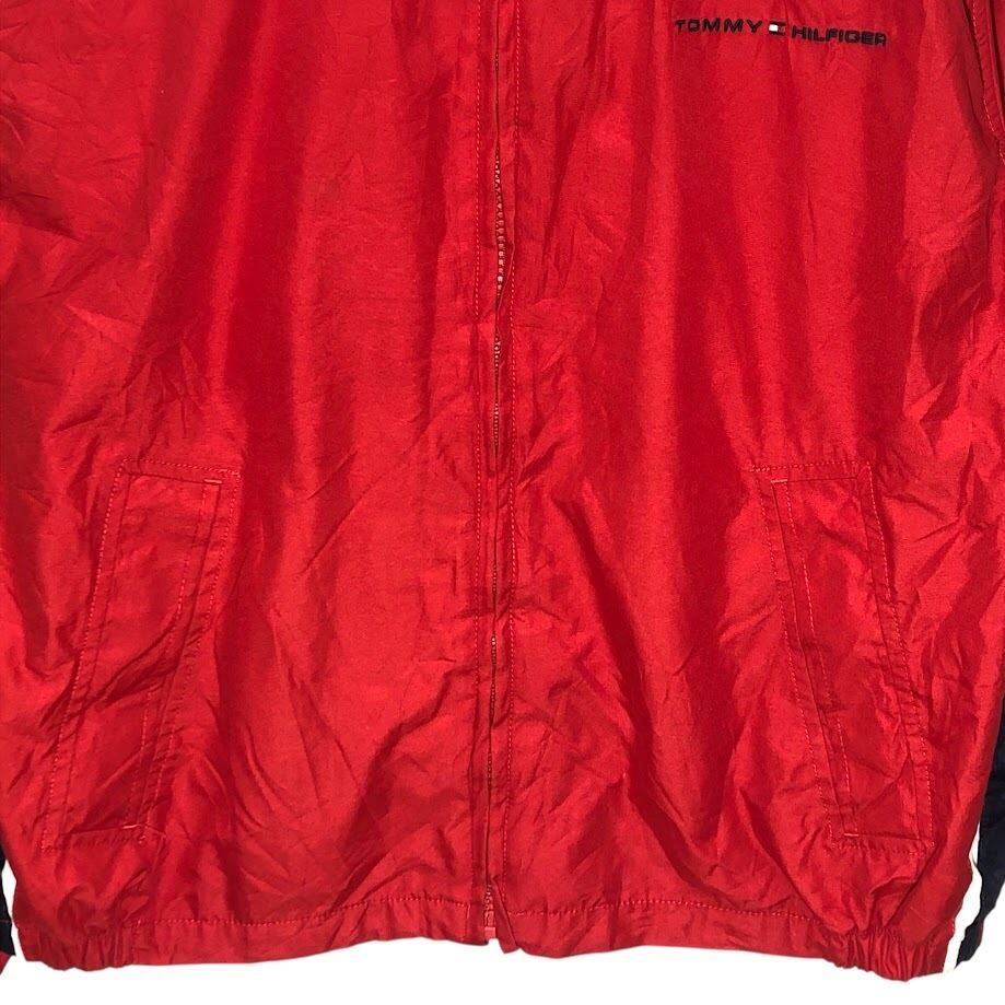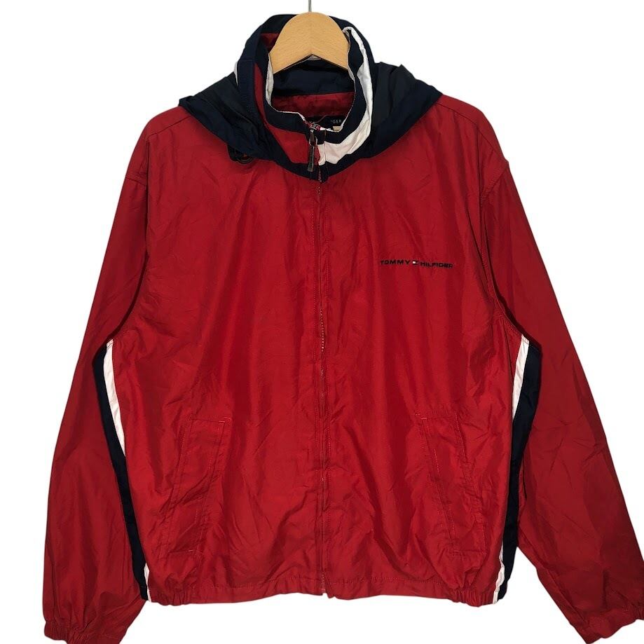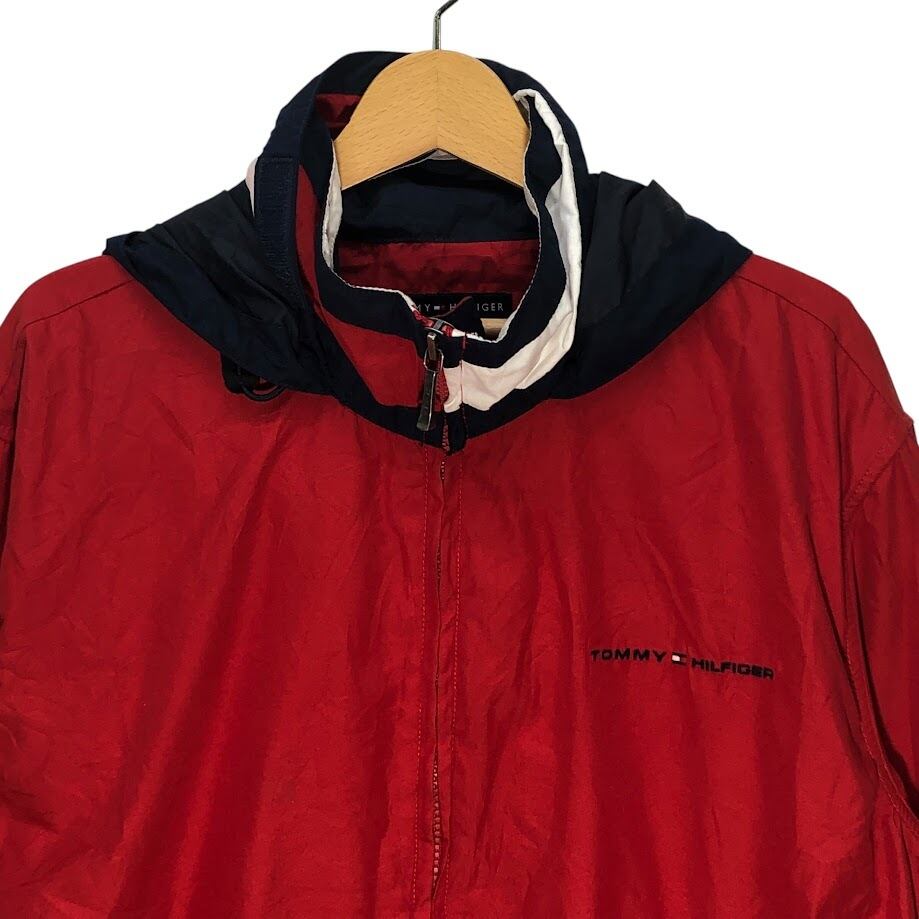 商品名:TOMMY HILFIGER トミーヒルフィガー 00年代/00’s フルジップ ジップアップ フード収納 ライトアウター ナイロンジャケット 長袖 ワンポイント刺繡 Philippines製 L/Gサイズ レッド