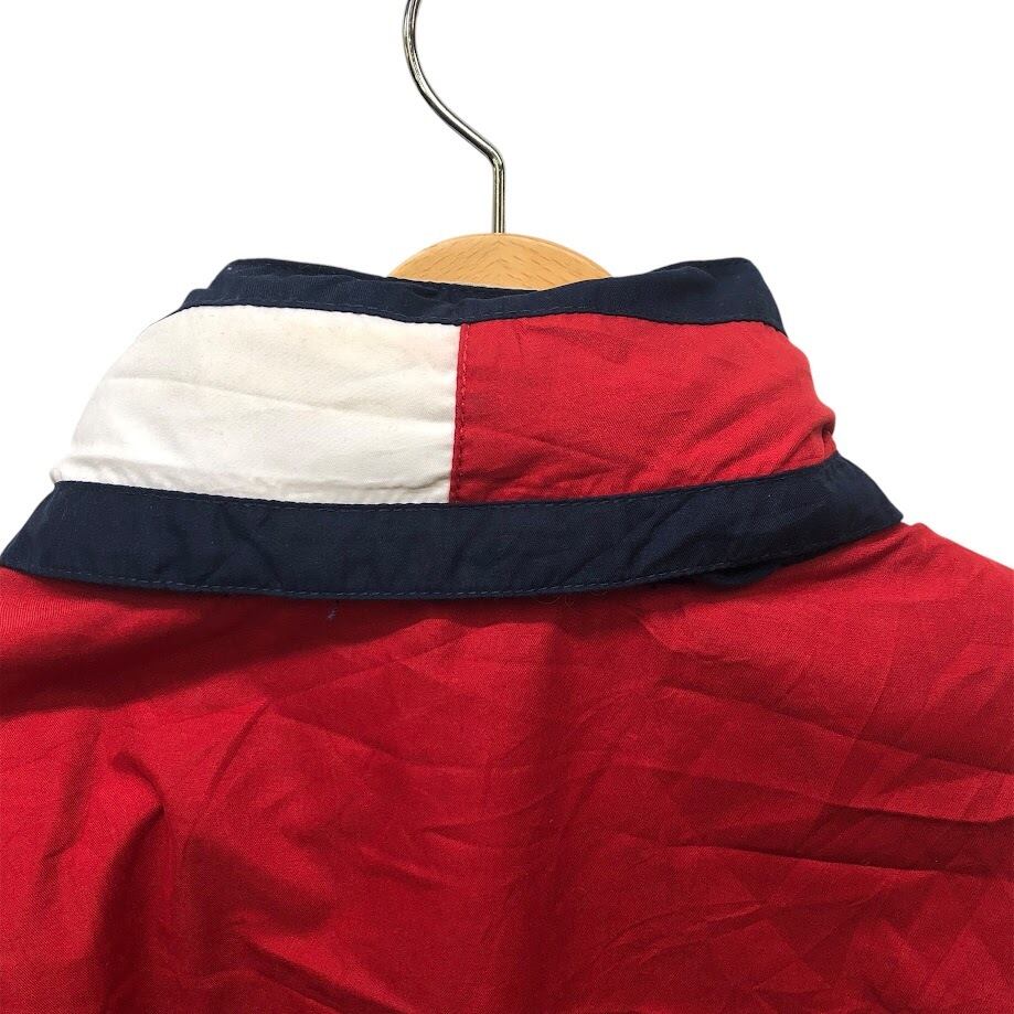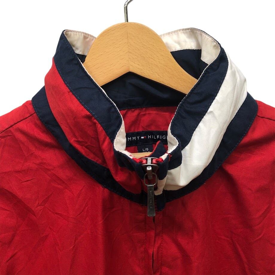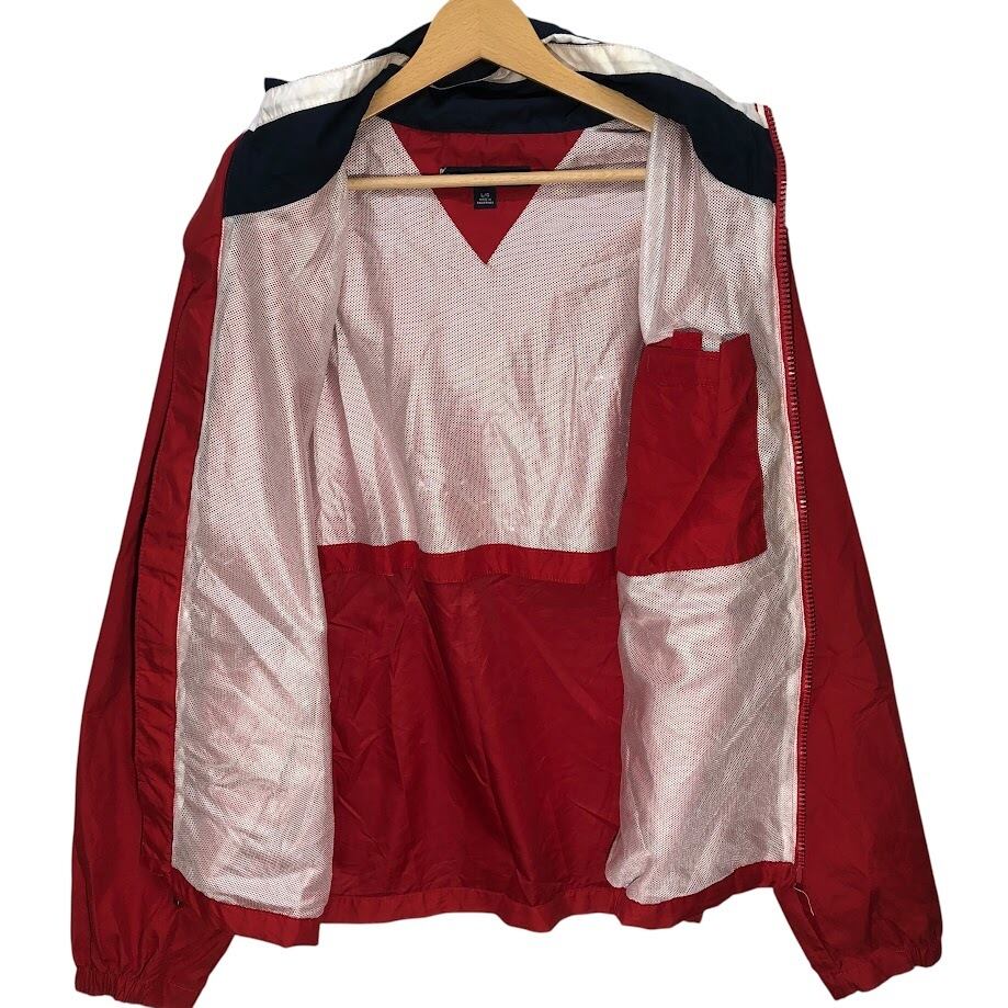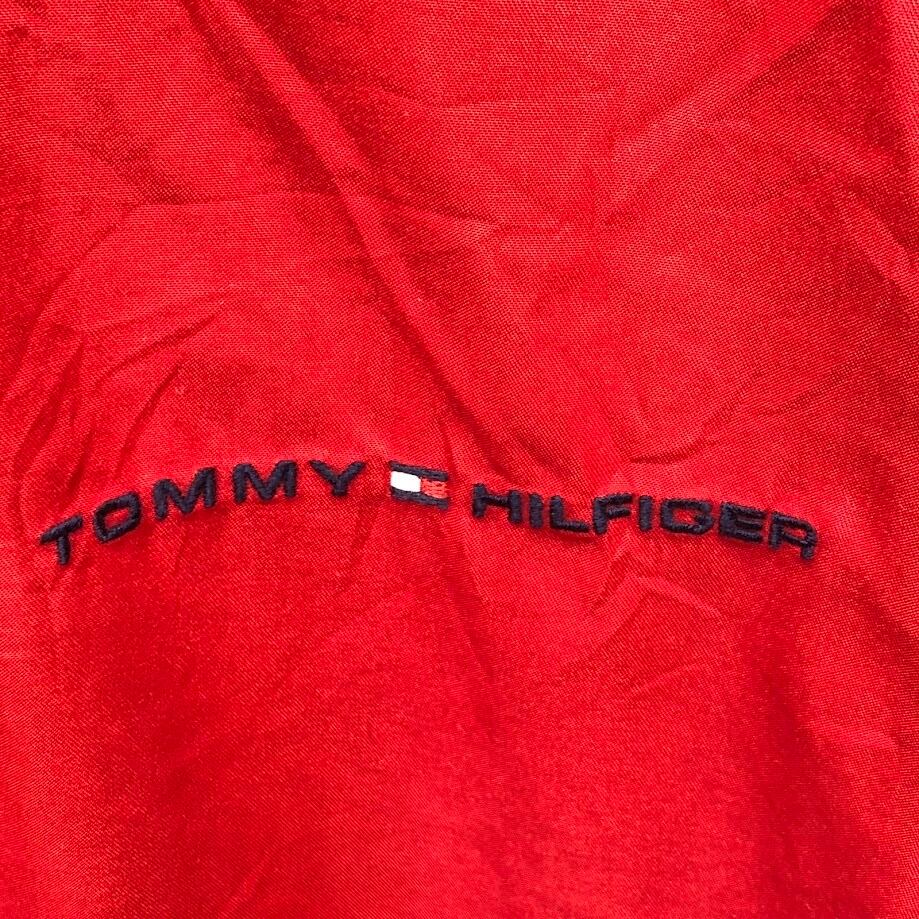 TOMMY HILFIGER トミーヒルフィガー 00年代/00’s フルジップ ジップアップ フード収納 ライトアウター ナイロンジャケット 長袖 ワンポイント刺繡 Philippines製 L/Gサイズ レッド