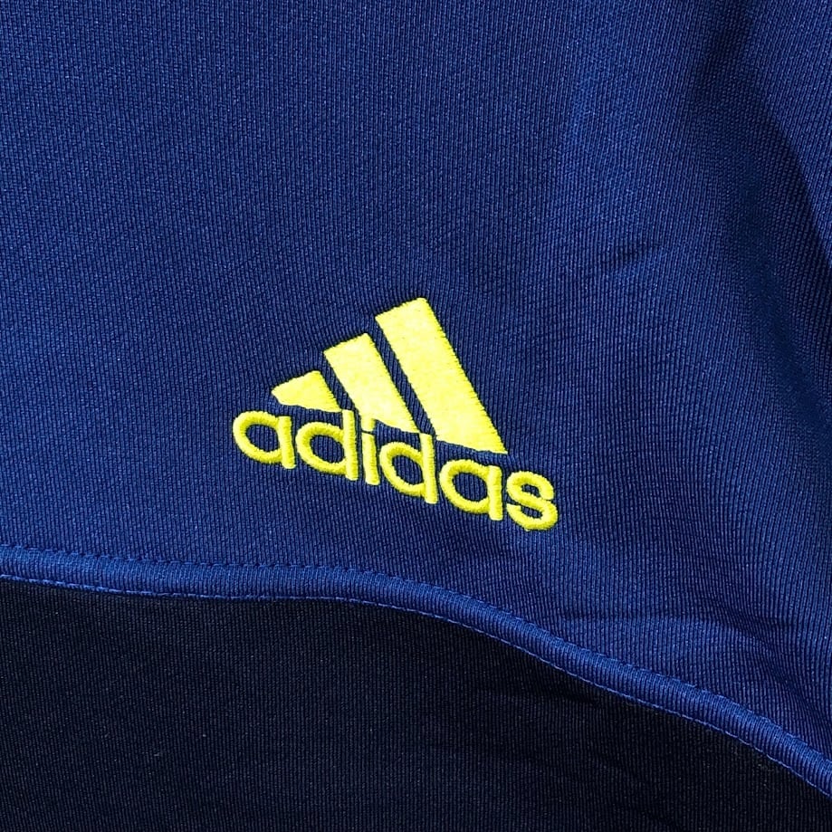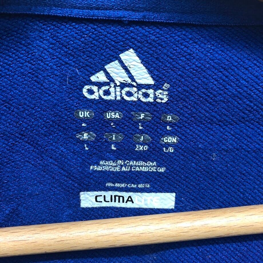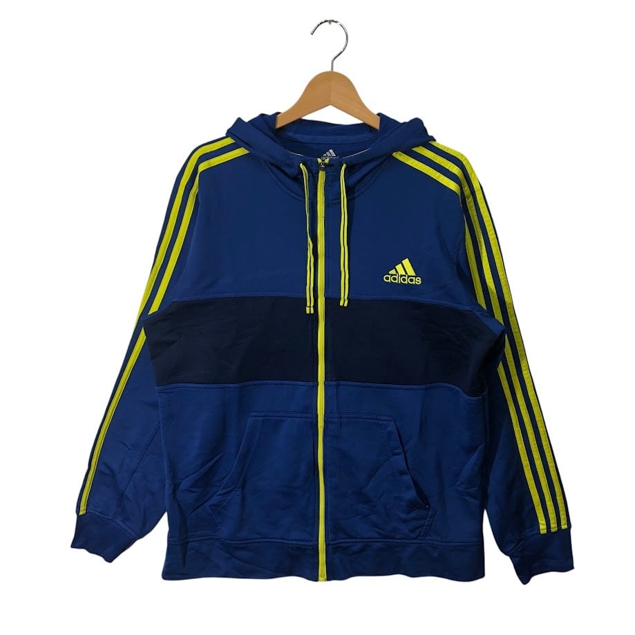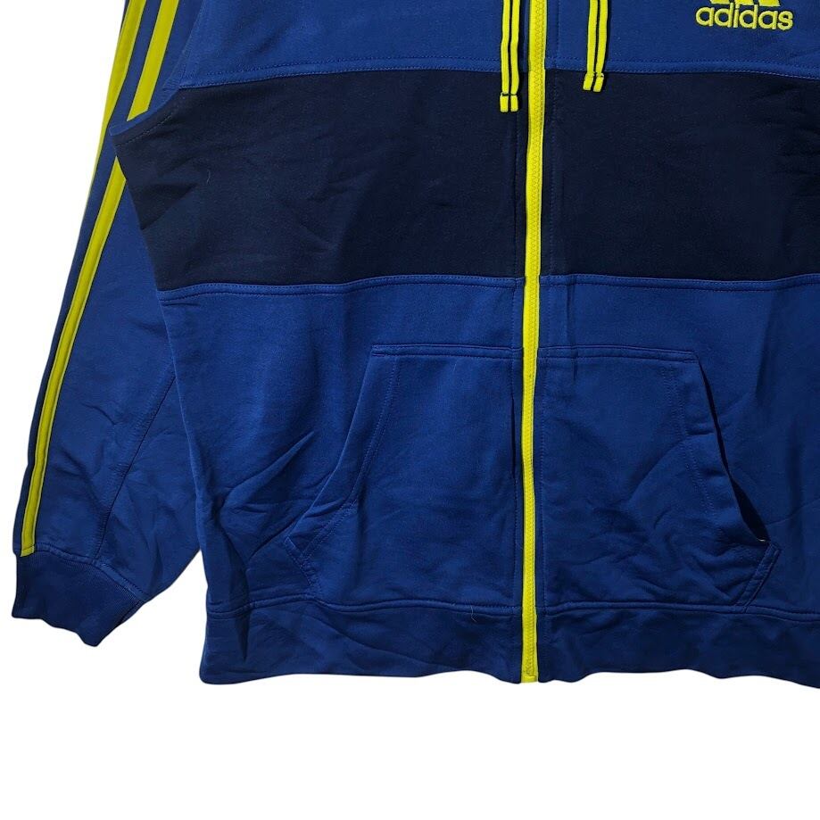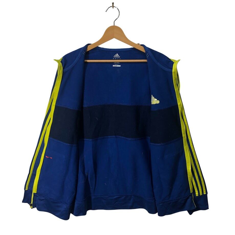 adidas CLIMALITE アディダス トラックジャケット ジャージ フード付き スリーライン ロゴ刺繍 カンボジア製 Lサイズ ブルー イエロー