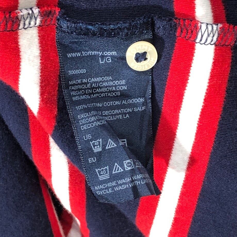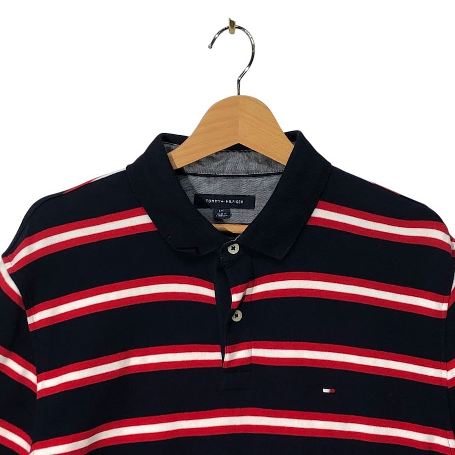 商品名:TOMMY HILFIGER トミーヒルフィガー 半袖シャツ ボタンダウンシャツ ボーダー柄 ワンポイントロゴ カンボジア製 Lサイズ レッド ネイビー ホワイト