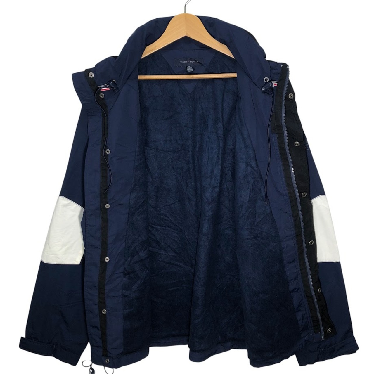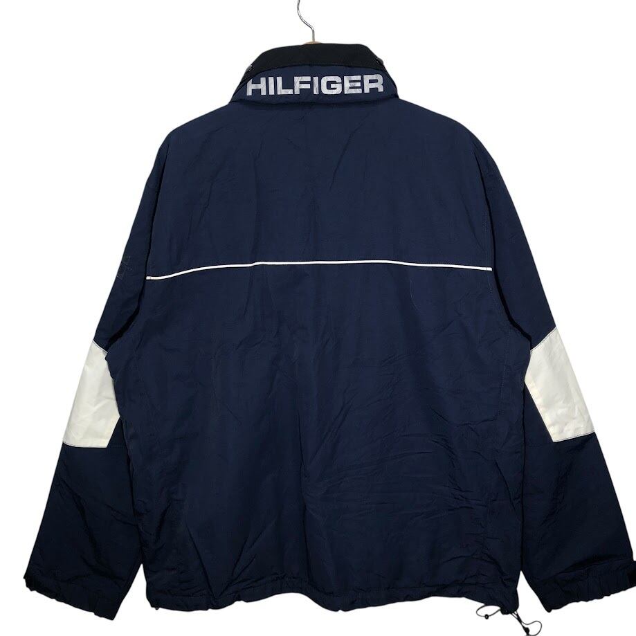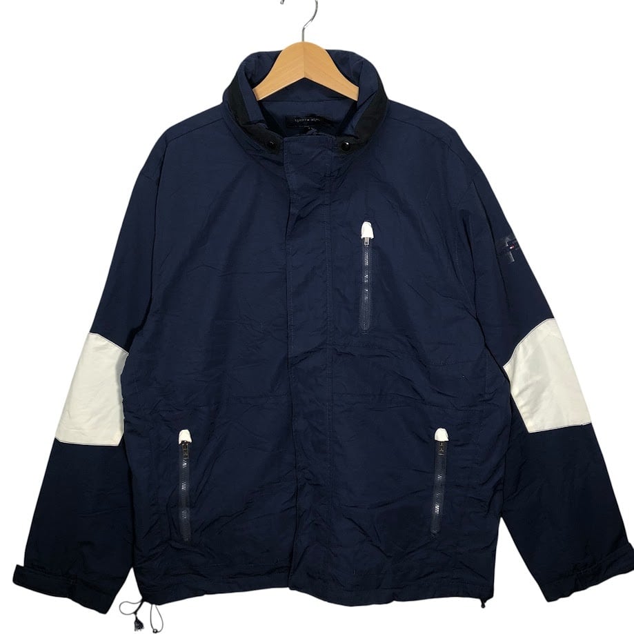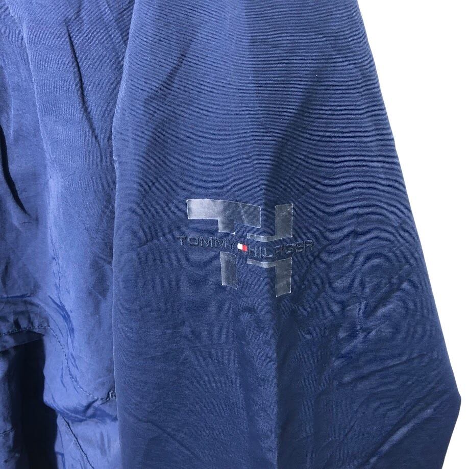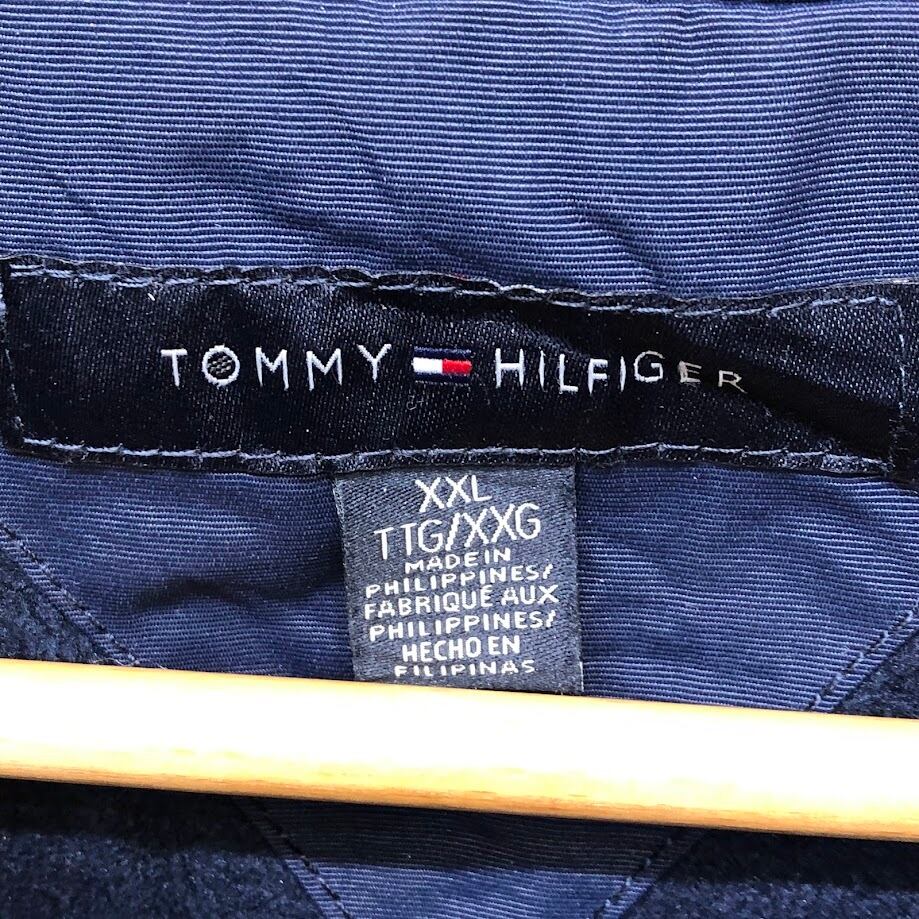 商品名:TOMMY HILFIGER/トミーヒルフィガー フリースライナー フード収納 アウター ナイロンジャケット ドローコード 袖刺繍 Philippines製 XXLサイズ ネイビー