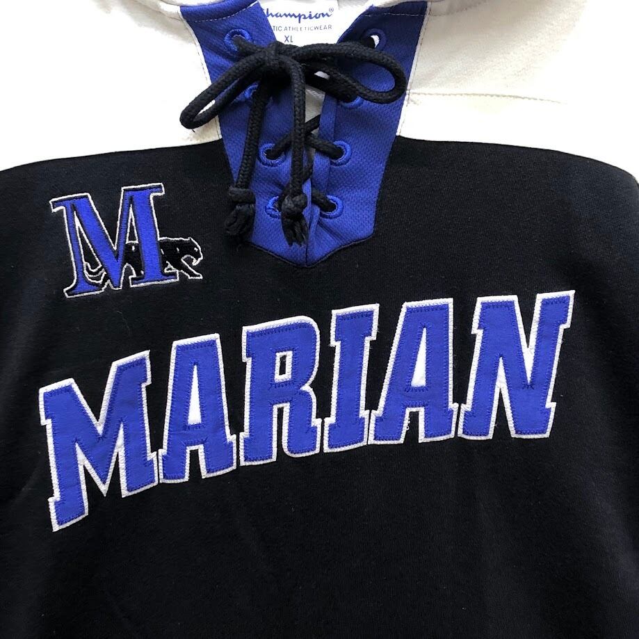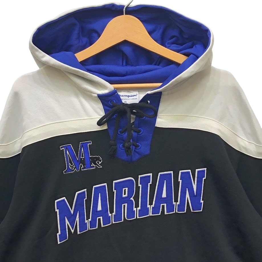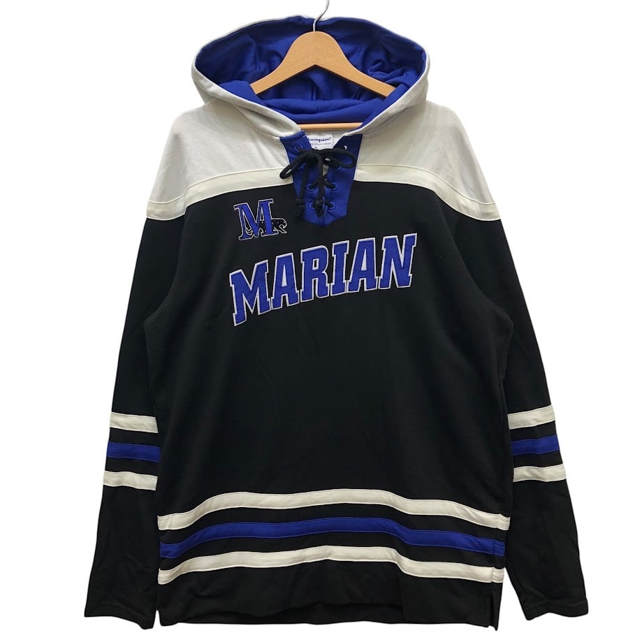 Champion /チャンピオン レースアップ MARIAN アイスホッケー チーム スポーツ カレッジ刺繍 パーカー フーディー プルオーバー 長袖 フロント刺繍 袖刺繡 ワンポイント刺繡 オーバーサイズ Pakistan製 XLサイズ ブラック