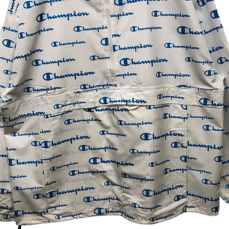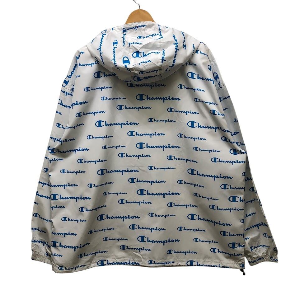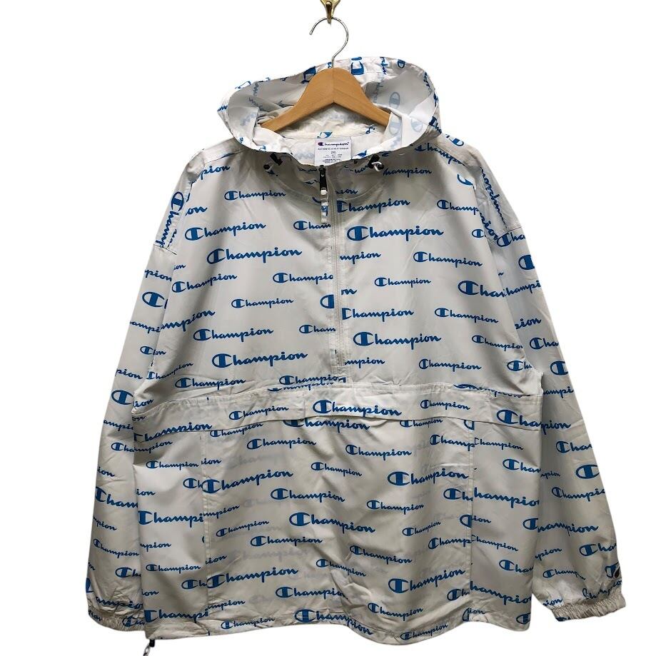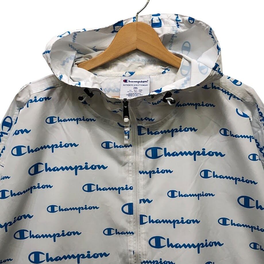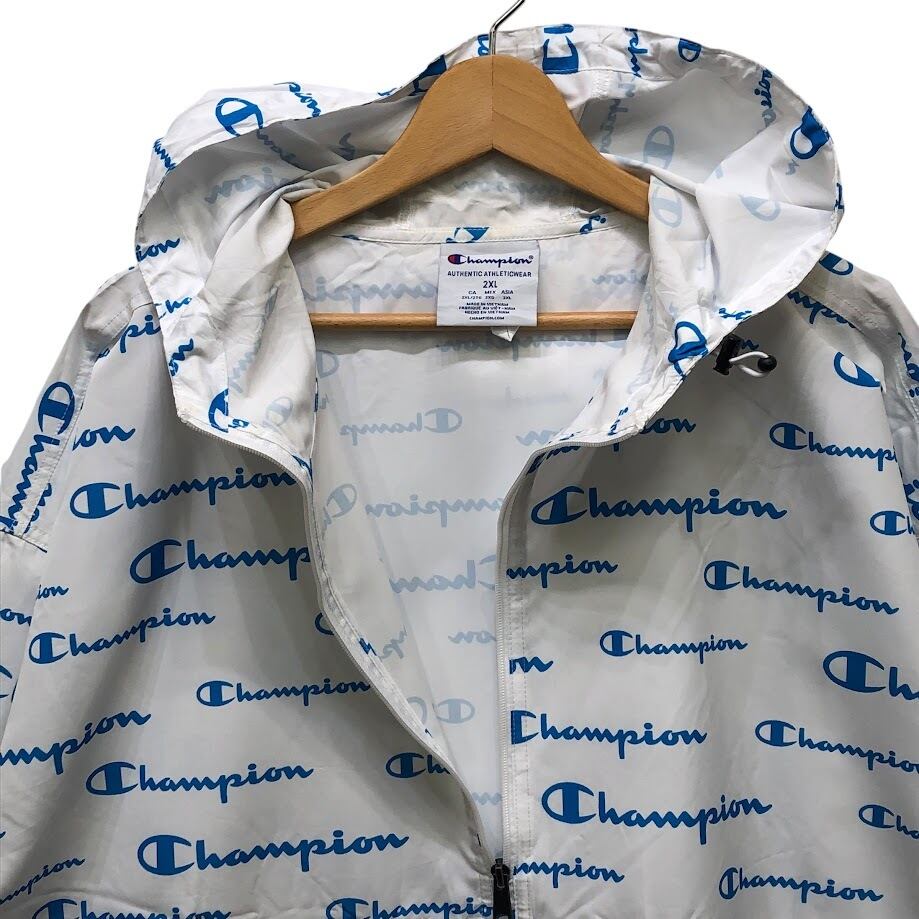 商品名:Champion チャンピオン ロゴプリント 総柄 ウインドブレーカー フーディー プルオーバー ナイロン 長袖 オーバーサイズ ビッグシルエット Vietnam製 2XLサイズ ホワイト