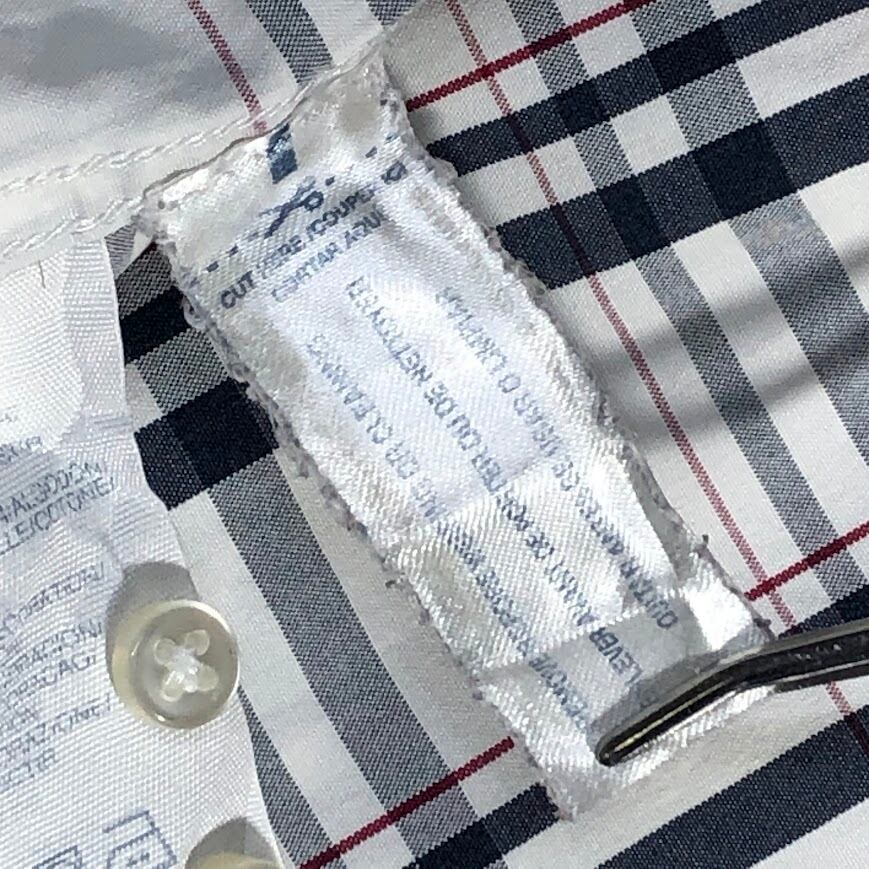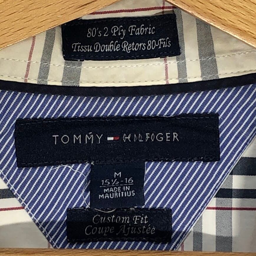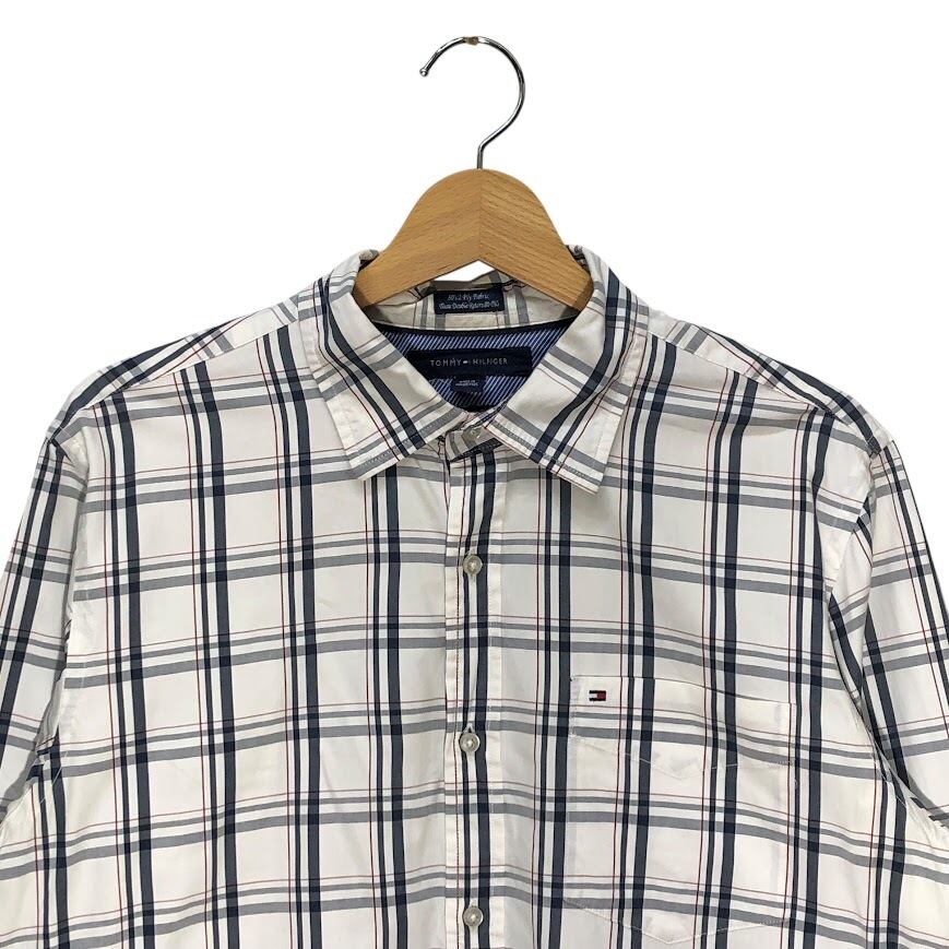 TOMMY HILFIGER トミーヒルフィガー チェック柄 Custum Fit 長袖シャツ ワンポイント刺繡 Mauritius製 15 1/2-16サイズ Mサイズ ホワイト ネイビー