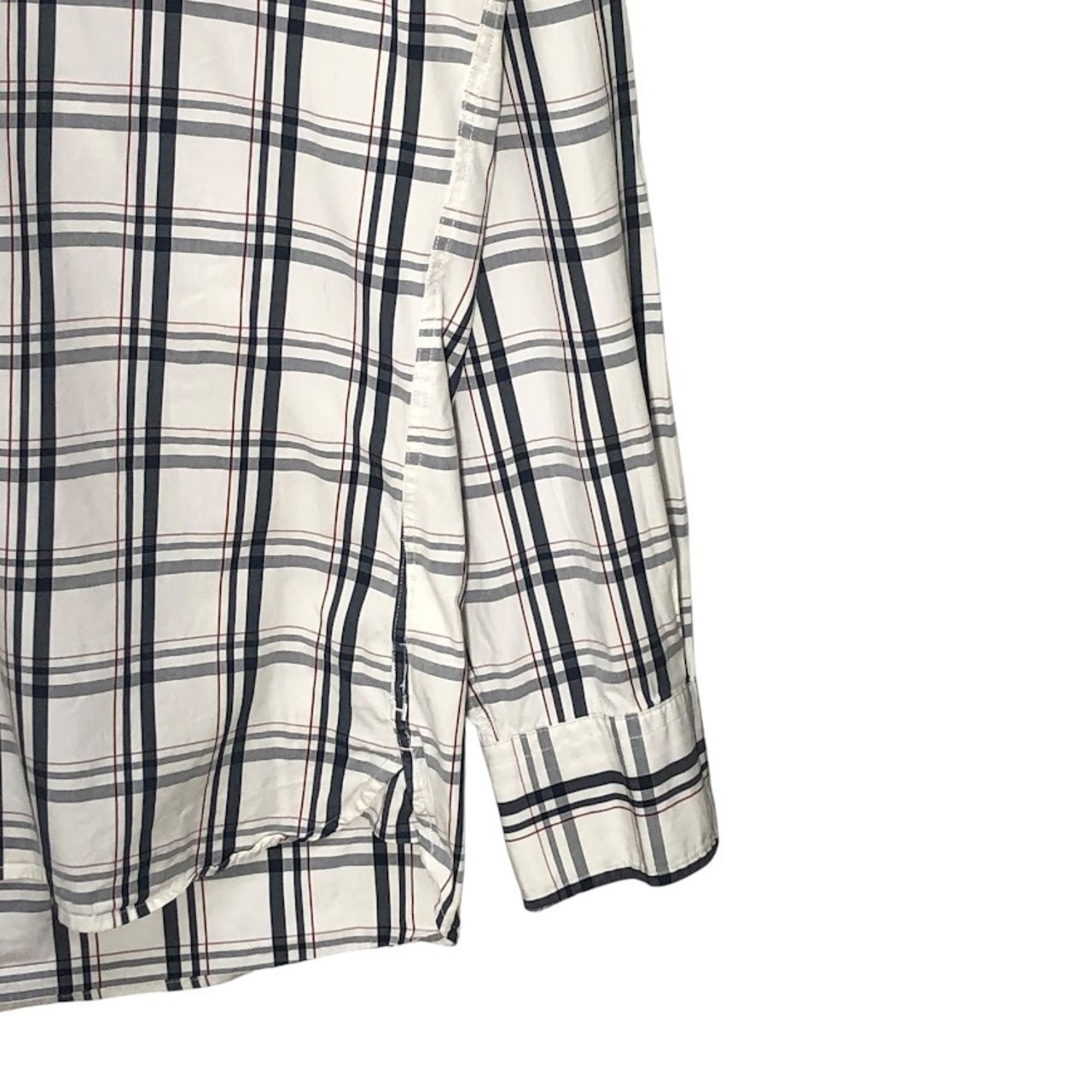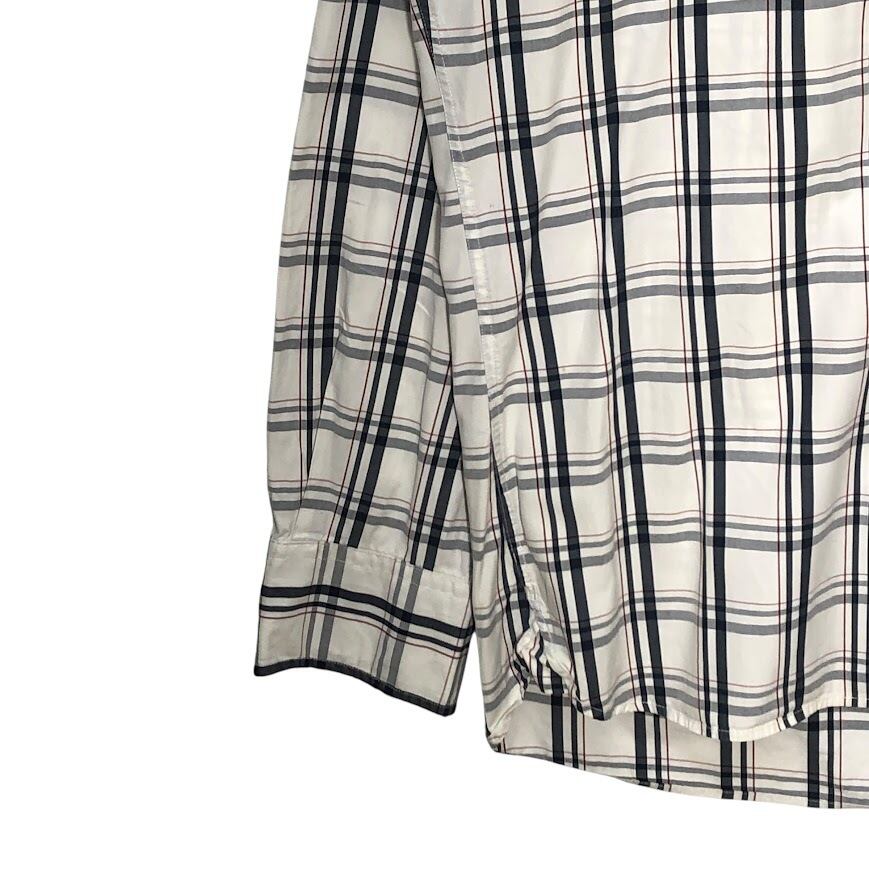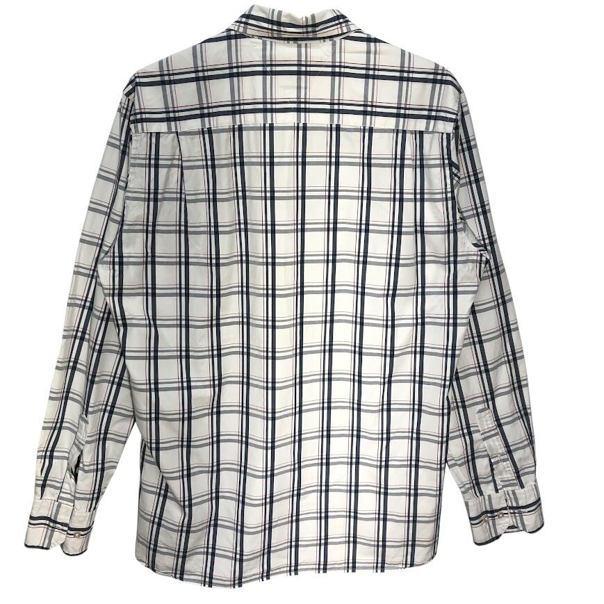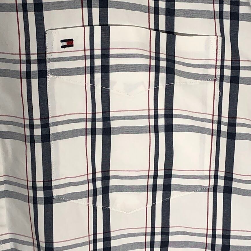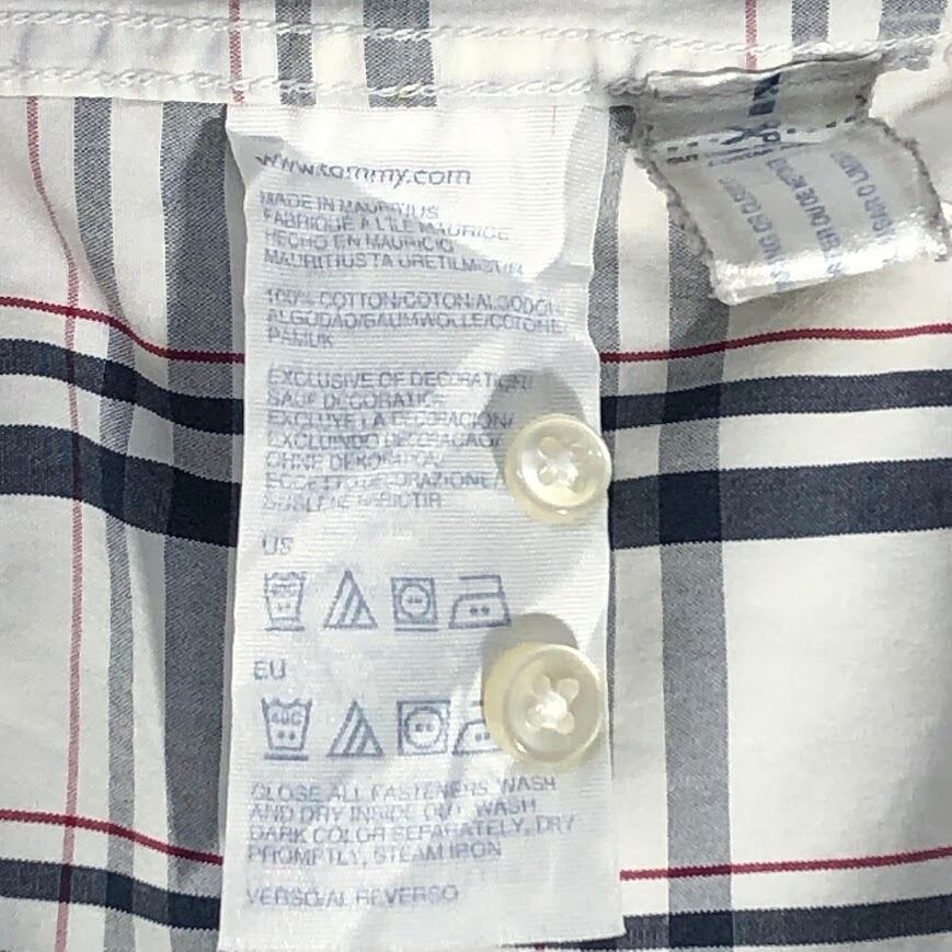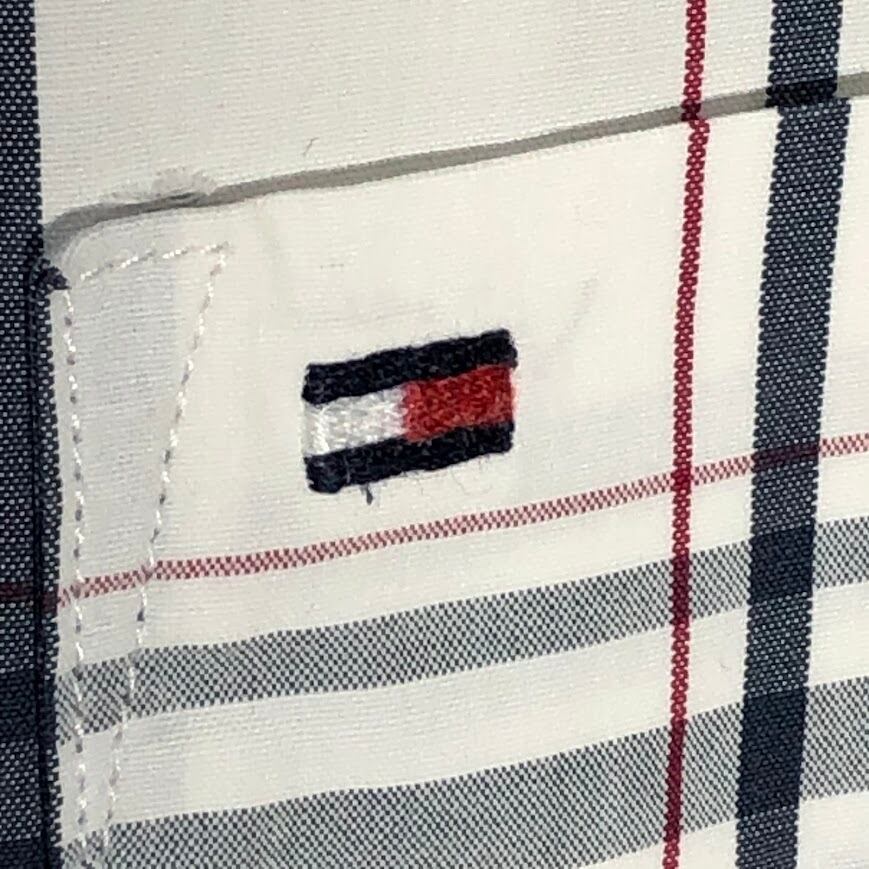 商品名:TOMMY HILFIGER トミーヒルフィガー チェック柄 Custum Fit 長袖シャツ ワンポイント刺繡 Mauritius製 15 1/2-16サイズ Mサイズ ホワイト ネイビー