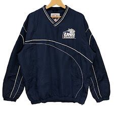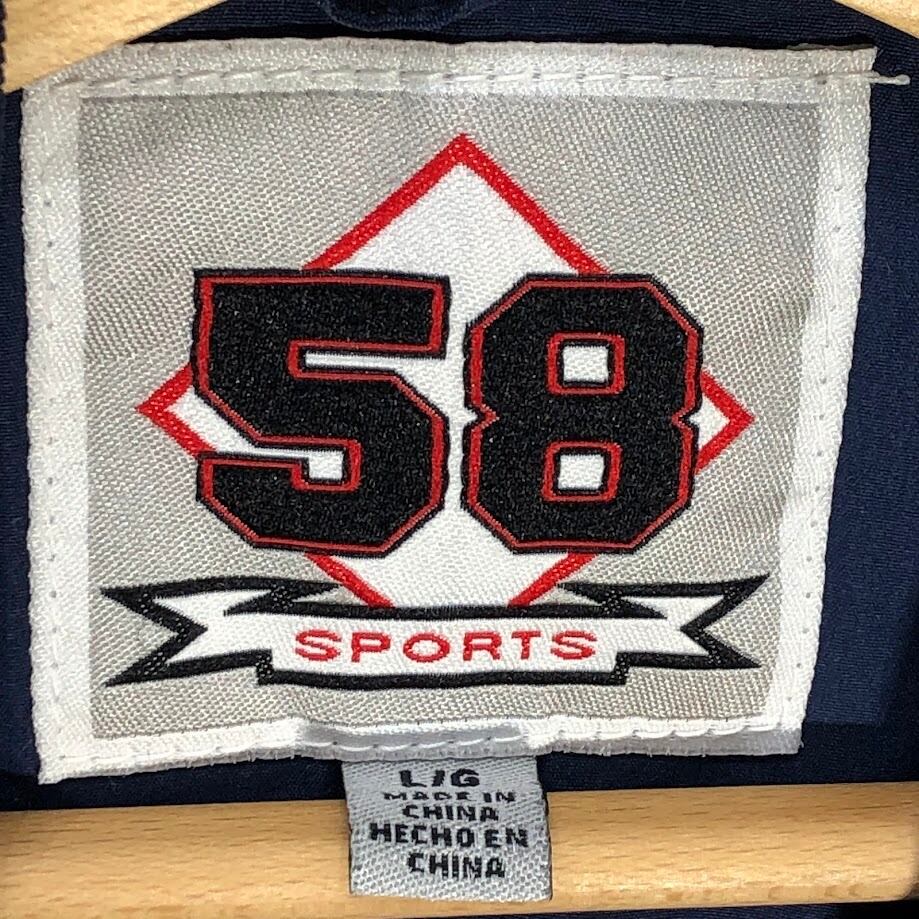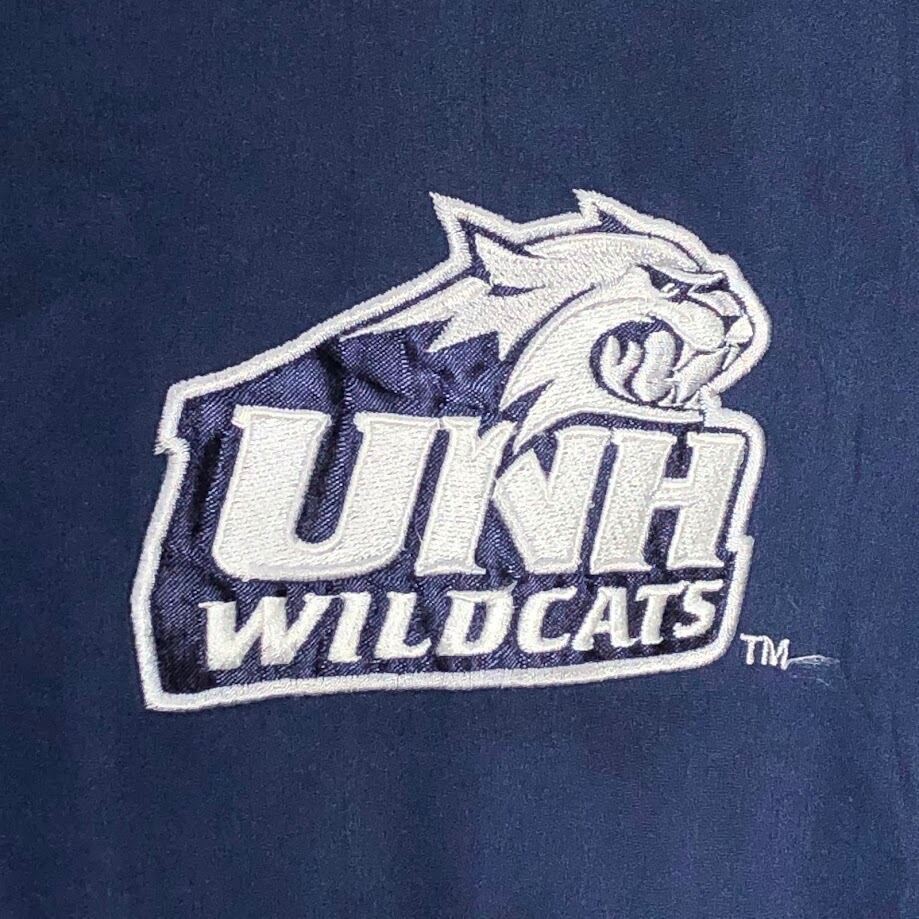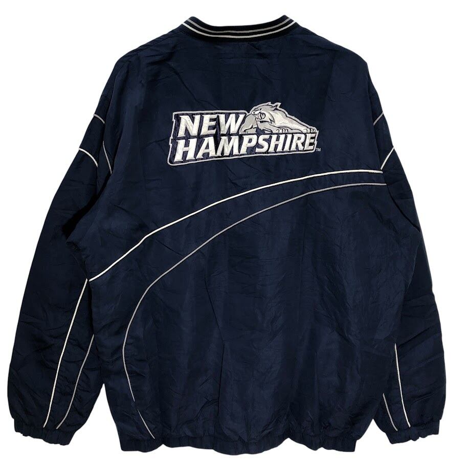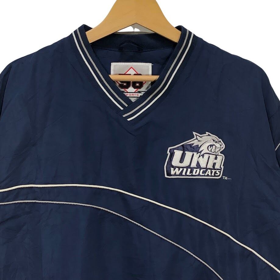 90's vintage 90年代 ヴィンテージ 58SPORTS ナイロンプルオーバーシャツ ニューハンプシャー大学 カレッジロゴ刺繡 裾ジップ フロント バック刺繡 オーバーサイズ Vネック China製 Lサイズ ネイビー